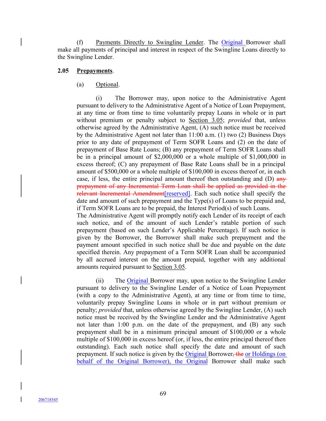 (f) Payments Directly to Swingline Lender. The Original Borrower shall make all payments of principal and interest in respect of the Swingline Loans directly to the Swingline Lender. 2.05 Prepayments. (a) Optional. (i) The Borrower may, upon notice to the Administrative Agent pursuant to delivery to the Administrative Agent of a Notice of Loan Prepayment, at any time or from time to time voluntarily prepay Loans in whole or in part without premium or penalty subject to Section 3.05; provided that, unless otherwise agreed by the Administrative Agent, (A) such notice must be received by the Administrative Agent not later than 11:00 a.m. (1) two (2) Business Days prior to any date of prepayment of Term SOFR Loans and (2) on the date of prepayment of Base Rate Loans; (B) any prepayment of Term SOFR Loans shall be in a principal amount of $2,000,000 or a whole multiple of $1,000,000 in excess thereof; (C) any prepayment of Base Rate Loans shall be in a principal amount of $500,000 or a whole multiple of $100,000 in excess thereof or, in each case, if less, the entire principal amount thereof then outstanding and (D) any prepayment of any Incremental Term Loan shall be applied as provided in the relevant Incremental Amendment[reserved]. Each such notice shall specify the date and amount of such prepayment and the Type(s) of Loans to be prepaid and, if Term SOFR Loans are to be prepaid, the Interest Period(s) of such Loans. The Administrative Agent will promptly notify each Lender of its receipt of each such notice, and of the amount of such Lender’s ratable portion of such prepayment (based on such Lender’s Applicable Percentage). If such notice is given by the Borrower, the Borrower shall make such prepayment and the payment amount specified in such notice shall be due and payable on the date specified therein. Any prepayment of a Term SOFR Loan shall be accompanied by all accrued interest on the amount prepaid, together with any additional amounts required pursuant to Section 3.05. (ii) The Original Borrower may, upon notice to the Swingline Lender pursuant to delivery to the Swingline Lender of a Notice of Loan Prepayment (with a copy to the Administrative Agent), at any time or from time to time, voluntarily prepay Swingline Loans in whole or in part without premium or penalty; provided that, unless otherwise agreed by the Swingline Lender, (A) such notice must be received by the Swingline Lender and the Administrative Agent not later than 1:00 p.m. on the date of the prepayment, and (B) any such prepayment shall be in a minimum principal amount of $100,000 or a whole multiple of $100,000 in excess hereof (or, if less, the entire principal thereof then outstanding). Each such notice shall specify the date and amount of such prepayment. If such notice is given by the Original Borrower, the or Holdings (on behalf of the Original Borrower), the Original Borrower shall make such 69 206718545