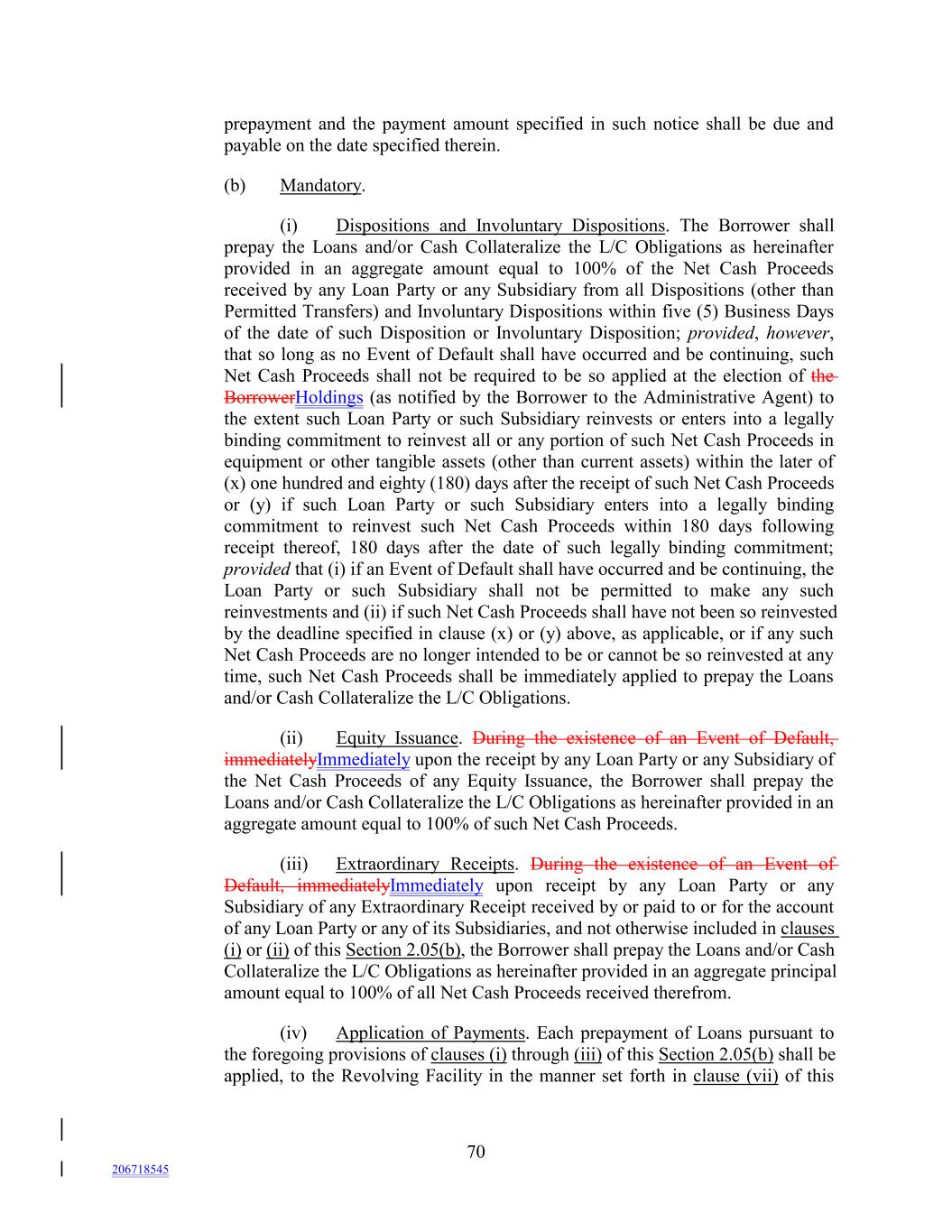 prepayment and the payment amount specified in such notice shall be due and payable on the date specified therein. (b) Mandatory. (i) Dispositions and Involuntary Dispositions. The Borrower shall prepay the Loans and/or Cash Collateralize the L/C Obligations as hereinafter provided in an aggregate amount equal to 100% of the Net Cash Proceeds received by any Loan Party or any Subsidiary from all Dispositions (other than Permitted Transfers) and Involuntary Dispositions within five (5) Business Days of the date of such Disposition or Involuntary Disposition; provided, however, that so long as no Event of Default shall have occurred and be continuing, such Net Cash Proceeds shall not be required to be so applied at the election of the BorrowerHoldings (as notified by the Borrower to the Administrative Agent) to the extent such Loan Party or such Subsidiary reinvests or enters into a legally binding commitment to reinvest all or any portion of such Net Cash Proceeds in equipment or other tangible assets (other than current assets) within the later of (x) one hundred and eighty (180) days after the receipt of such Net Cash Proceeds or (y) if such Loan Party or such Subsidiary enters into a legally binding commitment to reinvest such Net Cash Proceeds within 180 days following receipt thereof, 180 days after the date of such legally binding commitment; provided that (i) if an Event of Default shall have occurred and be continuing, the Loan Party or such Subsidiary shall not be permitted to make any such reinvestments and (ii) if such Net Cash Proceeds shall have not been so reinvested by the deadline specified in clause (x) or (y) above, as applicable, or if any such Net Cash Proceeds are no longer intended to be or cannot be so reinvested at any time, such Net Cash Proceeds shall be immediately applied to prepay the Loans and/or Cash Collateralize the L/C Obligations. (ii) Equity Issuance. During the existence of an Event of Default, immediatelyImmediately upon the receipt by any Loan Party or any Subsidiary of the Net Cash Proceeds of any Equity Issuance, the Borrower shall prepay the Loans and/or Cash Collateralize the L/C Obligations as hereinafter provided in an aggregate amount equal to 100% of such Net Cash Proceeds. (iii) Extraordinary Receipts. During the existence of an Event of Default, immediatelyImmediately upon receipt by any Loan Party or any Subsidiary of any Extraordinary Receipt received by or paid to or for the account of any Loan Party or any of its Subsidiaries, and not otherwise included in clauses (i) or (ii) of this Section 2.05(b), the Borrower shall prepay the Loans and/or Cash Collateralize the L/C Obligations as hereinafter provided in an aggregate principal amount equal to 100% of all Net Cash Proceeds received therefrom. (iv) Application of Payments. Each prepayment of Loans pursuant to the foregoing provisions of clauses (i) through (iii) of this Section 2.05(b) shall be applied, to the Revolving Facility in the manner set forth in clause (vii) of this 70 206718545