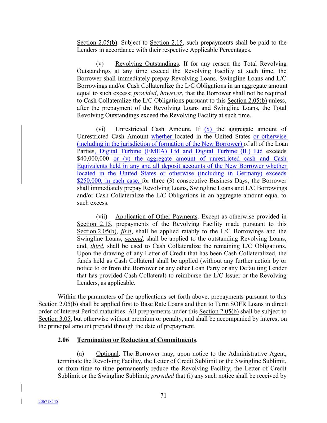 Section 2.05(b). Subject to Section 2.15, such prepayments shall be paid to the Lenders in accordance with their respective Applicable Percentages. (v) Revolving Outstandings. If for any reason the Total Revolving Outstandings at any time exceed the Revolving Facility at such time, the Borrower shall immediately prepay Revolving Loans, Swingline Loans and L/C Borrowings and/or Cash Collateralize the L/C Obligations in an aggregate amount equal to such excess; provided, however, that the Borrower shall not be required to Cash Collateralize the L/C Obligations pursuant to this Section 2.05(b) unless, after the prepayment of the Revolving Loans and Swingline Loans, the Total Revolving Outstandings exceed the Revolving Facility at such time. (vi) Unrestricted Cash Amount. If (x) the aggregate amount of Unrestricted Cash Amount whether located in the United States or otherwise (including in the jurisdiction of formation of the New Borrower) of all of the Loan Parties, Digital Turbine (EMEA) Ltd and Digital Turbine (IL) Ltd exceeds $40,000,000 or (y) the aggregate amount of unrestricted cash and Cash Equivalents held in any and all deposit accounts of the New Borrower whether located in the United States or otherwise (including in Germany) exceeds $250,000, in each case, for three (3) consecutive Business Days, the Borrower shall immediately prepay Revolving Loans, Swingline Loans and L/C Borrowings and/or Cash Collateralize the L/C Obligations in an aggregate amount equal to such excess. (vii) Application of Other Payments. Except as otherwise provided in Section 2.15, prepayments of the Revolving Facility made pursuant to this Section 2.05(b), first, shall be applied ratably to the L/C Borrowings and the Swingline Loans, second, shall be applied to the outstanding Revolving Loans, and, third, shall be used to Cash Collateralize the remaining L/C Obligations. Upon the drawing of any Letter of Credit that has been Cash Collateralized, the funds held as Cash Collateral shall be applied (without any further action by or notice to or from the Borrower or any other Loan Party or any Defaulting Lender that has provided Cash Collateral) to reimburse the L/C Issuer or the Revolving Lenders, as applicable. Within the parameters of the applications set forth above, prepayments pursuant to this Section 2.05(b) shall be applied first to Base Rate Loans and then to Term SOFR Loans in direct order of Interest Period maturities. All prepayments under this Section 2.05(b) shall be subject to Section 3.05, but otherwise without premium or penalty, and shall be accompanied by interest on the principal amount prepaid through the date of prepayment. 2.06 Termination or Reduction of Commitments. (a) Optional. The Borrower may, upon notice to the Administrative Agent, terminate the Revolving Facility, the Letter of Credit Sublimit or the Swingline Sublimit, or from time to time permanently reduce the Revolving Facility, the Letter of Credit Sublimit or the Swingline Sublimit; provided that (i) any such notice shall be received by 71 206718545