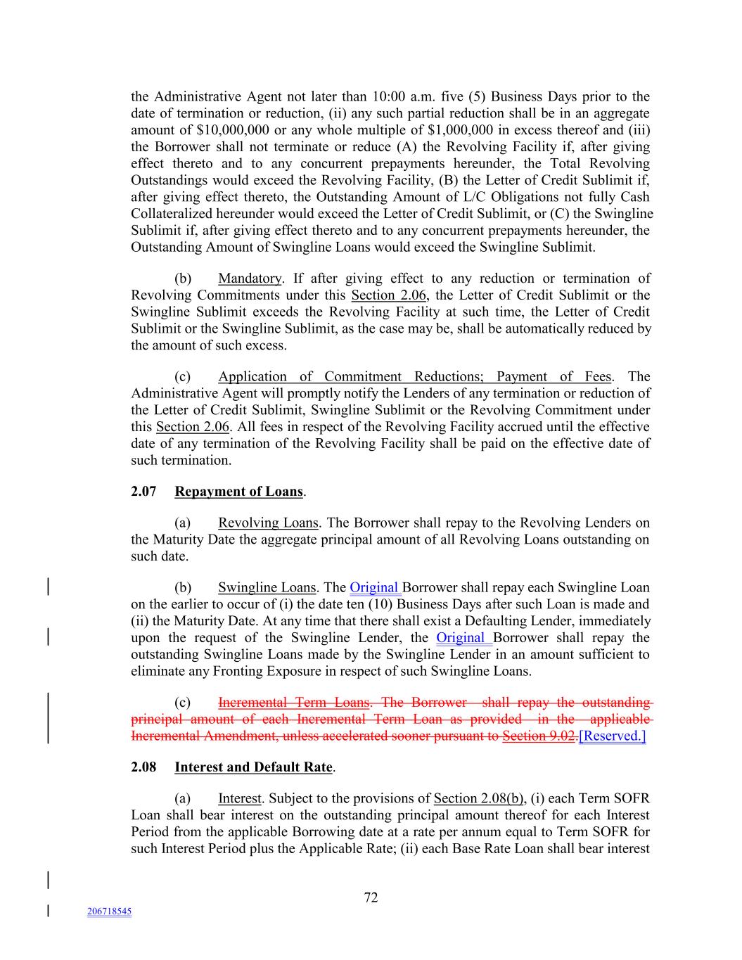 the Administrative Agent not later than 10:00 a.m. five (5) Business Days prior to the date of termination or reduction, (ii) any such partial reduction shall be in an aggregate amount of $10,000,000 or any whole multiple of $1,000,000 in excess thereof and (iii) the Borrower shall not terminate or reduce (A) the Revolving Facility if, after giving effect thereto and to any concurrent prepayments hereunder, the Total Revolving Outstandings would exceed the Revolving Facility, (B) the Letter of Credit Sublimit if, after giving effect thereto, the Outstanding Amount of L/C Obligations not fully Cash Collateralized hereunder would exceed the Letter of Credit Sublimit, or (C) the Swingline Sublimit if, after giving effect thereto and to any concurrent prepayments hereunder, the Outstanding Amount of Swingline Loans would exceed the Swingline Sublimit. (b) Mandatory. If after giving effect to any reduction or termination of Revolving Commitments under this Section 2.06, the Letter of Credit Sublimit or the Swingline Sublimit exceeds the Revolving Facility at such time, the Letter of Credit Sublimit or the Swingline Sublimit, as the case may be, shall be automatically reduced by the amount of such excess. (c) Application of Commitment Reductions; Payment of Fees. The Administrative Agent will promptly notify the Lenders of any termination or reduction of the Letter of Credit Sublimit, Swingline Sublimit or the Revolving Commitment under this Section 2.06. All fees in respect of the Revolving Facility accrued until the effective date of any termination of the Revolving Facility shall be paid on the effective date of such termination. 2.07 Repayment of Loans. (a) Revolving Loans. The Borrower shall repay to the Revolving Lenders on the Maturity Date the aggregate principal amount of all Revolving Loans outstanding on such date. (b) Swingline Loans. The Original Borrower shall repay each Swingline Loan on the earlier to occur of (i) the date ten (10) Business Days after such Loan is made and (ii) the Maturity Date. At any time that there shall exist a Defaulting Lender, immediately upon the request of the Swingline Lender, the Original Borrower shall repay the outstanding Swingline Loans made by the Swingline Lender in an amount sufficient to eliminate any Fronting Exposure in respect of such Swingline Loans. (c) Incremental Term Loans. The Borrower shall repay the outstanding principal amount of each Incremental Term Loan as provided in the applicable Incremental Amendment, unless accelerated sooner pursuant to Section 9.02.[Reserved.] 2.08 Interest and Default Rate. (a) Interest. Subject to the provisions of Section 2.08(b), (i) each Term SOFR Loan shall bear interest on the outstanding principal amount thereof for each Interest Period from the applicable Borrowing date at a rate per annum equal to Term SOFR for such Interest Period plus the Applicable Rate; (ii) each Base Rate Loan shall bear interest 72 206718545