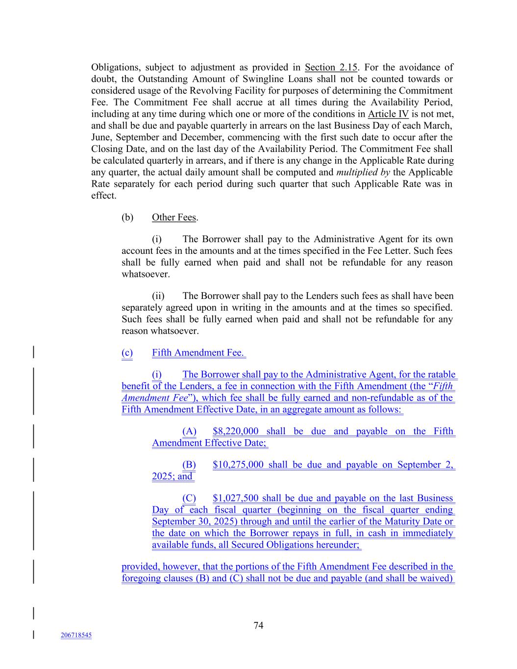 Obligations, subject to adjustment as provided in Section 2.15. For the avoidance of doubt, the Outstanding Amount of Swingline Loans shall not be counted towards or considered usage of the Revolving Facility for purposes of determining the Commitment Fee. The Commitment Fee shall accrue at all times during the Availability Period, including at any time during which one or more of the conditions in Article IV is not met, and shall be due and payable quarterly in arrears on the last Business Day of each March, June, September and December, commencing with the first such date to occur after the Closing Date, and on the last day of the Availability Period. The Commitment Fee shall be calculated quarterly in arrears, and if there is any change in the Applicable Rate during any quarter, the actual daily amount shall be computed and multiplied by the Applicable Rate separately for each period during such quarter that such Applicable Rate was in effect. (b) Other Fees. (i) The Borrower shall pay to the Administrative Agent for its own account fees in the amounts and at the times specified in the Fee Letter. Such fees shall be fully earned when paid and shall not be refundable for any reason whatsoever. (ii) The Borrower shall pay to the Lenders such fees as shall have been separately agreed upon in writing in the amounts and at the times so specified. Such fees shall be fully earned when paid and shall not be refundable for any reason whatsoever. (c) Fifth Amendment Fee. (i) The Borrower shall pay to the Administrative Agent, for the ratable benefit of the Lenders, a fee in connection with the Fifth Amendment (the “Fifth Amendment Fee”), which fee shall be fully earned and non-refundable as of the Fifth Amendment Effective Date, in an aggregate amount as follows: (A) $8,220,000 shall be due and payable on the Fifth Amendment Effective Date; (B) $10,275,000 shall be due and payable on September 2, 2025; and (C) $1,027,500 shall be due and payable on the last Business Day of each fiscal quarter (beginning on the fiscal quarter ending September 30, 2025) through and until the earlier of the Maturity Date or the date on which the Borrower repays in full, in cash in immediately available funds, all Secured Obligations hereunder; provided, however, that the portions of the Fifth Amendment Fee described in the foregoing clauses (B) and (C) shall not be due and payable (and shall be waived) 74 206718545