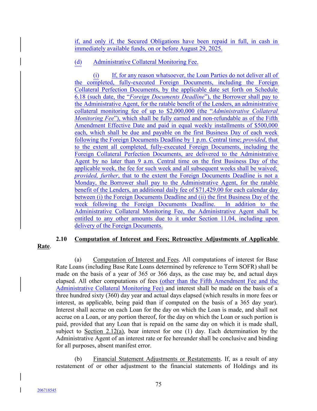 if, and only if, the Secured Obligations have been repaid in full, in cash in immediately available funds, on or before August 29, 2025. (d) Administrative Collateral Monitoring Fee. (i) If, for any reason whatsoever, the Loan Parties do not deliver all of the completed, fully-executed Foreign Documents, including the Foreign Collateral Perfection Documents, by the applicable date set forth on Schedule 6.18 (such date, the “Foreign Documents Deadline”), the Borrower shall pay to the Administrative Agent, for the ratable benefit of the Lenders, an administrative collateral monitoring fee of up to $2,000,000 (the “Administrative Collateral Monitoring Fee”), which shall be fully earned and non-refundable as of the Fifth Amendment Effective Date and paid in equal weekly installments of $500,000 each, which shall be due and payable on the first Business Day of each week following the Foreign Documents Deadline by 1 p.m. Central time; provided, that to the extent all completed, fully-executed Foreign Documents, including the Foreign Collateral Perfection Documents, are delivered to the Administrative Agent by no later than 9 a.m. Central time on the first Business Day of the applicable week, the fee for such week and all subsequent weeks shall be waived; provided, further, that to the extent the Foreign Documents Deadline is not a Monday, the Borrower shall pay to the Administrative Agent, for the ratable benefit of the Lenders, an additional daily fee of $71,429.00 for each calendar day between (i) the Foreign Documents Deadline and (ii) the first Business Day of the week following the Foreign Documents Deadline. In addition to the Administrative Collateral Monitoring Fee, the Administrative Agent shall be entitled to any other amounts due to it under Section 11.04, including upon delivery of the Foreign Documents. 2.10 Computation of Interest and Fees; Retroactive Adjustments of Applicable Rate. (a) Computation of Interest and Fees. All computations of interest for Base Rate Loans (including Base Rate Loans determined by reference to Term SOFR) shall be made on the basis of a year of 365 or 366 days, as the case may be, and actual days elapsed. All other computations of fees (other than the Fifth Amendment Fee and the Administrative Collateral Monitoring Fee) and interest shall be made on the basis of a three hundred sixty (360) day year and actual days elapsed (which results in more fees or interest, as applicable, being paid than if computed on the basis of a 365 day year). Interest shall accrue on each Loan for the day on which the Loan is made, and shall not accrue on a Loan, or any portion thereof, for the day on which the Loan or such portion is paid, provided that any Loan that is repaid on the same day on which it is made shall, subject to Section 2.12(a), bear interest for one (1) day. Each determination by the Administrative Agent of an interest rate or fee hereunder shall be conclusive and binding for all purposes, absent manifest error. (b) Financial Statement Adjustments or Restatements. If, as a result of any restatement of or other adjustment to the financial statements of Holdings and its 75 206718545