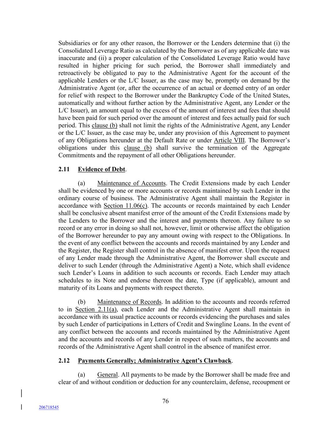 Subsidiaries or for any other reason, the Borrower or the Lenders determine that (i) the Consolidated Leverage Ratio as calculated by the Borrower as of any applicable date was inaccurate and (ii) a proper calculation of the Consolidated Leverage Ratio would have resulted in higher pricing for such period, the Borrower shall immediately and retroactively be obligated to pay to the Administrative Agent for the account of the applicable Lenders or the L/C Issuer, as the case may be, promptly on demand by the Administrative Agent (or, after the occurrence of an actual or deemed entry of an order for relief with respect to the Borrower under the Bankruptcy Code of the United States, automatically and without further action by the Administrative Agent, any Lender or the L/C Issuer), an amount equal to the excess of the amount of interest and fees that should have been paid for such period over the amount of interest and fees actually paid for such period. This clause (b) shall not limit the rights of the Administrative Agent, any Lender or the L/C Issuer, as the case may be, under any provision of this Agreement to payment of any Obligations hereunder at the Default Rate or under Article VIII. The Borrower’s obligations under this clause (b) shall survive the termination of the Aggregate Commitments and the repayment of all other Obligations hereunder. 2.11 Evidence of Debt. (a) Maintenance of Accounts. The Credit Extensions made by each Lender shall be evidenced by one or more accounts or records maintained by such Lender in the ordinary course of business. The Administrative Agent shall maintain the Register in accordance with Section 11.06(c). The accounts or records maintained by each Lender shall be conclusive absent manifest error of the amount of the Credit Extensions made by the Lenders to the Borrower and the interest and payments thereon. Any failure to so record or any error in doing so shall not, however, limit or otherwise affect the obligation of the Borrower hereunder to pay any amount owing with respect to the Obligations. In the event of any conflict between the accounts and records maintained by any Lender and the Register, the Register shall control in the absence of manifest error. Upon the request of any Lender made through the Administrative Agent, the Borrower shall execute and deliver to such Lender (through the Administrative Agent) a Note, which shall evidence such Lender’s Loans in addition to such accounts or records. Each Lender may attach schedules to its Note and endorse thereon the date, Type (if applicable), amount and maturity of its Loans and payments with respect thereto. (b) Maintenance of Records. In addition to the accounts and records referred to in Section 2.11(a), each Lender and the Administrative Agent shall maintain in accordance with its usual practice accounts or records evidencing the purchases and sales by such Lender of participations in Letters of Credit and Swingline Loans. In the event of any conflict between the accounts and records maintained by the Administrative Agent and the accounts and records of any Lender in respect of such matters, the accounts and records of the Administrative Agent shall control in the absence of manifest error. 2.12 Payments Generally; Administrative Agent’s Clawback. (a) General. All payments to be made by the Borrower shall be made free and clear of and without condition or deduction for any counterclaim, defense, recoupment or 76 206718545
