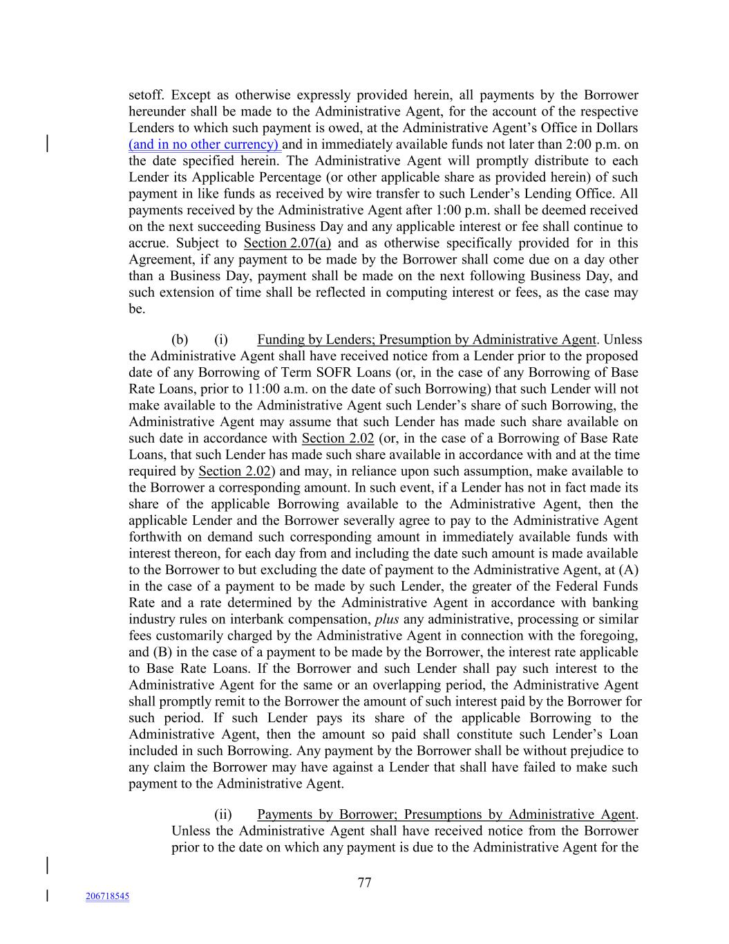 setoff. Except as otherwise expressly provided herein, all payments by the Borrower hereunder shall be made to the Administrative Agent, for the account of the respective Lenders to which such payment is owed, at the Administrative Agent’s Office in Dollars (and in no other currency) and in immediately available funds not later than 2:00 p.m. on the date specified herein. The Administrative Agent will promptly distribute to each Lender its Applicable Percentage (or other applicable share as provided herein) of such payment in like funds as received by wire transfer to such Lender’s Lending Office. All payments received by the Administrative Agent after 1:00 p.m. shall be deemed received on the next succeeding Business Day and any applicable interest or fee shall continue to accrue. Subject to Section 2.07(a) and as otherwise specifically provided for in this Agreement, if any payment to be made by the Borrower shall come due on a day other than a Business Day, payment shall be made on the next following Business Day, and such extension of time shall be reflected in computing interest or fees, as the case may be. (b) (i) Funding by Lenders; Presumption by Administrative Agent. Unless the Administrative Agent shall have received notice from a Lender prior to the proposed date of any Borrowing of Term SOFR Loans (or, in the case of any Borrowing of Base Rate Loans, prior to 11:00 a.m. on the date of such Borrowing) that such Lender will not make available to the Administrative Agent such Lender’s share of such Borrowing, the Administrative Agent may assume that such Lender has made such share available on such date in accordance with Section 2.02 (or, in the case of a Borrowing of Base Rate Loans, that such Lender has made such share available in accordance with and at the time required by Section 2.02) and may, in reliance upon such assumption, make available to the Borrower a corresponding amount. In such event, if a Lender has not in fact made its share of the applicable Borrowing available to the Administrative Agent, then the applicable Lender and the Borrower severally agree to pay to the Administrative Agent forthwith on demand such corresponding amount in immediately available funds with interest thereon, for each day from and including the date such amount is made available to the Borrower to but excluding the date of payment to the Administrative Agent, at (A) in the case of a payment to be made by such Lender, the greater of the Federal Funds Rate and a rate determined by the Administrative Agent in accordance with banking industry rules on interbank compensation, plus any administrative, processing or similar fees customarily charged by the Administrative Agent in connection with the foregoing, and (B) in the case of a payment to be made by the Borrower, the interest rate applicable to Base Rate Loans. If the Borrower and such Lender shall pay such interest to the Administrative Agent for the same or an overlapping period, the Administrative Agent shall promptly remit to the Borrower the amount of such interest paid by the Borrower for such period. If such Lender pays its share of the applicable Borrowing to the Administrative Agent, then the amount so paid shall constitute such Lender’s Loan included in such Borrowing. Any payment by the Borrower shall be without prejudice to any claim the Borrower may have against a Lender that shall have failed to make such payment to the Administrative Agent. (ii) Payments by Borrower; Presumptions by Administrative Agent. Unless the Administrative Agent shall have received notice from the Borrower prior to the date on which any payment is due to the Administrative Agent for the 77 206718545