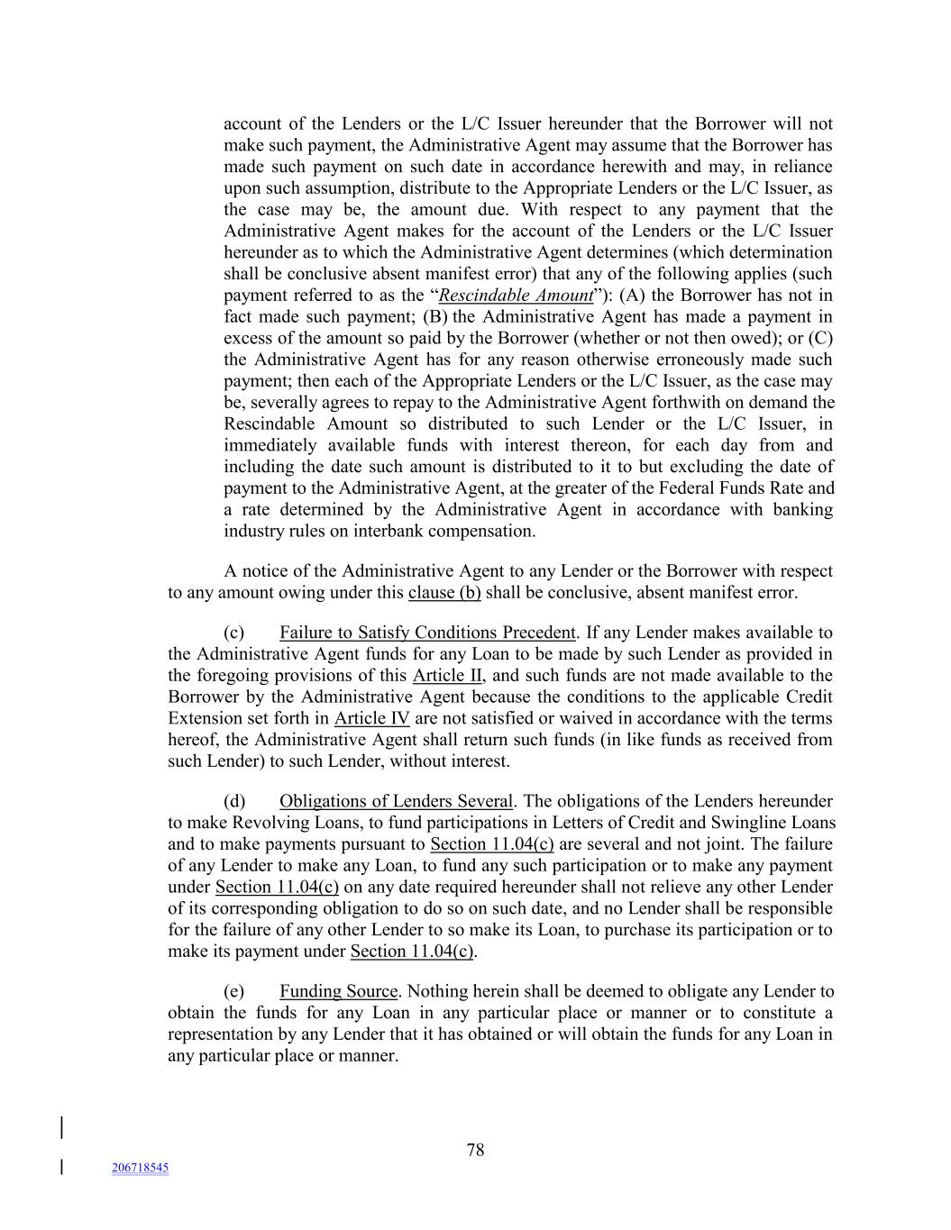 account of the Lenders or the L/C Issuer hereunder that the Borrower will not make such payment, the Administrative Agent may assume that the Borrower has made such payment on such date in accordance herewith and may, in reliance upon such assumption, distribute to the Appropriate Lenders or the L/C Issuer, as the case may be, the amount due. With respect to any payment that the Administrative Agent makes for the account of the Lenders or the L/C Issuer hereunder as to which the Administrative Agent determines (which determination shall be conclusive absent manifest error) that any of the following applies (such payment referred to as the “Rescindable Amount”): (A) the Borrower has not in fact made such payment; (B) the Administrative Agent has made a payment in excess of the amount so paid by the Borrower (whether or not then owed); or (C) the Administrative Agent has for any reason otherwise erroneously made such payment; then each of the Appropriate Lenders or the L/C Issuer, as the case may be, severally agrees to repay to the Administrative Agent forthwith on demand the Rescindable Amount so distributed to such Lender or the L/C Issuer, in immediately available funds with interest thereon, for each day from and including the date such amount is distributed to it to but excluding the date of payment to the Administrative Agent, at the greater of the Federal Funds Rate and a rate determined by the Administrative Agent in accordance with banking industry rules on interbank compensation. A notice of the Administrative Agent to any Lender or the Borrower with respect to any amount owing under this clause (b) shall be conclusive, absent manifest error. (c) Failure to Satisfy Conditions Precedent. If any Lender makes available to the Administrative Agent funds for any Loan to be made by such Lender as provided in the foregoing provisions of this Article II, and such funds are not made available to the Borrower by the Administrative Agent because the conditions to the applicable Credit Extension set forth in Article IV are not satisfied or waived in accordance with the terms hereof, the Administrative Agent shall return such funds (in like funds as received from such Lender) to such Lender, without interest. (d) Obligations of Lenders Several. The obligations of the Lenders hereunder to make Revolving Loans, to fund participations in Letters of Credit and Swingline Loans and to make payments pursuant to Section 11.04(c) are several and not joint. The failure of any Lender to make any Loan, to fund any such participation or to make any payment under Section 11.04(c) on any date required hereunder shall not relieve any other Lender of its corresponding obligation to do so on such date, and no Lender shall be responsible for the failure of any other Lender to so make its Loan, to purchase its participation or to make its payment under Section 11.04(c). (e) Funding Source. Nothing herein shall be deemed to obligate any Lender to obtain the funds for any Loan in any particular place or manner or to constitute a representation by any Lender that it has obtained or will obtain the funds for any Loan in any particular place or manner. 78 206718545