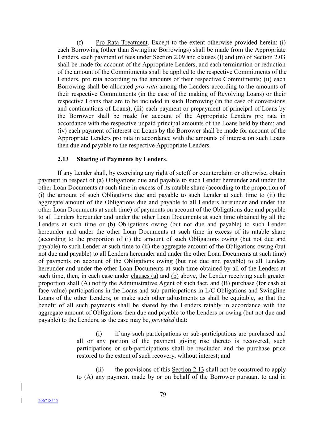 (f) Pro Rata Treatment. Except to the extent otherwise provided herein: (i) each Borrowing (other than Swingline Borrowings) shall be made from the Appropriate Lenders, each payment of fees under Section 2.09 and clauses (l) and (m) of Section 2.03 shall be made for account of the Appropriate Lenders, and each termination or reduction of the amount of the Commitments shall be applied to the respective Commitments of the Lenders, pro rata according to the amounts of their respective Commitments; (ii) each Borrowing shall be allocated pro rata among the Lenders according to the amounts of their respective Commitments (in the case of the making of Revolving Loans) or their respective Loans that are to be included in such Borrowing (in the case of conversions and continuations of Loans); (iii) each payment or prepayment of principal of Loans by the Borrower shall be made for account of the Appropriate Lenders pro rata in accordance with the respective unpaid principal amounts of the Loans held by them; and (iv) each payment of interest on Loans by the Borrower shall be made for account of the Appropriate Lenders pro rata in accordance with the amounts of interest on such Loans then due and payable to the respective Appropriate Lenders. 2.13 Sharing of Payments by Lenders. If any Lender shall, by exercising any right of setoff or counterclaim or otherwise, obtain payment in respect of (a) Obligations due and payable to such Lender hereunder and under the other Loan Documents at such time in excess of its ratable share (according to the proportion of (i) the amount of such Obligations due and payable to such Lender at such time to (ii) the aggregate amount of the Obligations due and payable to all Lenders hereunder and under the other Loan Documents at such time) of payments on account of the Obligations due and payable to all Lenders hereunder and under the other Loan Documents at such time obtained by all the Lenders at such time or (b) Obligations owing (but not due and payable) to such Lender hereunder and under the other Loan Documents at such time in excess of its ratable share (according to the proportion of (i) the amount of such Obligations owing (but not due and payable) to such Lender at such time to (ii) the aggregate amount of the Obligations owing (but not due and payable) to all Lenders hereunder and under the other Loan Documents at such time) of payments on account of the Obligations owing (but not due and payable) to all Lenders hereunder and under the other Loan Documents at such time obtained by all of the Lenders at such time, then, in each case under clauses (a) and (b) above, the Lender receiving such greater proportion shall (A) notify the Administrative Agent of such fact, and (B) purchase (for cash at face value) participations in the Loans and sub-participations in L/C Obligations and Swingline Loans of the other Lenders, or make such other adjustments as shall be equitable, so that the benefit of all such payments shall be shared by the Lenders ratably in accordance with the aggregate amount of Obligations then due and payable to the Lenders or owing (but not due and payable) to the Lenders, as the case may be, provided that: (i) if any such participations or sub-participations are purchased and all or any portion of the payment giving rise thereto is recovered, such participations or sub-participations shall be rescinded and the purchase price restored to the extent of such recovery, without interest; and (ii) the provisions of this Section 2.13 shall not be construed to apply to (A) any payment made by or on behalf of the Borrower pursuant to and in 79 206718545