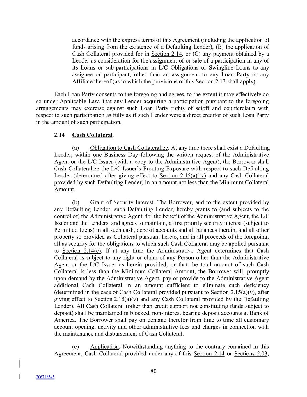 accordance with the express terms of this Agreement (including the application of funds arising from the existence of a Defaulting Lender), (B) the application of Cash Collateral provided for in Section 2.14, or (C) any payment obtained by a Lender as consideration for the assignment of or sale of a participation in any of its Loans or sub-participations in L/C Obligations or Swingline Loans to any assignee or participant, other than an assignment to any Loan Party or any Affiliate thereof (as to which the provisions of this Section 2.13 shall apply). Each Loan Party consents to the foregoing and agrees, to the extent it may effectively do so under Applicable Law, that any Lender acquiring a participation pursuant to the foregoing arrangements may exercise against such Loan Party rights of setoff and counterclaim with respect to such participation as fully as if such Lender were a direct creditor of such Loan Party in the amount of such participation. 2.14 Cash Collateral. (a) Obligation to Cash Collateralize. At any time there shall exist a Defaulting Lender, within one Business Day following the written request of the Administrative Agent or the L/C Issuer (with a copy to the Administrative Agent), the Borrower shall Cash Collateralize the L/C Issuer’s Fronting Exposure with respect to such Defaulting Lender (determined after giving effect to Section 2.15(a)(iv) and any Cash Collateral provided by such Defaulting Lender) in an amount not less than the Minimum Collateral Amount. (b) Grant of Security Interest. The Borrower, and to the extent provided by any Defaulting Lender, such Defaulting Lender, hereby grants to (and subjects to the control of) the Administrative Agent, for the benefit of the Administrative Agent, the L/C Issuer and the Lenders, and agrees to maintain, a first priority security interest (subject to Permitted Liens) in all such cash, deposit accounts and all balances therein, and all other property so provided as Collateral pursuant hereto, and in all proceeds of the foregoing, all as security for the obligations to which such Cash Collateral may be applied pursuant to Section 2.14(c). If at any time the Administrative Agent determines that Cash Collateral is subject to any right or claim of any Person other than the Administrative Agent or the L/C Issuer as herein provided, or that the total amount of such Cash Collateral is less than the Minimum Collateral Amount, the Borrower will, promptly upon demand by the Administrative Agent, pay or provide to the Administrative Agent additional Cash Collateral in an amount sufficient to eliminate such deficiency (determined in the case of Cash Collateral provided pursuant to Section 2.15(a)(v), after giving effect to Section 2.15(a)(v) and any Cash Collateral provided by the Defaulting Lender). All Cash Collateral (other than credit support not constituting funds subject to deposit) shall be maintained in blocked, non-interest bearing deposit accounts at Bank of America. The Borrower shall pay on demand therefor from time to time all customary account opening, activity and other administrative fees and charges in connection with the maintenance and disbursement of Cash Collateral. (c) Application. Notwithstanding anything to the contrary contained in this Agreement, Cash Collateral provided under any of this Section 2.14 or Sections 2.03, 80 206718545