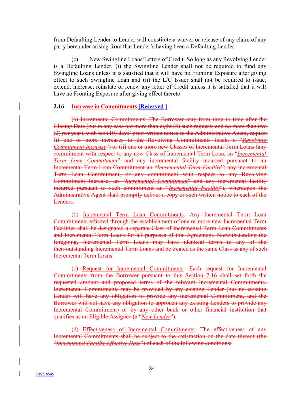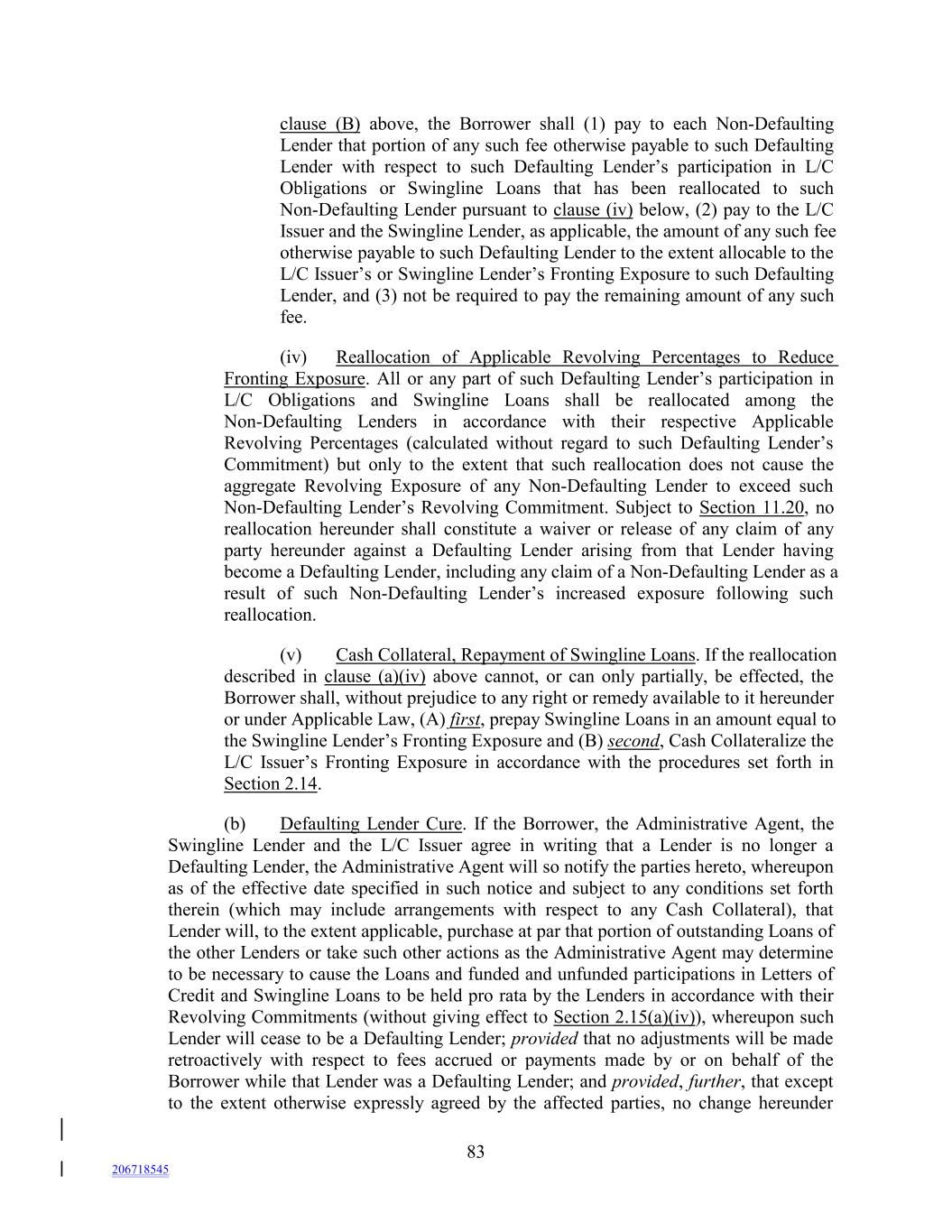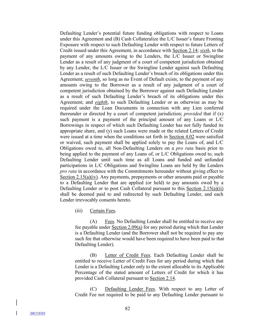 2.05, 2.15 or 8.02 in respect of Letters of Credit shall be held and applied to the satisfaction of the specific L/C Obligations, obligations to fund participations therein (including, as to Cash Collateral provided by a Revolving Lender that is a Defaulting Lender, any interest accrued on such obligation) and other obligations for which the Cash Collateral was so provided, prior to any other application of such property as may be provided for herein. (d) Release. Cash Collateral (or the appropriate portion thereof) provided to reduce Fronting Exposure or to secure other obligations shall be released promptly following (i) the elimination of the applicable Fronting Exposure or other obligations giving rise thereto (including by the termination of Defaulting Lender status of the applicable Revolving Lender (or, as appropriate, its assignee following compliance with Section 11.06(b)(vi))) or (ii) the determination by the Administrative Agent and the L/C Issuer that there exists excess Cash Collateral; provided, however, (A) any such release shall be without prejudice to, and any disbursement or other transfer of Cash Collateral shall be and remain subject to, any other Lien conferred under the Loan Documents and the other applicable provisions of the Loan Documents, and (B) the Person providing Cash Collateral and the L/C Issuer may agree that Cash Collateral shall not be released but instead held to support future anticipated Fronting Exposure or other obligations. 2.15 Defaulting Lenders. (a) Adjustments. Notwithstanding anything to the contrary contained in this Agreement, if any Lender becomes a Defaulting Lender, then, until such time as that Lender is no longer a Defaulting Lender, to the extent permitted by Applicable Law: (i) Waivers and Amendments. Such Defaulting Lender’s right to approve or disapprove any amendment, waiver or consent with respect to this Agreement shall be restricted as set forth in the definition of “Required Lenders” and Section 11.01. (ii) Defaulting Lender Waterfall. Any payment of principal, interest, fees or other amounts received by the Administrative Agent for the account of such Defaulting Lender (whether voluntary or mandatory, at maturity, pursuant to Article VIII or otherwise) or received by the Administrative Agent from a Defaulting Lender pursuant to Section 11.08 shall be applied at such time or times as may be determined by the Administrative Agent as follows: first, to the payment of any amounts owing by such Defaulting Lender to the Administrative Agent hereunder; second, to the payment on a pro rata basis of any amounts owing by such Defaulting Lender to the L/C Issuer or the Swingline Lender hereunder; third, to Cash Collateralize the L/C Issuer’s Fronting Exposure with respect to such Defaulting Lender in accordance with Section 2.14; fourth, as the Borrower may request (so long as no Event of Default exists), to the funding of any Loan in respect of which such Defaulting Lender has failed to fund its portion thereof as required by this Agreement, as determined by the Administrative Agent; fifth, if so determined by the Administrative Agent and the Borrower, to be held in a deposit account and released pro rata in order to (A) satisfy such 81 206718545