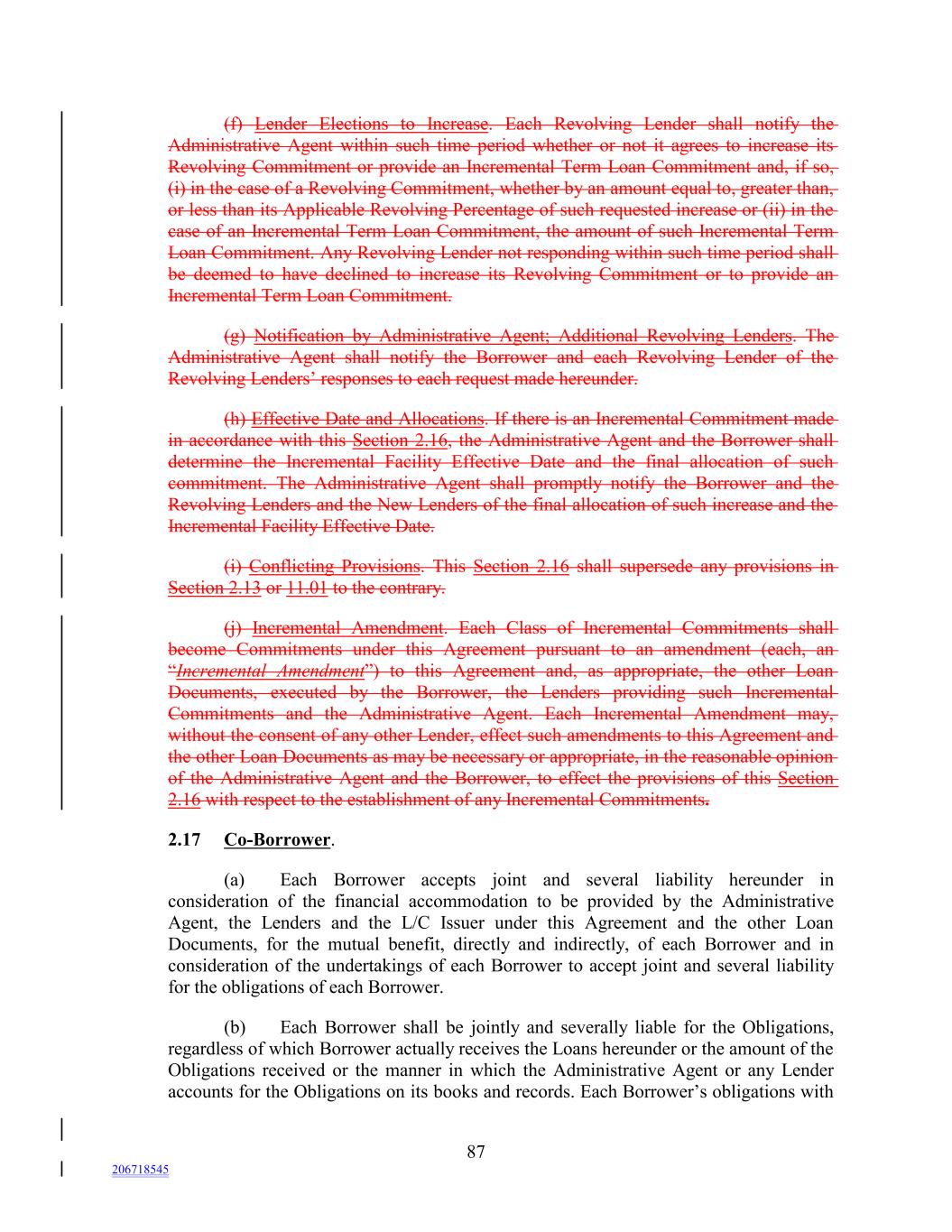 Table of Contents Page ARTICLE I DEFINITIONS AND ACCOUNTING TERMS 2 1.01 Defined Terms 2 1.02 Other Interpretive Provisions 44 1.03 Accounting Terms 45 1.04 Rounding 46 1.05 Times of Day 4647 1.06 Letter of Credit Amounts 4647 1.07 UCC Terms 4647 1.08 Rates 4647 1.09 Dutch Terms. 48 ARTICLE II COMMITMENTS AND CREDIT EXTENSIONS 4748 2.01 Loans 4748 2.02 Borrowings, Conversions and Continuations of Loans 4749 2.03 Letters of Credit 5051 2.04 Swingline Loans 60 2.05 Prepayments 6364 2.06 Termination or Reduction of Commitments 6566 2.07 Repayment of Loans 6667 2.08 Interest and Default Rate 6667 2.09 Fees 6768 2.10 Computation of Interest and Fees; Retroactive Adjustments of Applicable Rate 6870 2.11 Evidence of Debt 6971 2.12 Payments Generally; Administrative Agent’s Clawback 6971 2.13 Sharing of Payments by Lenders 7273 2.14 Cash Collateral 7274 2.15 Defaulting Lenders 7476 2.16 Increase in Commitments 76[Reserved.] 78 2.17 Co-Borrower 8078 ARTICLE III TAXES, YIELD PROTECTION AND ILLEGALITY 8079 3.01 Taxes 8079 3.02 Illegality 8584 3.03 Inability to Determine Rates 8685 3.04 Increased Costs 8887 3.05 Compensation for Losses 8988 3.06 Mitigation Obligations; Replacement of Lenders 9089 3.07 Survival 9189 ARTICLE IV CONDITIONS PRECEDENT TO CREDIT EXTENSIONS 9190 4.01 Conditions of Initial Credit Extension 9190 4.02 Conditions to all Credit Extensions 9392 ARTICLE V REPRESENTATIONS AND WARRANTIES 9493 i 206718545