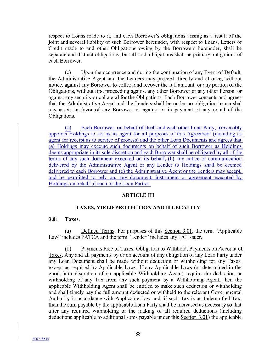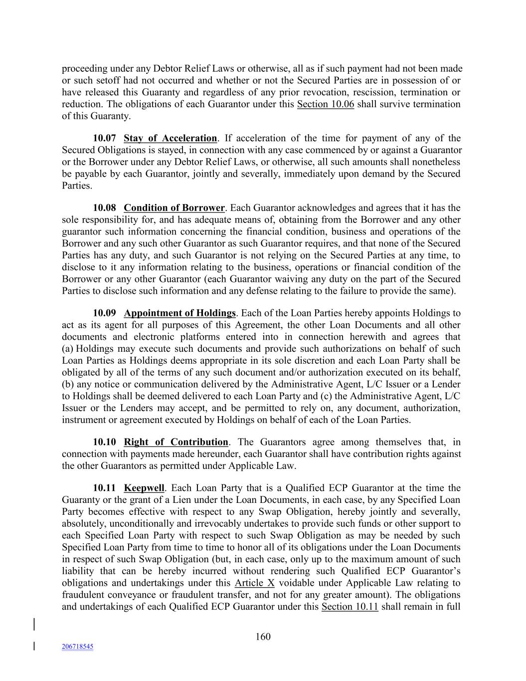 proceeding under any Debtor Relief Laws or otherwise, all as if such payment had not been made or such setoff had not occurred and whether or not the Secured Parties are in possession of or have released this Guaranty and regardless of any prior revocation, rescission, termination or reduction. The obligations of each Guarantor under this Section 10.06 shall survive termination of this Guaranty. 10.07 Stay of Acceleration. If acceleration of the time for payment of any of the Secured Obligations is stayed, in connection with any case commenced by or against a Guarantor or the Borrower under any Debtor Relief Laws, or otherwise, all such amounts shall nonetheless be payable by each Guarantor, jointly and severally, immediately upon demand by the Secured Parties. 10.08 Condition of Borrower. Each Guarantor acknowledges and agrees that it has the sole responsibility for, and has adequate means of, obtaining from the Borrower and any other guarantor such information concerning the financial condition, business and operations of the Borrower and any such other Guarantor as such Guarantor requires, and that none of the Secured Parties has any duty, and such Guarantor is not relying on the Secured Parties at any time, to disclose to it any information relating to the business, operations or financial condition of the Borrower or any other Guarantor (each Guarantor waiving any duty on the part of the Secured Parties to disclose such information and any defense relating to the failure to provide the same). 10.09 Appointment of Holdings. Each of the Loan Parties hereby appoints Holdings to act as its agent for all purposes of this Agreement, the other Loan Documents and all other documents and electronic platforms entered into in connection herewith and agrees that (a) Holdings may execute such documents and provide such authorizations on behalf of such Loan Parties as Holdings deems appropriate in its sole discretion and each Loan Party shall be obligated by all of the terms of any such document and/or authorization executed on its behalf, (b) any notice or communication delivered by the Administrative Agent, L/C Issuer or a Lender to Holdings shall be deemed delivered to each Loan Party and (c) the Administrative Agent, L/C Issuer or the Lenders may accept, and be permitted to rely on, any document, authorization, instrument or agreement executed by Holdings on behalf of each of the Loan Parties. 10.10 Right of Contribution. The Guarantors agree among themselves that, in connection with payments made hereunder, each Guarantor shall have contribution rights against the other Guarantors as permitted under Applicable Law. 10.11 Keepwell. Each Loan Party that is a Qualified ECP Guarantor at the time the Guaranty or the grant of a Lien under the Loan Documents, in each case, by any Specified Loan Party becomes effective with respect to any Swap Obligation, hereby jointly and severally, absolutely, unconditionally and irrevocably undertakes to provide such funds or other support to each Specified Loan Party with respect to such Swap Obligation as may be needed by such Specified Loan Party from time to time to honor all of its obligations under the Loan Documents in respect of such Swap Obligation (but, in each case, only up to the maximum amount of such liability that can be hereby incurred without rendering such Qualified ECP Guarantor’s obligations and undertakings under this Article X voidable under Applicable Law relating to fraudulent conveyance or fraudulent transfer, and not for any greater amount). The obligations and undertakings of each Qualified ECP Guarantor under this Section 10.11 shall remain in full 160 206718545