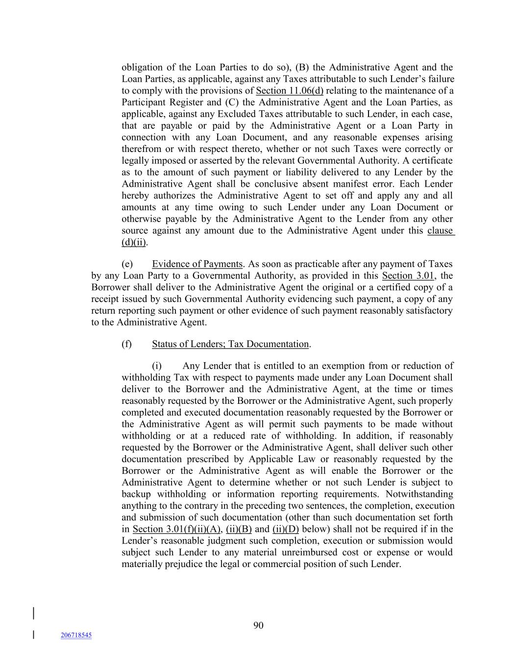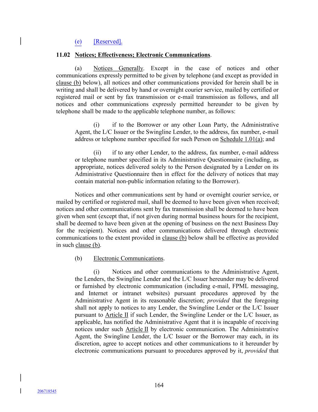 (e) [Reserved]. 11.02 Notices; Effectiveness; Electronic Communications. (a) Notices Generally. Except in the case of notices and other communications expressly permitted to be given by telephone (and except as provided in clause (b) below), all notices and other communications provided for herein shall be in writing and shall be delivered by hand or overnight courier service, mailed by certified or registered mail or sent by fax transmission or e-mail transmission as follows, and all notices and other communications expressly permitted hereunder to be given by telephone shall be made to the applicable telephone number, as follows: (i) if to the Borrower or any other Loan Party, the Administrative Agent, the L/C Issuer or the Swingline Lender, to the address, fax number, e-mail address or telephone number specified for such Person on Schedule 1.01(a); and (ii) if to any other Lender, to the address, fax number, e-mail address or telephone number specified in its Administrative Questionnaire (including, as appropriate, notices delivered solely to the Person designated by a Lender on its Administrative Questionnaire then in effect for the delivery of notices that may contain material non-public information relating to the Borrower). Notices and other communications sent by hand or overnight courier service, or mailed by certified or registered mail, shall be deemed to have been given when received; notices and other communications sent by fax transmission shall be deemed to have been given when sent (except that, if not given during normal business hours for the recipient, shall be deemed to have been given at the opening of business on the next Business Day for the recipient). Notices and other communications delivered through electronic communications to the extent provided in clause (b) below shall be effective as provided in such clause (b). (b) Electronic Communications. (i) Notices and other communications to the Administrative Agent, the Lenders, the Swingline Lender and the L/C Issuer hereunder may be delivered or furnished by electronic communication (including e-mail, FPML messaging, and Internet or intranet websites) pursuant procedures approved by the Administrative Agent in its reasonable discretion; provided that the foregoing shall not apply to notices to any Lender, the Swingline Lender or the L/C Issuer pursuant to Article II if such Lender, the Swingline Lender or the L/C Issuer, as applicable, has notified the Administrative Agent that it is incapable of receiving notices under such Article II by electronic communication. The Administrative Agent, the Swingline Lender, the L/C Issuer or the Borrower may each, in its discretion, agree to accept notices and other communications to it hereunder by electronic communications pursuant to procedures approved by it, provided that 164 206718545
