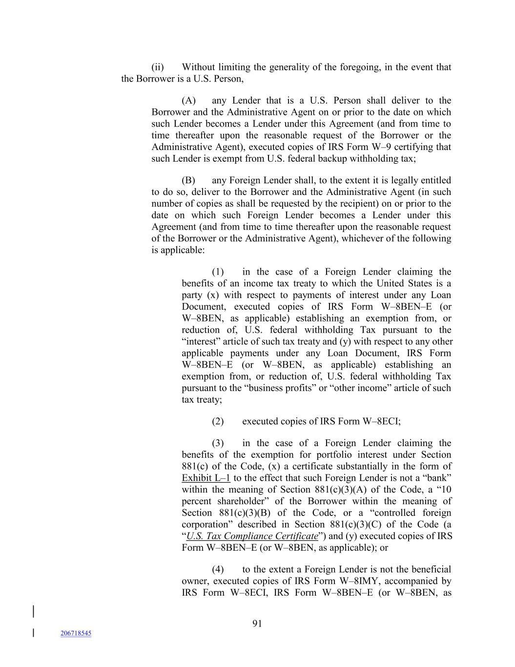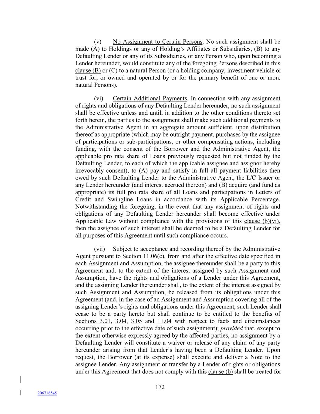 (v) No Assignment to Certain Persons. No such assignment shall be made (A) to Holdings or any of Holding’s Affiliates or Subsidiaries, (B) to any Defaulting Lender or any of its Subsidiaries, or any Person who, upon becoming a Lender hereunder, would constitute any of the foregoing Persons described in this clause (B) or (C) to a natural Person (or a holding company, investment vehicle or trust for, or owned and operated by or for the primary benefit of one or more natural Persons). (vi) Certain Additional Payments. In connection with any assignment of rights and obligations of any Defaulting Lender hereunder, no such assignment shall be effective unless and until, in addition to the other conditions thereto set forth herein, the parties to the assignment shall make such additional payments to the Administrative Agent in an aggregate amount sufficient, upon distribution thereof as appropriate (which may be outright payment, purchases by the assignee of participations or sub-participations, or other compensating actions, including funding, with the consent of the Borrower and the Administrative Agent, the applicable pro rata share of Loans previously requested but not funded by the Defaulting Lender, to each of which the applicable assignee and assignor hereby irrevocably consent), to (A) pay and satisfy in full all payment liabilities then owed by such Defaulting Lender to the Administrative Agent, the L/C Issuer or any Lender hereunder (and interest accrued thereon) and (B) acquire (and fund as appropriate) its full pro rata share of all Loans and participations in Letters of Credit and Swingline Loans in accordance with its Applicable Percentage. Notwithstanding the foregoing, in the event that any assignment of rights and obligations of any Defaulting Lender hereunder shall become effective under Applicable Law without compliance with the provisions of this clause (b)(vi), then the assignee of such interest shall be deemed to be a Defaulting Lender for all purposes of this Agreement until such compliance occurs. (vii) Subject to acceptance and recording thereof by the Administrative Agent pursuant to Section 11.06(c), from and after the effective date specified in each Assignment and Assumption, the assignee thereunder shall be a party to this Agreement and, to the extent of the interest assigned by such Assignment and Assumption, have the rights and obligations of a Lender under this Agreement, and the assigning Lender thereunder shall, to the extent of the interest assigned by such Assignment and Assumption, be released from its obligations under this Agreement (and, in the case of an Assignment and Assumption covering all of the assigning Lender’s rights and obligations under this Agreement, such Lender shall cease to be a party hereto but shall continue to be entitled to the benefits of Sections 3.01, 3.04, 3.05 and 11.04 with respect to facts and circumstances occurring prior to the effective date of such assignment); provided that, except to the extent otherwise expressly agreed by the affected parties, no assignment by a Defaulting Lender will constitute a waiver or release of any claim of any party hereunder arising from that Lender’s having been a Defaulting Lender. Upon request, the Borrower (at its expense) shall execute and deliver a Note to the assignee Lender. Any assignment or transfer by a Lender of rights or obligations under this Agreement that does not comply with this clause (b) shall be treated for 172 206718545