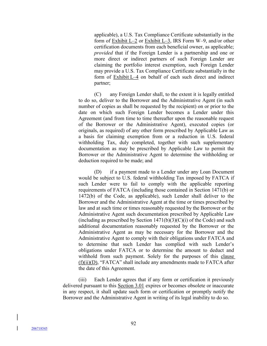 from the assignee (to the extent of such outstanding principal and accrued interest and fees) or the Borrower (in the case of all other amounts); (iii) in the case of any such assignment resulting from a claim for compensation under Section 3.04 or payments required to be made pursuant to Section 3.01, such assignment will result in a reduction in such compensation or payments thereafter; (iv) such assignment does not conflict with Applicable Laws; and (v) in the case of an assignment resulting from a Lender becoming a Non-Consenting Lender, the applicable assignee shall have consented to the applicable amendment, waiver or consent. (b) A Lender shall not be required to make any such assignment or delegation if, prior thereto, as a result of a waiver by such Lender or otherwise, the circumstances entitling the Borrower to require such assignment and delegation cease to apply. (c) Each party hereto agrees that (i) an assignment required pursuant to this Section 11.13 may be effected pursuant to an Assignment and Assumption executed by the Borrower, the Administrative Agent and the assignee and (ii) the Lender required to make such assignment need not be a party thereto in order for such assignment to be effective and shall be deemed to have consented to an be bound by the terms thereof; provided that, following the effectiveness of any such assignment, the other parties to such assignment agree to execute and deliver such documents necessary to evidence such assignment as reasonably requested by the applicable Lender, provided further that any such documents shall be without recourse to or warranty by the parties thereto. (d) Notwithstanding anything in this Section 11.13 to the contrary, (A) the Lender that acts as the L/C Issuer may not be replaced hereunder at any time it has any Letter of Credit outstanding hereunder unless arrangements satisfactory to such Lender (including the furnishing of a backstop standby letter of credit in form and substance, and issued by an issuer, reasonably satisfactory to the L/C Issuer or the depositing of Cash Collateral into a Cash Collateral account in amounts and pursuant to arrangements reasonably satisfactory to the L/C Issuer) have been made with respect to such outstanding Letter of Credit and (B) the Lender that acts as the Administrative Agent may not be replaced hereunder except in accordance with the terms of Section 9.06. 11.14 Governing Law; Jurisdiction; Etc. (a) GOVERNING LAW. THIS AGREEMENT AND THE OTHER LOAN DOCUMENTS (EXCEPT, AS TO ANY OTHER LOAN DOCUMENT, AS EXPRESSLY SET FORTH THEREIN) AND ANY CLAIMS, CONTROVERSY, DISPUTE OR CAUSE OF ACTION (WHETHER IN CONTRACT OR TORT OR OTHERWISE) BASED UPON, ARISING OUT OF OR RELATING TO THIS AGREEMENT OR ANY OTHER LOAN DOCUMENT (EXCEPT, AS TO ANY OTHER LOAN DOCUMENT, AS EXPRESSLY SET FORTH THEREIN) AND THE 179 206718545