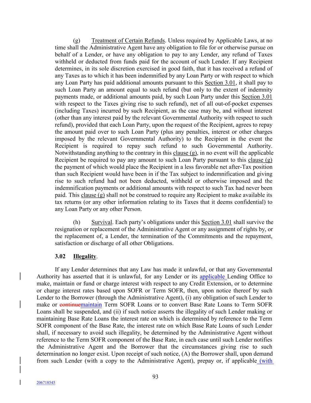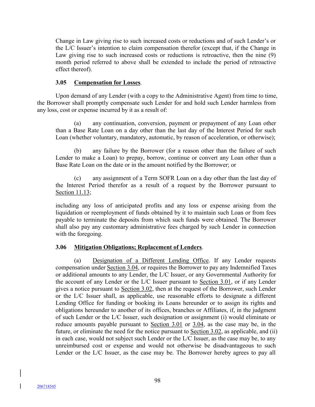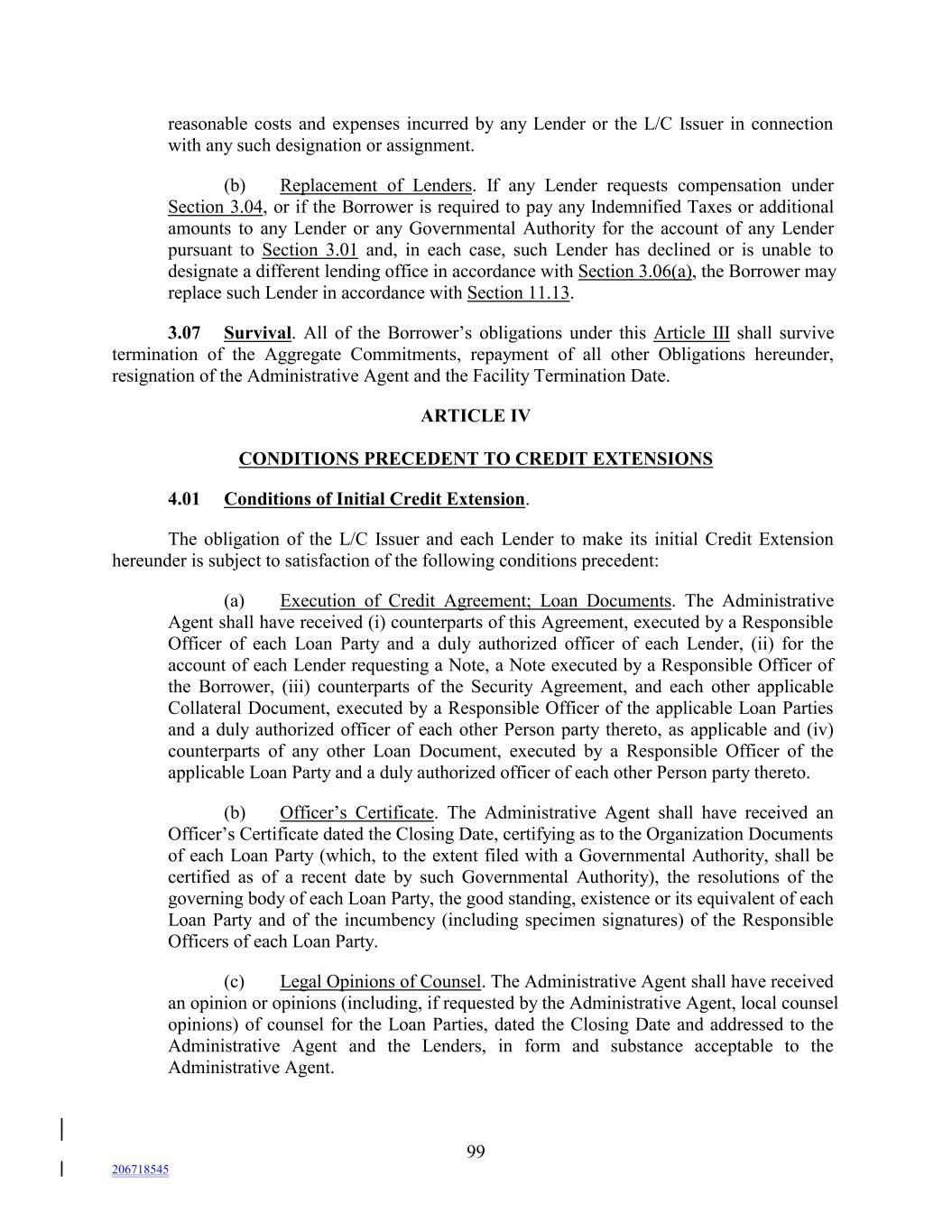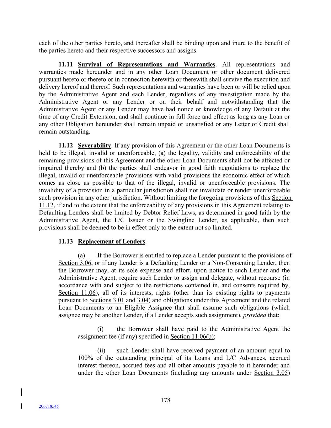 each of the other parties hereto, and thereafter shall be binding upon and inure to the benefit of the parties hereto and their respective successors and assigns. 11.11 Survival of Representations and Warranties. All representations and warranties made hereunder and in any other Loan Document or other document delivered pursuant hereto or thereto or in connection herewith or therewith shall survive the execution and delivery hereof and thereof. Such representations and warranties have been or will be relied upon by the Administrative Agent and each Lender, regardless of any investigation made by the Administrative Agent or any Lender or on their behalf and notwithstanding that the Administrative Agent or any Lender may have had notice or knowledge of any Default at the time of any Credit Extension, and shall continue in full force and effect as long as any Loan or any other Obligation hereunder shall remain unpaid or unsatisfied or any Letter of Credit shall remain outstanding. 11.12 Severability. If any provision of this Agreement or the other Loan Documents is held to be illegal, invalid or unenforceable, (a) the legality, validity and enforceability of the remaining provisions of this Agreement and the other Loan Documents shall not be affected or impaired thereby and (b) the parties shall endeavor in good faith negotiations to replace the illegal, invalid or unenforceable provisions with valid provisions the economic effect of which comes as close as possible to that of the illegal, invalid or unenforceable provisions. The invalidity of a provision in a particular jurisdiction shall not invalidate or render unenforceable such provision in any other jurisdiction. Without limiting the foregoing provisions of this Section 11.12, if and to the extent that the enforceability of any provisions in this Agreement relating to Defaulting Lenders shall be limited by Debtor Relief Laws, as determined in good faith by the Administrative Agent, the L/C Issuer or the Swingline Lender, as applicable, then such provisions shall be deemed to be in effect only to the extent not so limited. 11.13 Replacement of Lenders. (a) If the Borrower is entitled to replace a Lender pursuant to the provisions of Section 3.06, or if any Lender is a Defaulting Lender or a Non-Consenting Lender, then the Borrower may, at its sole expense and effort, upon notice to such Lender and the Administrative Agent, require such Lender to assign and delegate, without recourse (in accordance with and subject to the restrictions contained in, and consents required by, Section 11.06), all of its interests, rights (other than its existing rights to payments pursuant to Sections 3.01 and 3.04) and obligations under this Agreement and the related Loan Documents to an Eligible Assignee that shall assume such obligations (which assignee may be another Lender, if a Lender accepts such assignment), provided that: (i) the Borrower shall have paid to the Administrative Agent the assignment fee (if any) specified in Section 11.06(b); (ii) such Lender shall have received payment of an amount equal to 100% of the outstanding principal of its Loans and L/C Advances, accrued interest thereon, accrued fees and all other amounts payable to it hereunder and under the other Loan Documents (including any amounts under Section 3.05) 178 206718545