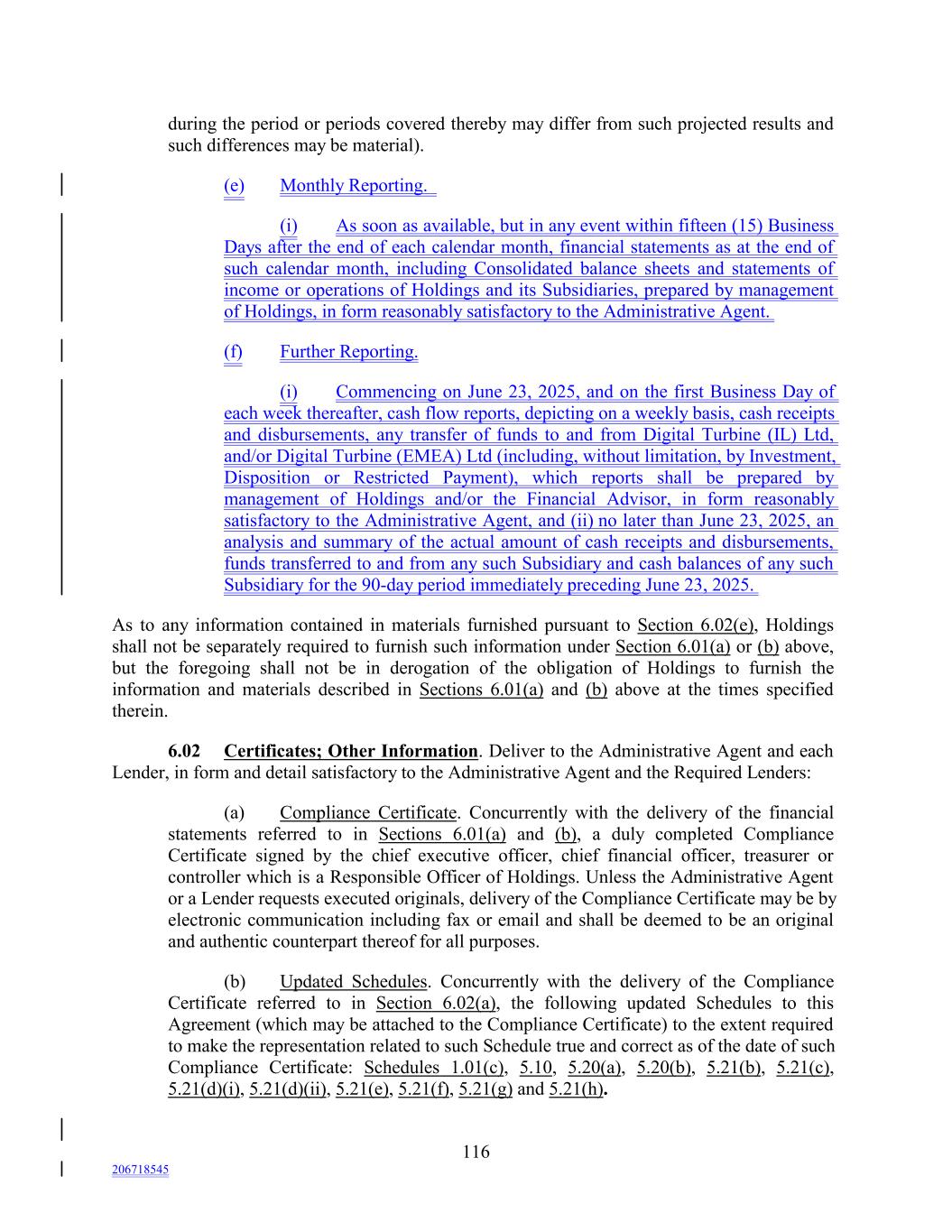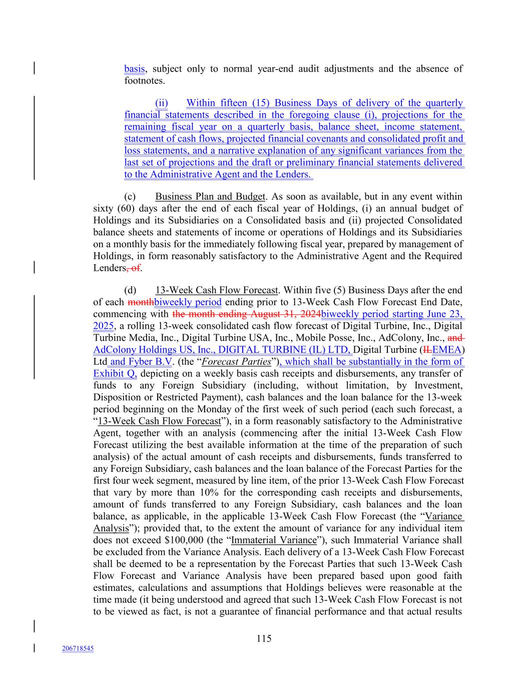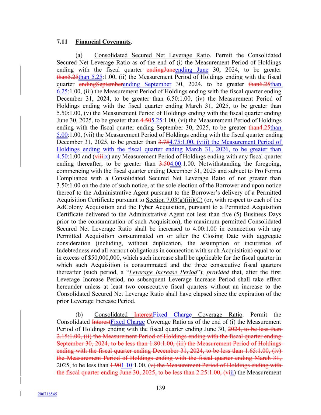 7.11 Financial Covenants. (a) Consolidated Secured Net Leverage Ratio. Permit the Consolidated Secured Net Leverage Ratio as of the end of (i) the Measurement Period of Holdings ending with the fiscal quarter endingJuneending June 30, 2024, to be greater than5.25than 5.25:1.00, (ii) the Measurement Period of Holdings ending with the fiscal quarter endingSeptemberending September 30, 2024, to be greater than6.25than 6.25:1.00, (iii) the Measurement Period of Holdings ending with the fiscal quarter ending December 31, 2024, to be greater than 6.50:1.00, (iv) the Measurement Period of Holdings ending with the fiscal quarter ending March 31, 2025, to be greater than 5.50:1.00, (v) the Measurement Period of Holdings ending with the fiscal quarter ending June 30, 2025, to be greater than 4.505.25:1.00, (vi) the Measurement Period of Holdings ending with the fiscal quarter ending September 30, 2025, to be greater than4.25than 5.00:1.00, (vii) the Measurement Period of Holdings ending with the fiscal quarter ending December 31, 2025, to be greater than 3.754.75:1.00, (viii) the Measurement Period of Holdings ending with the fiscal quarter ending March 31, 2026, to be greater than 4.50:1.00 and (viiiix) any Measurement Period of Holdings ending with any fiscal quarter ending thereafter, to be greater than 3.504.00:1.00. Notwithstanding the foregoing, commencing with the fiscal quarter ending December 31, 2025 and subject to Pro Forma Compliance with a Consolidated Secured Net Leverage Ratio of not greater than 3.50:1.00 on the date of such notice, at the sole election of the Borrower and upon notice thereof to the Administrative Agent pursuant to the Borrower’s delivery of a Permitted Acquisition Certificate pursuant to Section 7.03(g)(iii)(C) (or, with respect to each of the AdColony Acquisition and the Fyber Acquisition, pursuant to a Permitted Acquisition Certificate delivered to the Administrative Agent not less than five (5) Business Days prior to the consummation of such Acquisition), the maximum permitted Consolidated Secured Net Leverage Ratio shall be increased to 4.00:1.00 in connection with any Permitted Acquisition consummated on or after the Closing Date with aggregate consideration (including, without duplication, the assumption or incurrence of Indebtedness and all earnout obligations in connection with such Acquisition) equal to or in excess of $50,000,000, which such increase shall be applicable for the fiscal quarter in which such Acquisition is consummated and the three consecutive fiscal quarters thereafter (such period, a “Leverage Increase Period”); provided that, after the first Leverage Increase Period, no subsequent Leverage Increase Period shall take effect hereunder unless at least two consecutive fiscal quarters without an increase to the Consolidated Secured Net Leverage Ratio shall have elapsed since the expiration of the prior Leverage Increase Period. (b) Consolidated InterestFixed Charge Coverage Ratio. Permit the Consolidated InterestFixed Charge Coverage Ratio as of the end of (i) the Measurement Period of Holdings ending with the fiscal quarter ending June 30, 2024, to be less than 2.15:1.00, (ii) the Measurement Period of Holdings ending with the fiscal quarter ending September 30, 2024, to be less than 1.80:1.00, (iii) the Measurement Period of Holdings ending with the fiscal quarter ending December 31, 2024, to be less than 1.65:1.00, (iv) the Measurement Period of Holdings ending with the fiscal quarter ending March 31, 2025, to be less than 1.901.10:1.00, (v) the Measurement Period of Holdings ending with the fiscal quarter ending June 30, 2025, to be less than 2.25:1.00, (viii) the Measurement 139 206718545