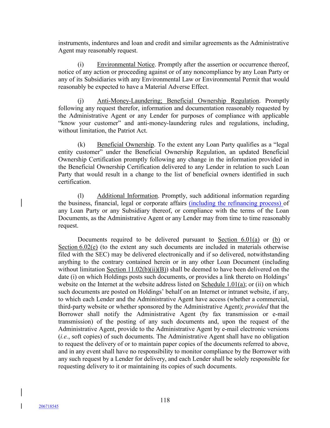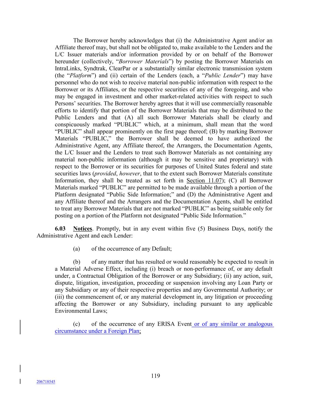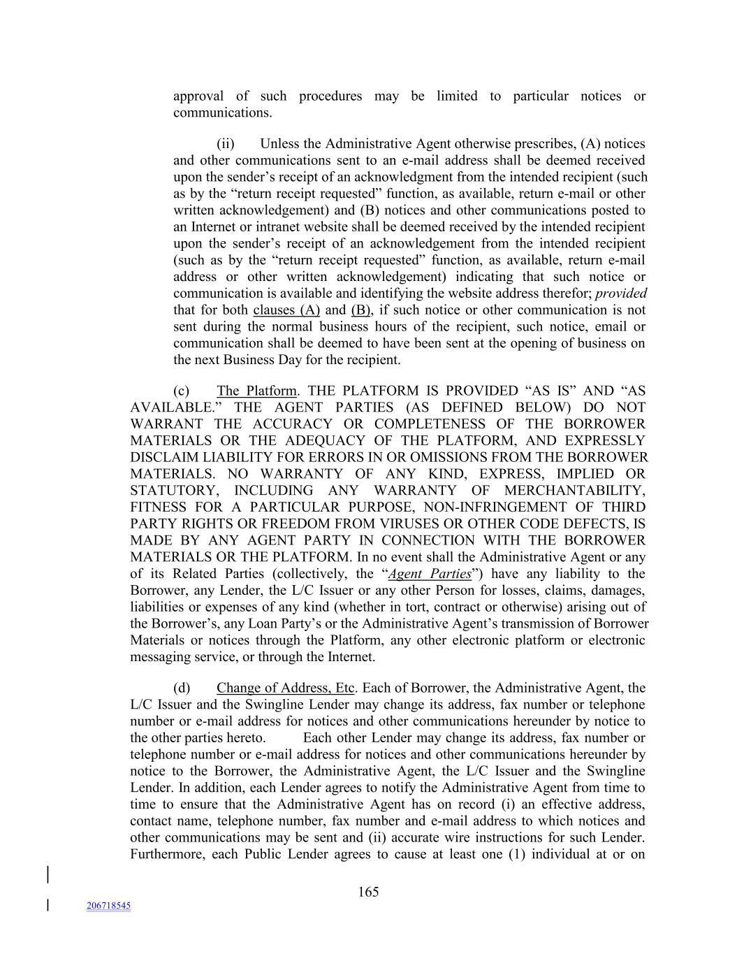 approval of such procedures may be limited to particular notices or communications. (ii) Unless the Administrative Agent otherwise prescribes, (A) notices and other communications sent to an e-mail address shall be deemed received upon the sender’s receipt of an acknowledgment from the intended recipient (such as by the “return receipt requested” function, as available, return e-mail or other written acknowledgement) and (B) notices and other communications posted to an Internet or intranet website shall be deemed received by the intended recipient upon the sender’s receipt of an acknowledgement from the intended recipient (such as by the “return receipt requested” function, as available, return e-mail address or other written acknowledgement) indicating that such notice or communication is available and identifying the website address therefor; provided that for both clauses (A) and (B), if such notice or other communication is not sent during the normal business hours of the recipient, such notice, email or communication shall be deemed to have been sent at the opening of business on the next Business Day for the recipient. (c) The Platform. THE PLATFORM IS PROVIDED “AS IS” AND “AS AVAILABLE.” THE AGENT PARTIES (AS DEFINED BELOW) DO NOT WARRANT THE ACCURACY OR COMPLETENESS OF THE BORROWER MATERIALS OR THE ADEQUACY OF THE PLATFORM, AND EXPRESSLY DISCLAIM LIABILITY FOR ERRORS IN OR OMISSIONS FROM THE BORROWER MATERIALS. NO WARRANTY OF ANY KIND, EXPRESS, IMPLIED OR STATUTORY, INCLUDING ANY WARRANTY OF MERCHANTABILITY, FITNESS FOR A PARTICULAR PURPOSE, NON-INFRINGEMENT OF THIRD PARTY RIGHTS OR FREEDOM FROM VIRUSES OR OTHER CODE DEFECTS, IS MADE BY ANY AGENT PARTY IN CONNECTION WITH THE BORROWER MATERIALS OR THE PLATFORM. In no event shall the Administrative Agent or any of its Related Parties (collectively, the “Agent Parties”) have any liability to the Borrower, any Lender, the L/C Issuer or any other Person for losses, claims, damages, liabilities or expenses of any kind (whether in tort, contract or otherwise) arising out of the Borrower’s, any Loan Party’s or the Administrative Agent’s transmission of Borrower Materials or notices through the Platform, any other electronic platform or electronic messaging service, or through the Internet. (d) Change of Address, Etc. Each of Borrower, the Administrative Agent, the L/C Issuer and the Swingline Lender may change its address, fax number or telephone number or e-mail address for notices and other communications hereunder by notice to the other parties hereto. Each other Lender may change its address, fax number or telephone number or e-mail address for notices and other communications hereunder by notice to the Borrower, the Administrative Agent, the L/C Issuer and the Swingline Lender. In addition, each Lender agrees to notify the Administrative Agent from time to time to ensure that the Administrative Agent has on record (i) an effective address, contact name, telephone number, fax number and e-mail address to which notices and other communications may be sent and (ii) accurate wire instructions for such Lender. Furthermore, each Public Lender agrees to cause at least one (1) individual at or on 165 206718545