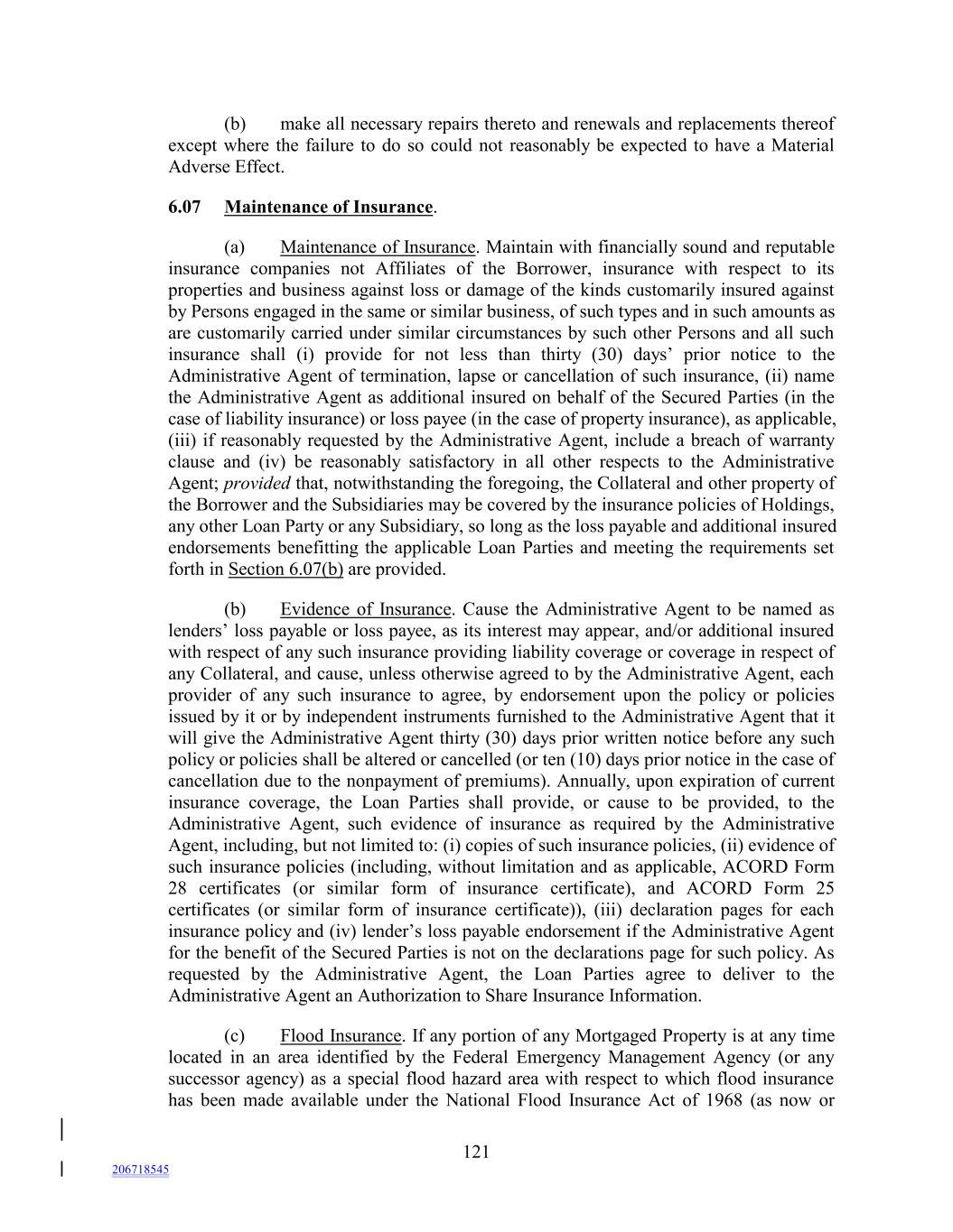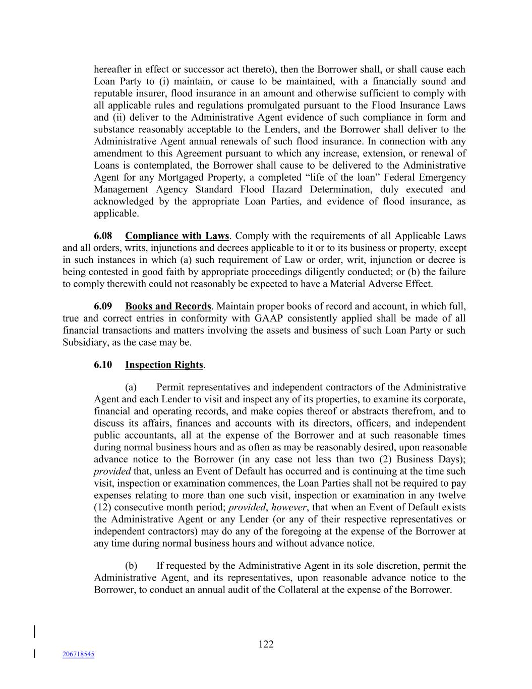 and so-called comprehensive coverage over covenants and restrictions), to the extent such endorsements are available in the applicable jurisdiction at commercially reasonable rates, (iii) opinions from local counsel in each jurisdiction (A) where a Mortgaged Property is located regarding the enforceability and perfection of the Mortgage and any related fixture filings and (B) where the applicable Loan Party granting the Mortgage on said Mortgaged Property is organized, regarding the due authorization, execution and delivery of such Mortgage, and in each case, such other matters as may be in form and substance reasonably satisfactory to the Administrative Agent, (iv) a completed “life of the loan” Federal Emergency Management Agency Standard Flood Hazard Determination with respect to each Mortgaged Property (together with a notice about special flood hazard area status and flood disaster assistance), duly executed and acknowledged by the appropriate Loan Parties, together with evidence of flood insurance, to the extent required under Section 6.07(c) hereof; provided that no mortgage over a Material Real Property may be executed unless the Administrative Agent has received such Standard Flood Hazard Determination and all other information needed to satisfy the Lenders’ flood insurance requirements, in each case, with respect to such Material Real Property, and (v) a new ALTA or such existing surveys together with no-change affidavits sufficient for the title company to remove all standard survey exceptions from the Mortgage Policies and issue the endorsements required in clause (ii) above. “Collateral Documents” means, collectively, the Security Agreement, the Qualifying Control Agreements, each Joinder Agreement, each Mortgage, each of the collateral assignments, security agreements, pledge agreements, account control agreements or other similar agreements delivered to the Administrative Agent pursuant to Section 6.14, the Foreign Collateral Documents, and each of the other agreements, instruments or documents that creates or purports to create a Lien in favor of the Administrative Agent for the benefit of the Secured Parties. “Commitment” means a Revolving Commitment and/or an Incremental Term Loan Commitment, as the context may require. “Commitment Fee” has the meaning specified in Section 2.09(a). “Commodity Exchange Act” means the Commodity Exchange Act (7 U.S.C. § 1 et seq.), as amended from time to time, and any successor statute. “Communication” means this Agreement, any Loan Document and any document, amendment, approval, consent, information, notice, certificate, request, statement, disclosure or authorization related to any Loan Document. “Compliance Certificate” means a certificate substantially in the form of Exhibit C. “Conforming Changes” means, with respect to the use, administration of or any conventions associated with SOFR or any proposed Successor Rate or Term SOFR, as applicable, any conforming changes to the definitions of “Base Rate”, “SOFR”, “Term SOFR” and “Interest Period”, timing and frequency of determining rates and making payments of interest and other technical, administrative or operational matters (including, for the avoidance of 13 206718545