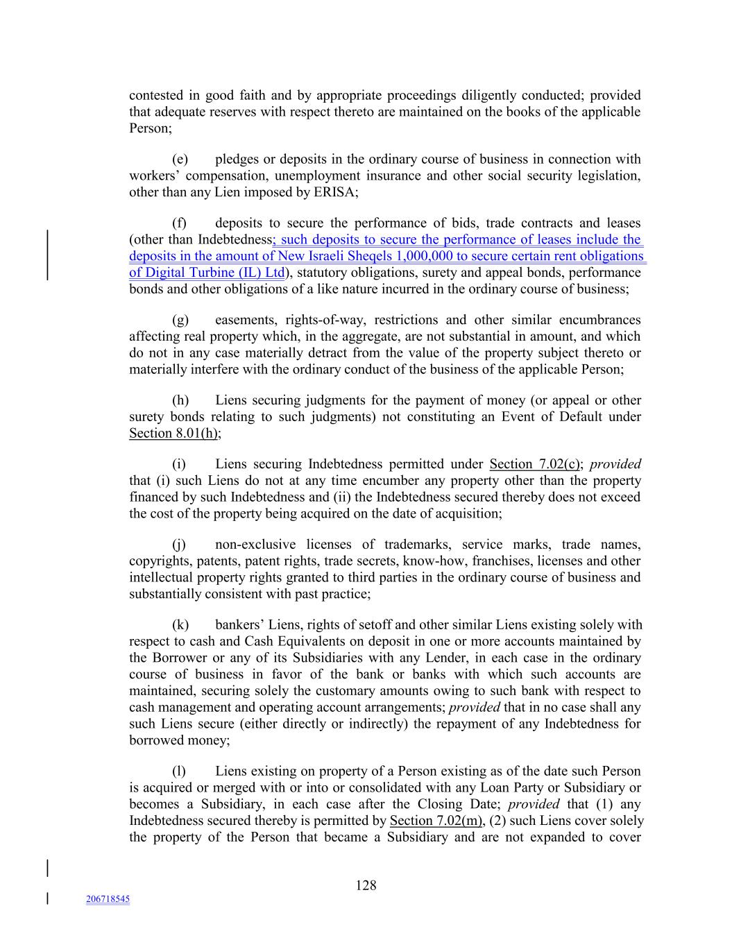 contested in good faith and by appropriate proceedings diligently conducted; provided that adequate reserves with respect thereto are maintained on the books of the applicable Person; (e) pledges or deposits in the ordinary course of business in connection with workers’ compensation, unemployment insurance and other social security legislation, other than any Lien imposed by ERISA; (f) deposits to secure the performance of bids, trade contracts and leases (other than Indebtedness; such deposits to secure the performance of leases include the deposits in the amount of New Israeli Sheqels 1,000,000 to secure certain rent obligations of Digital Turbine (IL) Ltd), statutory obligations, surety and appeal bonds, performance bonds and other obligations of a like nature incurred in the ordinary course of business; (g) easements, rights-of-way, restrictions and other similar encumbrances affecting real property which, in the aggregate, are not substantial in amount, and which do not in any case materially detract from the value of the property subject thereto or materially interfere with the ordinary conduct of the business of the applicable Person; (h) Liens securing judgments for the payment of money (or appeal or other surety bonds relating to such judgments) not constituting an Event of Default under Section 8.01(h); (i) Liens securing Indebtedness permitted under Section 7.02(c); provided that (i) such Liens do not at any time encumber any property other than the property financed by such Indebtedness and (ii) the Indebtedness secured thereby does not exceed the cost of the property being acquired on the date of acquisition; (j) non-exclusive licenses of trademarks, service marks, trade names, copyrights, patents, patent rights, trade secrets, know-how, franchises, licenses and other intellectual property rights granted to third parties in the ordinary course of business and substantially consistent with past practice; (k) bankers’ Liens, rights of setoff and other similar Liens existing solely with respect to cash and Cash Equivalents on deposit in one or more accounts maintained by the Borrower or any of its Subsidiaries with any Lender, in each case in the ordinary course of business in favor of the bank or banks with which such accounts are maintained, securing solely the customary amounts owing to such bank with respect to cash management and operating account arrangements; provided that in no case shall any such Liens secure (either directly or indirectly) the repayment of any Indebtedness for borrowed money; (l) Liens existing on property of a Person existing as of the date such Person is acquired or merged with or into or consolidated with any Loan Party or Subsidiary or becomes a Subsidiary, in each case after the Closing Date; provided that (1) any Indebtedness secured thereby is permitted by Section 7.02(m), (2) such Liens cover solely the property of the Person that became a Subsidiary and are not expanded to cover 128 206718545