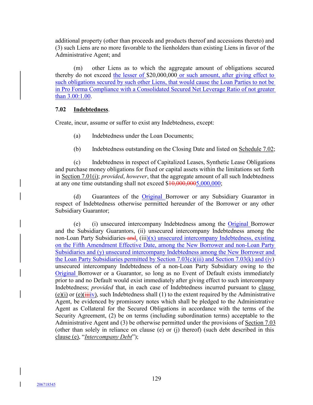 additional property (other than proceeds and products thereof and accessions thereto) and (3) such Liens are no more favorable to the lienholders than existing Liens in favor of the Administrative Agent; and (m) other Liens as to which the aggregate amount of obligations secured thereby do not exceed the lesser of $20,000,000 or such amount, after giving effect to such obligations secured by such other Liens, that would cause the Loan Parties to not be in Pro Forma Compliance with a Consolidated Secured Net Leverage Ratio of not greater than 3.00:1.00. 7.02 Indebtedness. Create, incur, assume or suffer to exist any Indebtedness, except: (a) Indebtedness under the Loan Documents; (b) Indebtedness outstanding on the Closing Date and listed on Schedule 7.02; (c) Indebtedness in respect of Capitalized Leases, Synthetic Lease Obligations and purchase money obligations for fixed or capital assets within the limitations set forth in Section 7.01(i); provided, however, that the aggregate amount of all such Indebtedness at any one time outstanding shall not exceed $10,000,0005,000,000; (d) Guarantees of the Original Borrower or any Subsidiary Guarantor in respect of Indebtedness otherwise permitted hereunder of the Borrower or any other Subsidiary Guarantor; (e) (i) unsecured intercompany Indebtedness among the Original Borrower and the Subsidiary Guarantors, (ii) unsecured intercompany Indebtedness among the non-Loan Party Subsidiaries and, (iii)(x) unsecured intercompany Indebtedness, existing on the Fifth Amendment Effective Date, among the New Borrower and non-Loan Party Subsidiaries and (y) unsecured intercompany Indebtedness among the New Borrower and the Loan Party Subsidiaries permitted by Section 7.03(c)(iii) and Section 7.03(k) and (iv) unsecured intercompany Indebtedness of a non-Loan Party Subsidiary owing to the Original Borrower or a Guarantor, so long as no Event of Default exists immediately prior to and no Default would exist immediately after giving effect to such intercompany Indebtedness; provided that, in each case of Indebtedness incurred pursuant to clause (e)(i) or (e)(iiiiv), such Indebtedness shall (1) to the extent required by the Administrative Agent, be evidenced by promissory notes which shall be pledged to the Administrative Agent as Collateral for the Secured Obligations in accordance with the terms of the Security Agreement, (2) be on terms (including subordination terms) acceptable to the Administrative Agent and (3) be otherwise permitted under the provisions of Section 7.03 (other than solely in reliance on clause (e) or (j) thereof) (such debt described in this clause (e), “Intercompany Debt”); 129 206718545