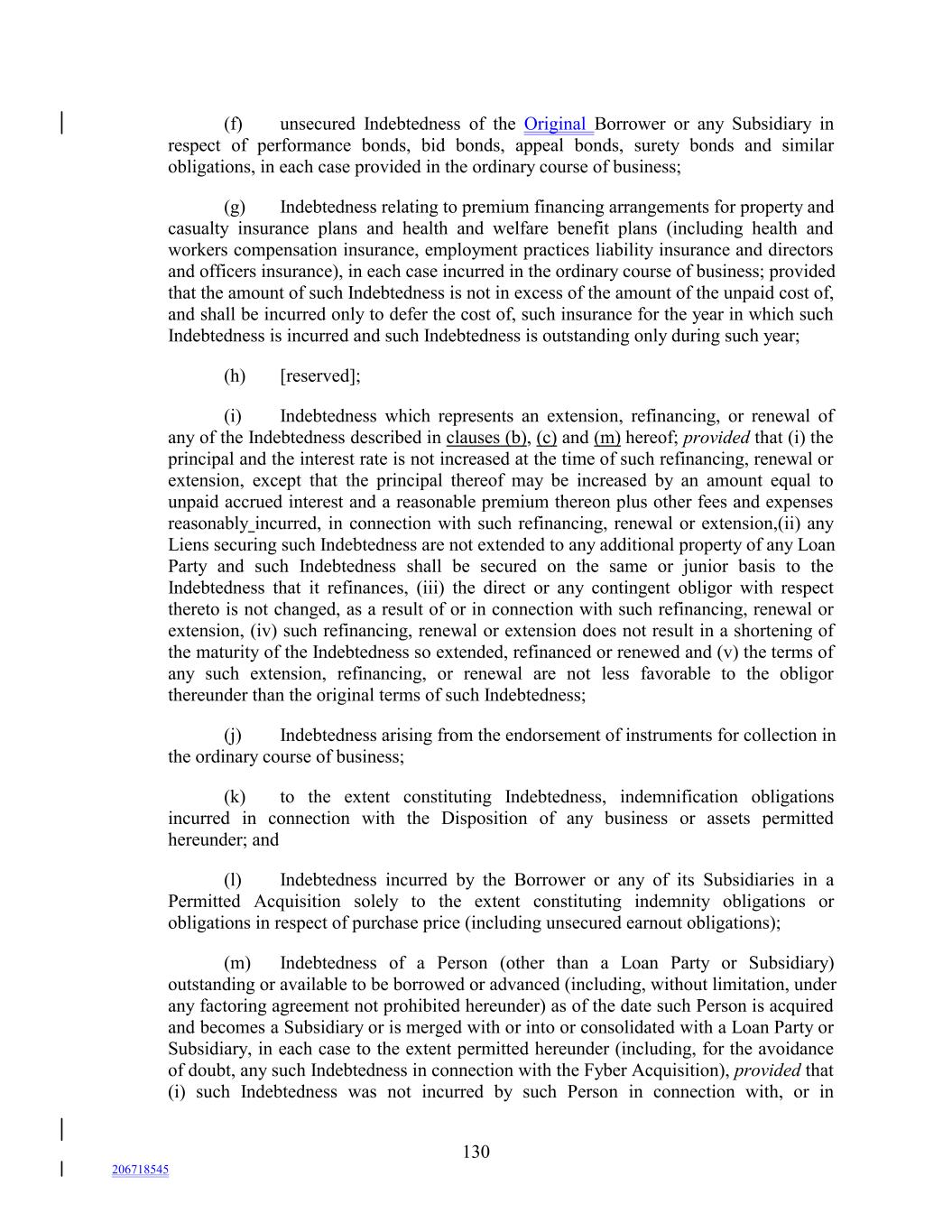 (f) unsecured Indebtedness of the Original Borrower or any Subsidiary in respect of performance bonds, bid bonds, appeal bonds, surety bonds and similar obligations, in each case provided in the ordinary course of business; (g) Indebtedness relating to premium financing arrangements for property and casualty insurance plans and health and welfare benefit plans (including health and workers compensation insurance, employment practices liability insurance and directors and officers insurance), in each case incurred in the ordinary course of business; provided that the amount of such Indebtedness is not in excess of the amount of the unpaid cost of, and shall be incurred only to defer the cost of, such insurance for the year in which such Indebtedness is incurred and such Indebtedness is outstanding only during such year; (h) [reserved]; (i) Indebtedness which represents an extension, refinancing, or renewal of any of the Indebtedness described in clauses (b), (c) and (m) hereof; provided that (i) the principal and the interest rate is not increased at the time of such refinancing, renewal or extension, except that the principal thereof may be increased by an amount equal to unpaid accrued interest and a reasonable premium thereon plus other fees and expenses reasonably incurred, in connection with such refinancing, renewal or extension,(ii) any Liens securing such Indebtedness are not extended to any additional property of any Loan Party and such Indebtedness shall be secured on the same or junior basis to the Indebtedness that it refinances, (iii) the direct or any contingent obligor with respect thereto is not changed, as a result of or in connection with such refinancing, renewal or extension, (iv) such refinancing, renewal or extension does not result in a shortening of the maturity of the Indebtedness so extended, refinanced or renewed and (v) the terms of any such extension, refinancing, or renewal are not less favorable to the obligor thereunder than the original terms of such Indebtedness; (j) Indebtedness arising from the endorsement of instruments for collection in the ordinary course of business; (k) to the extent constituting Indebtedness, indemnification obligations incurred in connection with the Disposition of any business or assets permitted hereunder; and (l) Indebtedness incurred by the Borrower or any of its Subsidiaries in a Permitted Acquisition solely to the extent constituting indemnity obligations or obligations in respect of purchase price (including unsecured earnout obligations); (m) Indebtedness of a Person (other than a Loan Party or Subsidiary) outstanding or available to be borrowed or advanced (including, without limitation, under any factoring agreement not prohibited hereunder) as of the date such Person is acquired and becomes a Subsidiary or is merged with or into or consolidated with a Loan Party or Subsidiary, in each case to the extent permitted hereunder (including, for the avoidance of doubt, any such Indebtedness in connection with the Fyber Acquisition), provided that (i) such Indebtedness was not incurred by such Person in connection with, or in 130 206718545