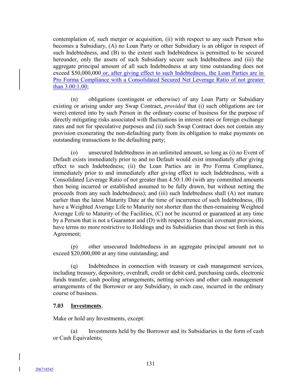 contemplation of, such merger or acquisition, (ii) with respect to any such Person who becomes a Subsidiary, (A) no Loan Party or other Subsidiary is an obligor in respect of such Indebtedness, and (B) to the extent such Indebtedness is permitted to be secured hereunder, only the assets of such Subsidiary secure such Indebtedness and (iii) the aggregate principal amount of all such Indebtedness at any time outstanding does not exceed $50,000,000 or, after giving effect to such Indebtedness, the Loan Parties are in Pro Forma Compliance with a Consolidated Secured Net Leverage Ratio of not greater than 3.00:1.00; (n) obligations (contingent or otherwise) of any Loan Party or Subsidiary existing or arising under any Swap Contract, provided that (i) such obligations are (or were) entered into by such Person in the ordinary course of business for the purpose of directly mitigating risks associated with fluctuations in interest rates or foreign exchange rates and not for speculative purposes and (ii) such Swap Contract does not contain any provision exonerating the non-defaulting party from its obligation to make payments on outstanding transactions to the defaulting party; (o) unsecured Indebtedness in an unlimited amount, so long as (i) no Event of Default exists immediately prior to and no Default would exist immediately after giving effect to such Indebtedness; (ii) the Loan Parties are in Pro Forma Compliance, immediately prior to and immediately after giving effect to such Indebtedness, with a Consolidated Leverage Ratio of not greater than 4.50:1.00 (with any committed amounts then being incurred or established assumed to be fully drawn, but without netting the proceeds from any such Indebtedness); and (iii) such Indebtedness shall (A) not mature earlier than the latest Maturity Date at the time of incurrence of such Indebtedness, (B) have a Weighted Average Life to Maturity not shorter than the then-remaining Weighted Average Life to Maturity of the Facilities, (C) not be incurred or guaranteed at any time by a Person that is not a Guarantor and (D) with respect to financial covenant provisions, have terms no more restrictive to Holdings and its Subsidiaries than those set forth in this Agreement; (p) other unsecured Indebtedness in an aggregate principal amount not to exceed $20,000,000 at any time outstanding; and (q) Indebtedness in connection with treasury or cash management services, including treasury, depository, overdraft, credit or debit card, purchasing cards, electronic funds transfer, cash pooling arrangements, netting services and other cash management arrangements of the Borrower or any Subsidiary, in each case, incurred in the ordinary course of business. 7.03 Investments. Make or hold any Investments, except: (a) Investments held by the Borrower and its Subsidiaries in the form of cash or Cash Equivalents; 131 206718545