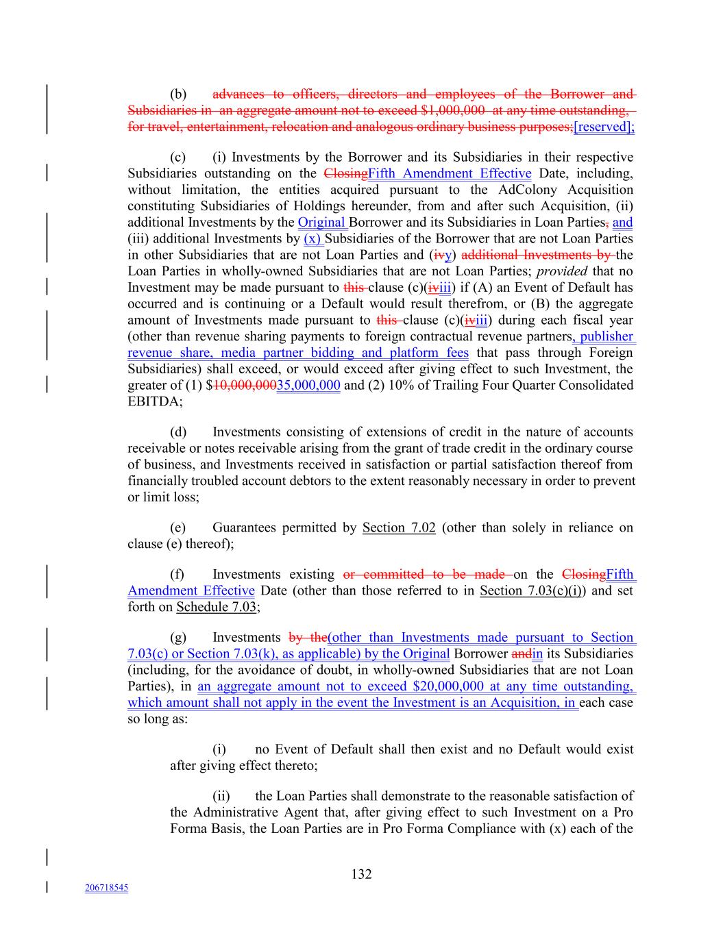 (b) advances to officers, directors and employees of the Borrower and Subsidiaries in an aggregate amount not to exceed $1,000,000 at any time outstanding, for travel, entertainment, relocation and analogous ordinary business purposes;[reserved]; (c) (i) Investments by the Borrower and its Subsidiaries in their respective Subsidiaries outstanding on the ClosingFifth Amendment Effective Date, including, without limitation, the entities acquired pursuant to the AdColony Acquisition constituting Subsidiaries of Holdings hereunder, from and after such Acquisition, (ii) additional Investments by the Original Borrower and its Subsidiaries in Loan Parties, and (iii) additional Investments by (x) Subsidiaries of the Borrower that are not Loan Parties in other Subsidiaries that are not Loan Parties and (ivy) additional Investments by the Loan Parties in wholly-owned Subsidiaries that are not Loan Parties; provided that no Investment may be made pursuant to this clause (c)(iviii) if (A) an Event of Default has occurred and is continuing or a Default would result therefrom, or (B) the aggregate amount of Investments made pursuant to this clause (c)(iviii) during each fiscal year (other than revenue sharing payments to foreign contractual revenue partners, publisher revenue share, media partner bidding and platform fees that pass through Foreign Subsidiaries) shall exceed, or would exceed after giving effect to such Investment, the greater of (1) $10,000,00035,000,000 and (2) 10% of Trailing Four Quarter Consolidated EBITDA; (d) Investments consisting of extensions of credit in the nature of accounts receivable or notes receivable arising from the grant of trade credit in the ordinary course of business, and Investments received in satisfaction or partial satisfaction thereof from financially troubled account debtors to the extent reasonably necessary in order to prevent or limit loss; (e) Guarantees permitted by Section 7.02 (other than solely in reliance on clause (e) thereof); (f) Investments existing or committed to be made on the ClosingFifth Amendment Effective Date (other than those referred to in Section 7.03(c)(i)) and set forth on Schedule 7.03; (g) Investments by the(other than Investments made pursuant to Section 7.03(c) or Section 7.03(k), as applicable) by the Original Borrower andin its Subsidiaries (including, for the avoidance of doubt, in wholly-owned Subsidiaries that are not Loan Parties), in an aggregate amount not to exceed $20,000,000 at any time outstanding, which amount shall not apply in the event the Investment is an Acquisition, in each case so long as: (i) no Event of Default shall then exist and no Default would exist after giving effect thereto; (ii) the Loan Parties shall demonstrate to the reasonable satisfaction of the Administrative Agent that, after giving effect to such Investment on a Pro Forma Basis, the Loan Parties are in Pro Forma Compliance with (x) each of the 132 206718545
