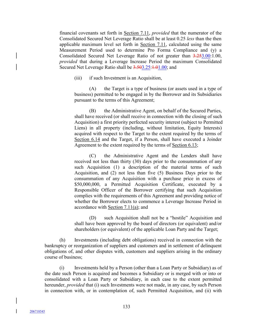 financial covenants set forth in Section 7.11, provided that the numerator of the Consolidated Secured Net Leverage Ratio shall be at least 0.25 less than the then applicable maximum level set forth in Section 7.11, calculated using the same Measurement Period used to determine Pro Forma Compliance and (y) a Consolidated Secured Net Leverage Ratio of not greater than 3.253.00:1.00, provided that during a Leverage Increase Period the maximum Consolidated Secured Net Leverage Ratio shall be 3.503.25:1.01.00; and (iii) if such Investment is an Acquisition, (A) the Target is a type of business (or assets used in a type of business) permitted to be engaged in by the Borrower and its Subsidiaries pursuant to the terms of this Agreement; (B) the Administrative Agent, on behalf of the Secured Parties, shall have received (or shall receive in connection with the closing of such Acquisition) a first priority perfected security interest (subject to Permitted Liens) in all property (including, without limitation, Equity Interests) acquired with respect to the Target to the extent required by the terms of Section 6.14 and the Target, if a Person, shall have executed a Joinder Agreement to the extent required by the terms of Section 6.13; (C) the Administrative Agent and the Lenders shall have received not less than thirty (30) days prior to the consummation of any such Acquisition (1) a description of the material terms of such Acquisition, and (2) not less than five (5) Business Days prior to the consummation of any Acquisition with a purchase price in excess of $50,000,000, a Permitted Acquisition Certificate, executed by a Responsible Officer of the Borrower certifying that such Acquisition complies with the requirements of this Agreement and providing notice of whether the Borrower elects to commence a Leverage Increase Period in accordance with Section 7.11(a); and (D) such Acquisition shall not be a “hostile” Acquisition and shall have been approved by the board of directors (or equivalent) and/or shareholders (or equivalent) of the applicable Loan Party and the Target; (h) Investments (including debt obligations) received in connection with the bankruptcy or reorganization of suppliers and customers and in settlement of delinquent obligations of, and other disputes with, customers and suppliers arising in the ordinary course of business; (i) Investments held by a Person (other than a Loan Party or Subsidiary) as of the date such Person is acquired and becomes a Subsidiary or is merged with or into or consolidated with a Loan Party or Subsidiary, in each case to the extent permitted hereunder, provided that (i) such Investments were not made, in any case, by such Person in connection with, or in contemplation of, such Permitted Acquisition, and (ii) with 133 206718545