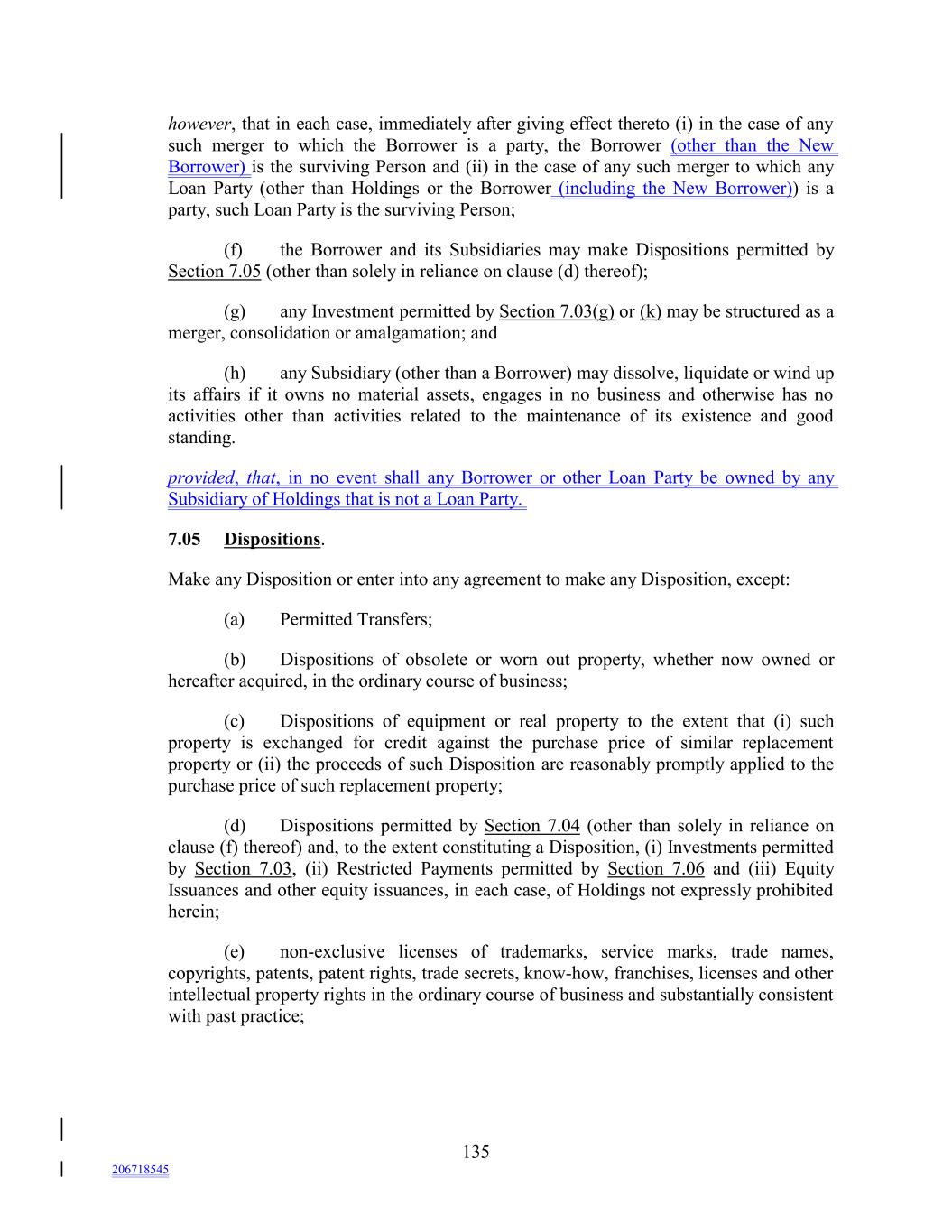 however, that in each case, immediately after giving effect thereto (i) in the case of any such merger to which the Borrower is a party, the Borrower (other than the New Borrower) is the surviving Person and (ii) in the case of any such merger to which any Loan Party (other than Holdings or the Borrower (including the New Borrower)) is a party, such Loan Party is the surviving Person; (f) the Borrower and its Subsidiaries may make Dispositions permitted by Section 7.05 (other than solely in reliance on clause (d) thereof); (g) any Investment permitted by Section 7.03(g) or (k) may be structured as a merger, consolidation or amalgamation; and (h) any Subsidiary (other than a Borrower) may dissolve, liquidate or wind up its affairs if it owns no material assets, engages in no business and otherwise has no activities other than activities related to the maintenance of its existence and good standing. provided, that, in no event shall any Borrower or other Loan Party be owned by any Subsidiary of Holdings that is not a Loan Party. 7.05 Dispositions. Make any Disposition or enter into any agreement to make any Disposition, except: (a) Permitted Transfers; (b) Dispositions of obsolete or worn out property, whether now owned or hereafter acquired, in the ordinary course of business; (c) Dispositions of equipment or real property to the extent that (i) such property is exchanged for credit against the purchase price of similar replacement property or (ii) the proceeds of such Disposition are reasonably promptly applied to the purchase price of such replacement property; (d) Dispositions permitted by Section 7.04 (other than solely in reliance on clause (f) thereof) and, to the extent constituting a Disposition, (i) Investments permitted by Section 7.03, (ii) Restricted Payments permitted by Section 7.06 and (iii) Equity Issuances and other equity issuances, in each case, of Holdings not expressly prohibited herein; (e) non-exclusive licenses of trademarks, service marks, trade names, copyrights, patents, patent rights, trade secrets, know-how, franchises, licenses and other intellectual property rights in the ordinary course of business and substantially consistent with past practice; 135 206718545