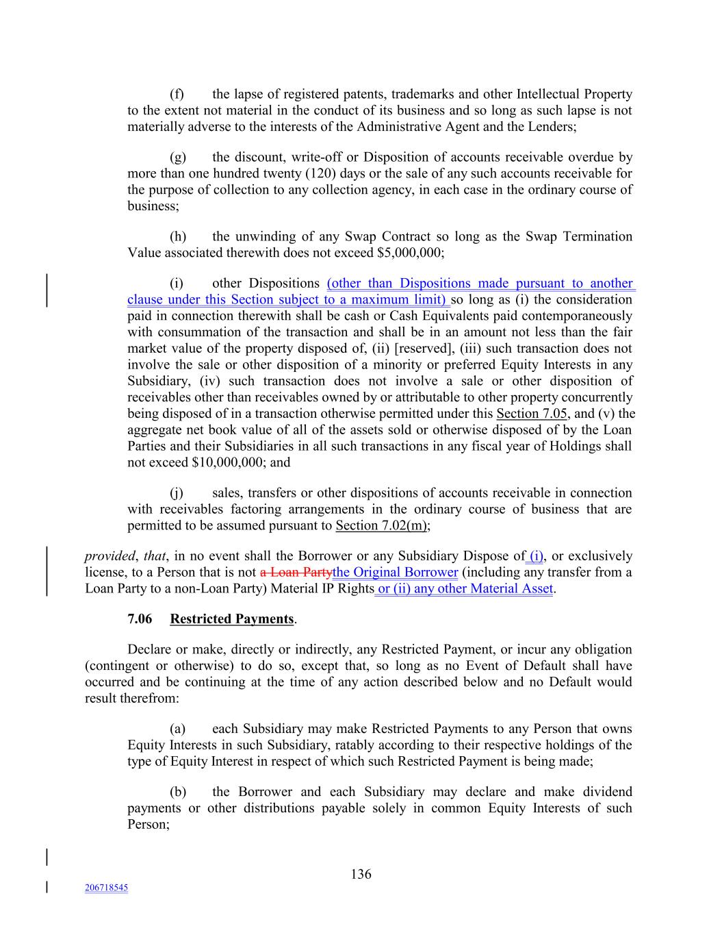 (f) the lapse of registered patents, trademarks and other Intellectual Property to the extent not material in the conduct of its business and so long as such lapse is not materially adverse to the interests of the Administrative Agent and the Lenders; (g) the discount, write-off or Disposition of accounts receivable overdue by more than one hundred twenty (120) days or the sale of any such accounts receivable for the purpose of collection to any collection agency, in each case in the ordinary course of business; (h) the unwinding of any Swap Contract so long as the Swap Termination Value associated therewith does not exceed $5,000,000; (i) other Dispositions (other than Dispositions made pursuant to another clause under this Section subject to a maximum limit) so long as (i) the consideration paid in connection therewith shall be cash or Cash Equivalents paid contemporaneously with consummation of the transaction and shall be in an amount not less than the fair market value of the property disposed of, (ii) [reserved], (iii) such transaction does not involve the sale or other disposition of a minority or preferred Equity Interests in any Subsidiary, (iv) such transaction does not involve a sale or other disposition of receivables other than receivables owned by or attributable to other property concurrently being disposed of in a transaction otherwise permitted under this Section 7.05, and (v) the aggregate net book value of all of the assets sold or otherwise disposed of by the Loan Parties and their Subsidiaries in all such transactions in any fiscal year of Holdings shall not exceed $10,000,000; and (j) sales, transfers or other dispositions of accounts receivable in connection with receivables factoring arrangements in the ordinary course of business that are permitted to be assumed pursuant to Section 7.02(m); provided, that, in no event shall the Borrower or any Subsidiary Dispose of (i), or exclusively license, to a Person that is not a Loan Partythe Original Borrower (including any transfer from a Loan Party to a non-Loan Party) Material IP Rights or (ii) any other Material Asset. 7.06 Restricted Payments. Declare or make, directly or indirectly, any Restricted Payment, or incur any obligation (contingent or otherwise) to do so, except that, so long as no Event of Default shall have occurred and be continuing at the time of any action described below and no Default would result therefrom: (a) each Subsidiary may make Restricted Payments to any Person that owns Equity Interests in such Subsidiary, ratably according to their respective holdings of the type of Equity Interest in respect of which such Restricted Payment is being made; (b) the Borrower and each Subsidiary may declare and make dividend payments or other distributions payable solely in common Equity Interests of such Person; 136 206718545