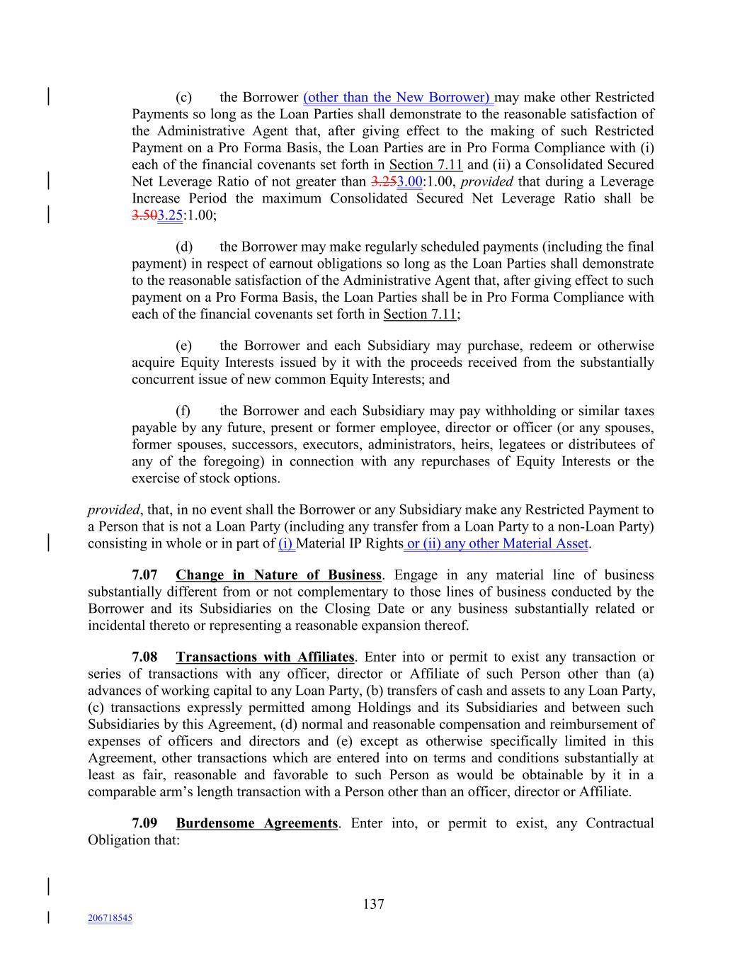 (c) the Borrower (other than the New Borrower) may make other Restricted Payments so long as the Loan Parties shall demonstrate to the reasonable satisfaction of the Administrative Agent that, after giving effect to the making of such Restricted Payment on a Pro Forma Basis, the Loan Parties are in Pro Forma Compliance with (i) each of the financial covenants set forth in Section 7.11 and (ii) a Consolidated Secured Net Leverage Ratio of not greater than 3.253.00:1.00, provided that during a Leverage Increase Period the maximum Consolidated Secured Net Leverage Ratio shall be 3.503.25:1.00; (d) the Borrower may make regularly scheduled payments (including the final payment) in respect of earnout obligations so long as the Loan Parties shall demonstrate to the reasonable satisfaction of the Administrative Agent that, after giving effect to such payment on a Pro Forma Basis, the Loan Parties shall be in Pro Forma Compliance with each of the financial covenants set forth in Section 7.11; (e) the Borrower and each Subsidiary may purchase, redeem or otherwise acquire Equity Interests issued by it with the proceeds received from the substantially concurrent issue of new common Equity Interests; and (f) the Borrower and each Subsidiary may pay withholding or similar taxes payable by any future, present or former employee, director or officer (or any spouses, former spouses, successors, executors, administrators, heirs, legatees or distributees of any of the foregoing) in connection with any repurchases of Equity Interests or the exercise of stock options. provided, that, in no event shall the Borrower or any Subsidiary make any Restricted Payment to a Person that is not a Loan Party (including any transfer from a Loan Party to a non-Loan Party) consisting in whole or in part of (i) Material IP Rights or (ii) any other Material Asset. 7.07 Change in Nature of Business. Engage in any material line of business substantially different from or not complementary to those lines of business conducted by the Borrower and its Subsidiaries on the Closing Date or any business substantially related or incidental thereto or representing a reasonable expansion thereof. 7.08 Transactions with Affiliates. Enter into or permit to exist any transaction or series of transactions with any officer, director or Affiliate of such Person other than (a) advances of working capital to any Loan Party, (b) transfers of cash and assets to any Loan Party, (c) transactions expressly permitted among Holdings and its Subsidiaries and between such Subsidiaries by this Agreement, (d) normal and reasonable compensation and reimbursement of expenses of officers and directors and (e) except as otherwise specifically limited in this Agreement, other transactions which are entered into on terms and conditions substantially at least as fair, reasonable and favorable to such Person as would be obtainable by it in a comparable arm’s length transaction with a Person other than an officer, director or Affiliate. 7.09 Burdensome Agreements. Enter into, or permit to exist, any Contractual Obligation that: 137 206718545