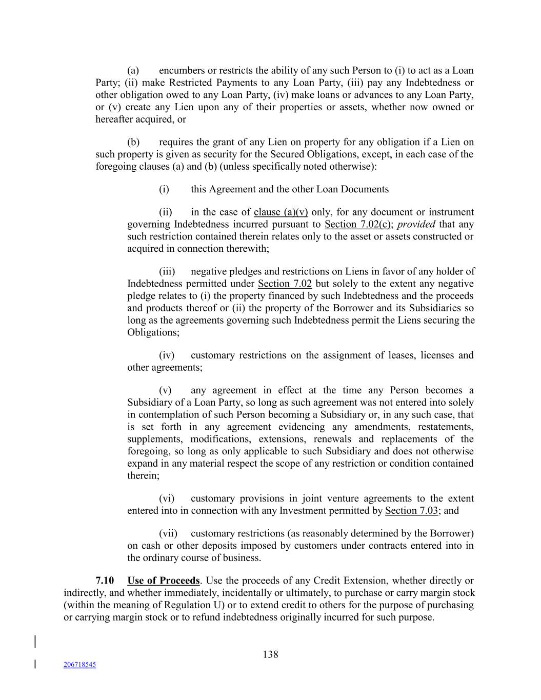 (a) encumbers or restricts the ability of any such Person to (i) to act as a Loan Party; (ii) make Restricted Payments to any Loan Party, (iii) pay any Indebtedness or other obligation owed to any Loan Party, (iv) make loans or advances to any Loan Party, or (v) create any Lien upon any of their properties or assets, whether now owned or hereafter acquired, or (b) requires the grant of any Lien on property for any obligation if a Lien on such property is given as security for the Secured Obligations, except, in each case of the foregoing clauses (a) and (b) (unless specifically noted otherwise): (i) this Agreement and the other Loan Documents (ii) in the case of clause (a)(v) only, for any document or instrument governing Indebtedness incurred pursuant to Section 7.02(c); provided that any such restriction contained therein relates only to the asset or assets constructed or acquired in connection therewith; (iii) negative pledges and restrictions on Liens in favor of any holder of Indebtedness permitted under Section 7.02 but solely to the extent any negative pledge relates to (i) the property financed by such Indebtedness and the proceeds and products thereof or (ii) the property of the Borrower and its Subsidiaries so long as the agreements governing such Indebtedness permit the Liens securing the Obligations; (iv) customary restrictions on the assignment of leases, licenses and other agreements; (v) any agreement in effect at the time any Person becomes a Subsidiary of a Loan Party, so long as such agreement was not entered into solely in contemplation of such Person becoming a Subsidiary or, in any such case, that is set forth in any agreement evidencing any amendments, restatements, supplements, modifications, extensions, renewals and replacements of the foregoing, so long as only applicable to such Subsidiary and does not otherwise expand in any material respect the scope of any restriction or condition contained therein; (vi) customary provisions in joint venture agreements to the extent entered into in connection with any Investment permitted by Section 7.03; and (vii) customary restrictions (as reasonably determined by the Borrower) on cash or other deposits imposed by customers under contracts entered into in the ordinary course of business. 7.10 Use of Proceeds. Use the proceeds of any Credit Extension, whether directly or indirectly, and whether immediately, incidentally or ultimately, to purchase or carry margin stock (within the meaning of Regulation U) or to extend credit to others for the purpose of purchasing or carrying margin stock or to refund indebtedness originally incurred for such purpose. 138 206718545