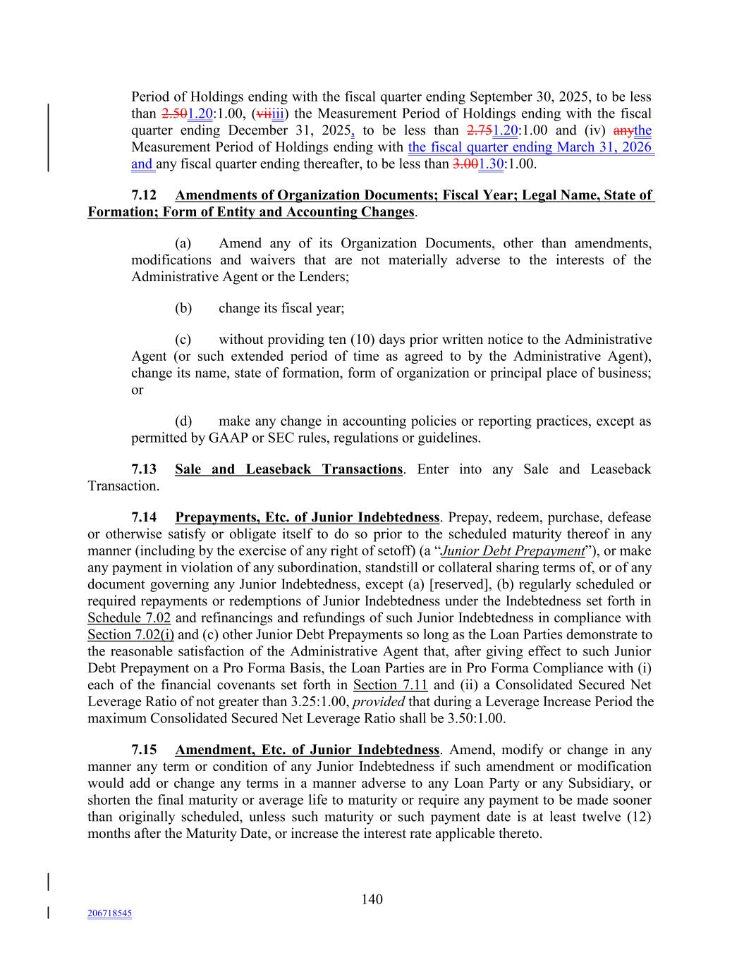 Period of Holdings ending with the fiscal quarter ending September 30, 2025, to be less than 2.501.20:1.00, (viiiii) the Measurement Period of Holdings ending with the fiscal quarter ending December 31, 2025, to be less than 2.751.20:1.00 and (iv) anythe Measurement Period of Holdings ending with the fiscal quarter ending March 31, 2026 and any fiscal quarter ending thereafter, to be less than 3.001.30:1.00. 7.12 Amendments of Organization Documents; Fiscal Year; Legal Name, State of Formation; Form of Entity and Accounting Changes. (a) Amend any of its Organization Documents, other than amendments, modifications and waivers that are not materially adverse to the interests of the Administrative Agent or the Lenders; (b) change its fiscal year; (c) without providing ten (10) days prior written notice to the Administrative Agent (or such extended period of time as agreed to by the Administrative Agent), change its name, state of formation, form of organization or principal place of business; or (d) make any change in accounting policies or reporting practices, except as permitted by GAAP or SEC rules, regulations or guidelines. 7.13 Sale and Leaseback Transactions. Enter into any Sale and Leaseback Transaction. 7.14 Prepayments, Etc. of Junior Indebtedness. Prepay, redeem, purchase, defease or otherwise satisfy or obligate itself to do so prior to the scheduled maturity thereof in any manner (including by the exercise of any right of setoff) (a “Junior Debt Prepayment”), or make any payment in violation of any subordination, standstill or collateral sharing terms of, or of any document governing any Junior Indebtedness, except (a) [reserved], (b) regularly scheduled or required repayments or redemptions of Junior Indebtedness under the Indebtedness set forth in Schedule 7.02 and refinancings and refundings of such Junior Indebtedness in compliance with Section 7.02(i) and (c) other Junior Debt Prepayments so long as the Loan Parties demonstrate to the reasonable satisfaction of the Administrative Agent that, after giving effect to such Junior Debt Prepayment on a Pro Forma Basis, the Loan Parties are in Pro Forma Compliance with (i) each of the financial covenants set forth in Section 7.11 and (ii) a Consolidated Secured Net Leverage Ratio of not greater than 3.25:1.00, provided that during a Leverage Increase Period the maximum Consolidated Secured Net Leverage Ratio shall be 3.50:1.00. 7.15 Amendment, Etc. of Junior Indebtedness. Amend, modify or change in any manner any term or condition of any Junior Indebtedness if such amendment or modification would add or change any terms in a manner adverse to any Loan Party or any Subsidiary, or shorten the final maturity or average life to maturity or require any payment to be made sooner than originally scheduled, unless such maturity or such payment date is at least twelve (12) months after the Maturity Date, or increase the interest rate applicable thereto. 140 206718545