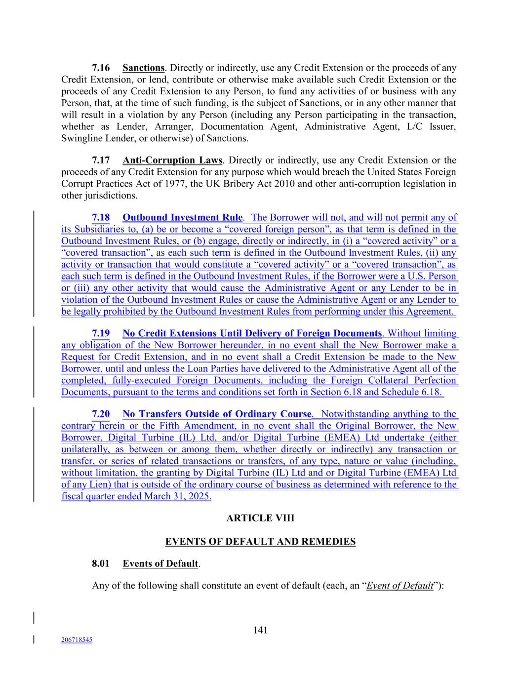 7.16 Sanctions. Directly or indirectly, use any Credit Extension or the proceeds of any Credit Extension, or lend, contribute or otherwise make available such Credit Extension or the proceeds of any Credit Extension to any Person, to fund any activities of or business with any Person, that, at the time of such funding, is the subject of Sanctions, or in any other manner that will result in a violation by any Person (including any Person participating in the transaction, whether as Lender, Arranger, Documentation Agent, Administrative Agent, L/C Issuer, Swingline Lender, or otherwise) of Sanctions. 7.17 Anti-Corruption Laws. Directly or indirectly, use any Credit Extension or the proceeds of any Credit Extension for any purpose which would breach the United States Foreign Corrupt Practices Act of 1977, the UK Bribery Act 2010 and other anti-corruption legislation in other jurisdictions. 7.18 Outbound Investment Rule. The Borrower will not, and will not permit any of its Subsidiaries to, (a) be or become a “covered foreign person”, as that term is defined in the Outbound Investment Rules, or (b) engage, directly or indirectly, in (i) a “covered activity” or a “covered transaction”, as each such term is defined in the Outbound Investment Rules, (ii) any activity or transaction that would constitute a “covered activity” or a “covered transaction”, as each such term is defined in the Outbound Investment Rules, if the Borrower were a U.S. Person or (iii) any other activity that would cause the Administrative Agent or any Lender to be in violation of the Outbound Investment Rules or cause the Administrative Agent or any Lender to be legally prohibited by the Outbound Investment Rules from performing under this Agreement. 7.19 No Credit Extensions Until Delivery of Foreign Documents. Without limiting any obligation of the New Borrower hereunder, in no event shall the New Borrower make a Request for Credit Extension, and in no event shall a Credit Extension be made to the New Borrower, until and unless the Loan Parties have delivered to the Administrative Agent all of the completed, fully-executed Foreign Documents, including the Foreign Collateral Perfection Documents, pursuant to the terms and conditions set forth in Section 6.18 and Schedule 6.18. 7.20 No Transfers Outside of Ordinary Course. Notwithstanding anything to the contrary herein or the Fifth Amendment, in no event shall the Original Borrower, the New Borrower, Digital Turbine (IL) Ltd, and/or Digital Turbine (EMEA) Ltd undertake (either unilaterally, as between or among them, whether directly or indirectly) any transaction or transfer, or series of related transactions or transfers, of any type, nature or value (including, without limitation, the granting by Digital Turbine (IL) Ltd and or Digital Turbine (EMEA) Ltd of any Lien) that is outside of the ordinary course of business as determined with reference to the fiscal quarter ended March 31, 2025. ARTICLE VIII EVENTS OF DEFAULT AND REMEDIES 8.01 Events of Default. Any of the following shall constitute an event of default (each, an “Event of Default”): 141 206718545