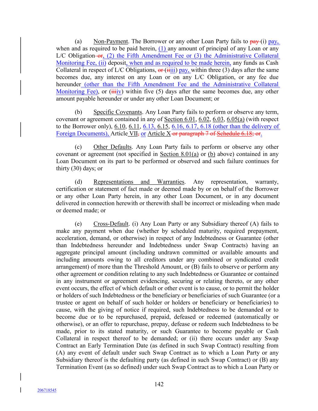 (a) Non-Payment. The Borrower or any other Loan Party fails to pay (i) pay, when and as required to be paid herein, (1) any amount of principal of any Loan or any L/C Obligation or, (2) the Fifth Amendment Fee or (3) the Administrative Collateral Monitoring Fee, (ii) deposit, when and as required to be made herein, any funds as Cash Collateral in respect of L/C Obligations, or (iiiii) pay, within three (3) days after the same becomes due, any interest on any Loan or on any L/C Obligation, or any fee due hereunder (other than the Fifth Amendment Fee and the Administrative Collateral Monitoring Fee), or (iiiiv) within five (5) days after the same becomes due, any other amount payable hereunder or under any other Loan Document; or (b) Specific Covenants. Any Loan Party fails to perform or observe any term, covenant or agreement contained in any of Section 6.01, 6.02, 6.03, 6.05(a) (with respect to the Borrower only), 6.10, 6.11, 6.13, 6.15, 6.16, 6.17, 6.18 (other than the delivery of Foreign Documents), Article VII, or Article X or paragraph 7 of Schedule 6.18; or. (c) Other Defaults. Any Loan Party fails to perform or observe any other covenant or agreement (not specified in Section 8.01(a) or (b) above) contained in any Loan Document on its part to be performed or observed and such failure continues for thirty (30) days; or (d) Representations and Warranties. Any representation, warranty, certification or statement of fact made or deemed made by or on behalf of the Borrower or any other Loan Party herein, in any other Loan Document, or in any document delivered in connection herewith or therewith shall be incorrect or misleading when made or deemed made; or (e) Cross-Default. (i) Any Loan Party or any Subsidiary thereof (A) fails to make any payment when due (whether by scheduled maturity, required prepayment, acceleration, demand, or otherwise) in respect of any Indebtedness or Guarantee (other than Indebtedness hereunder and Indebtedness under Swap Contracts) having an aggregate principal amount (including undrawn committed or available amounts and including amounts owing to all creditors under any combined or syndicated credit arrangement) of more than the Threshold Amount, or (B) fails to observe or perform any other agreement or condition relating to any such Indebtedness or Guarantee or contained in any instrument or agreement evidencing, securing or relating thereto, or any other event occurs, the effect of which default or other event is to cause, or to permit the holder or holders of such Indebtedness or the beneficiary or beneficiaries of such Guarantee (or a trustee or agent on behalf of such holder or holders or beneficiary or beneficiaries) to cause, with the giving of notice if required, such Indebtedness to be demanded or to become due or to be repurchased, prepaid, defeased or redeemed (automatically or otherwise), or an offer to repurchase, prepay, defease or redeem such Indebtedness to be made, prior to its stated maturity, or such Guarantee to become payable or Cash Collateral in respect thereof to be demanded; or (ii) there occurs under any Swap Contract an Early Termination Date (as defined in such Swap Contract) resulting from (A) any event of default under such Swap Contract as to which a Loan Party or any Subsidiary thereof is the defaulting party (as defined in such Swap Contract) or (B) any Termination Event (as so defined) under such Swap Contract as to which a Loan Party or 142 206718545