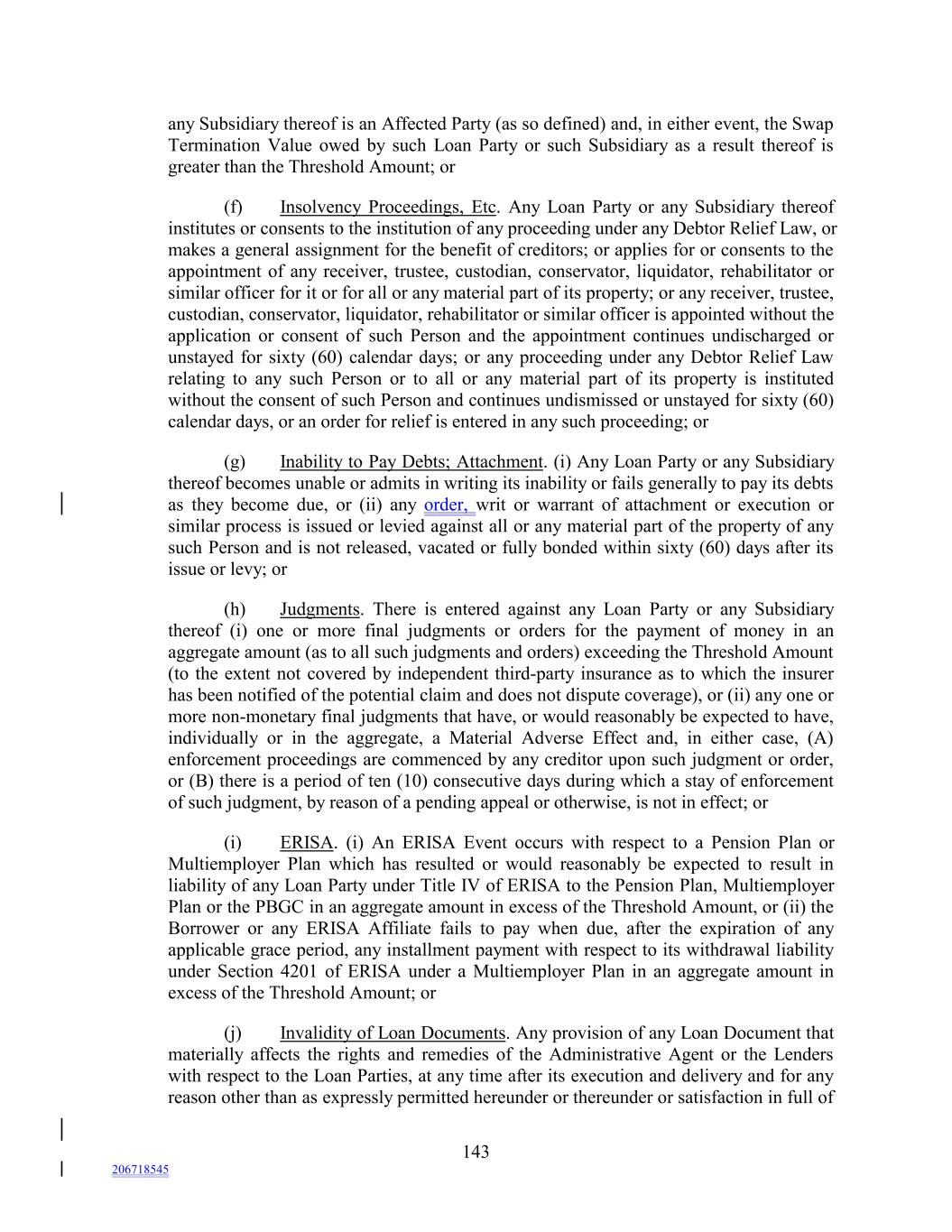 any Subsidiary thereof is an Affected Party (as so defined) and, in either event, the Swap Termination Value owed by such Loan Party or such Subsidiary as a result thereof is greater than the Threshold Amount; or (f) Insolvency Proceedings, Etc. Any Loan Party or any Subsidiary thereof institutes or consents to the institution of any proceeding under any Debtor Relief Law, or makes a general assignment for the benefit of creditors; or applies for or consents to the appointment of any receiver, trustee, custodian, conservator, liquidator, rehabilitator or similar officer for it or for all or any material part of its property; or any receiver, trustee, custodian, conservator, liquidator, rehabilitator or similar officer is appointed without the application or consent of such Person and the appointment continues undischarged or unstayed for sixty (60) calendar days; or any proceeding under any Debtor Relief Law relating to any such Person or to all or any material part of its property is instituted without the consent of such Person and continues undismissed or unstayed for sixty (60) calendar days, or an order for relief is entered in any such proceeding; or (g) Inability to Pay Debts; Attachment. (i) Any Loan Party or any Subsidiary thereof becomes unable or admits in writing its inability or fails generally to pay its debts as they become due, or (ii) any order, writ or warrant of attachment or execution or similar process is issued or levied against all or any material part of the property of any such Person and is not released, vacated or fully bonded within sixty (60) days after its issue or levy; or (h) Judgments. There is entered against any Loan Party or any Subsidiary thereof (i) one or more final judgments or orders for the payment of money in an aggregate amount (as to all such judgments and orders) exceeding the Threshold Amount (to the extent not covered by independent third-party insurance as to which the insurer has been notified of the potential claim and does not dispute coverage), or (ii) any one or more non-monetary final judgments that have, or would reasonably be expected to have, individually or in the aggregate, a Material Adverse Effect and, in either case, (A) enforcement proceedings are commenced by any creditor upon such judgment or order, or (B) there is a period of ten (10) consecutive days during which a stay of enforcement of such judgment, by reason of a pending appeal or otherwise, is not in effect; or (i) ERISA. (i) An ERISA Event occurs with respect to a Pension Plan or Multiemployer Plan which has resulted or would reasonably be expected to result in liability of any Loan Party under Title IV of ERISA to the Pension Plan, Multiemployer Plan or the PBGC in an aggregate amount in excess of the Threshold Amount, or (ii) the Borrower or any ERISA Affiliate fails to pay when due, after the expiration of any applicable grace period, any installment payment with respect to its withdrawal liability under Section 4201 of ERISA under a Multiemployer Plan in an aggregate amount in excess of the Threshold Amount; or (j) Invalidity of Loan Documents. Any provision of any Loan Document that materially affects the rights and remedies of the Administrative Agent or the Lenders with respect to the Loan Parties, at any time after its execution and delivery and for any reason other than as expressly permitted hereunder or thereunder or satisfaction in full of 143 206718545