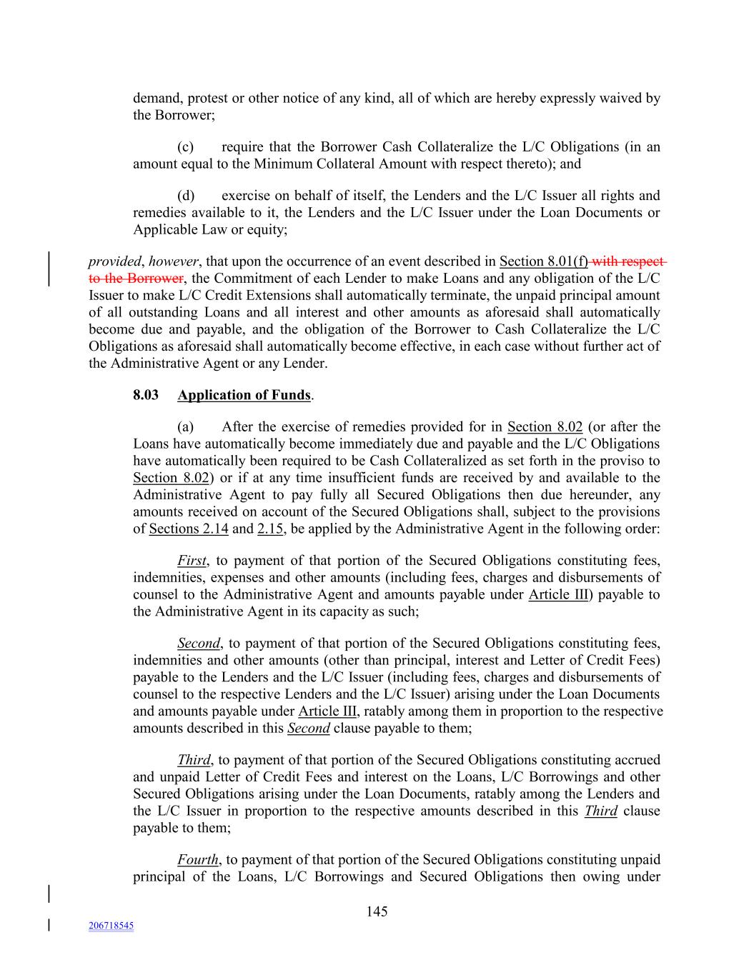 demand, protest or other notice of any kind, all of which are hereby expressly waived by the Borrower; (c) require that the Borrower Cash Collateralize the L/C Obligations (in an amount equal to the Minimum Collateral Amount with respect thereto); and (d) exercise on behalf of itself, the Lenders and the L/C Issuer all rights and remedies available to it, the Lenders and the L/C Issuer under the Loan Documents or Applicable Law or equity; provided, however, that upon the occurrence of an event described in Section 8.01(f) with respect to the Borrower, the Commitment of each Lender to make Loans and any obligation of the L/C Issuer to make L/C Credit Extensions shall automatically terminate, the unpaid principal amount of all outstanding Loans and all interest and other amounts as aforesaid shall automatically become due and payable, and the obligation of the Borrower to Cash Collateralize the L/C Obligations as aforesaid shall automatically become effective, in each case without further act of the Administrative Agent or any Lender. 8.03 Application of Funds. (a) After the exercise of remedies provided for in Section 8.02 (or after the Loans have automatically become immediately due and payable and the L/C Obligations have automatically been required to be Cash Collateralized as set forth in the proviso to Section 8.02) or if at any time insufficient funds are received by and available to the Administrative Agent to pay fully all Secured Obligations then due hereunder, any amounts received on account of the Secured Obligations shall, subject to the provisions of Sections 2.14 and 2.15, be applied by the Administrative Agent in the following order: First, to payment of that portion of the Secured Obligations constituting fees, indemnities, expenses and other amounts (including fees, charges and disbursements of counsel to the Administrative Agent and amounts payable under Article III) payable to the Administrative Agent in its capacity as such; Second, to payment of that portion of the Secured Obligations constituting fees, indemnities and other amounts (other than principal, interest and Letter of Credit Fees) payable to the Lenders and the L/C Issuer (including fees, charges and disbursements of counsel to the respective Lenders and the L/C Issuer) arising under the Loan Documents and amounts payable under Article III, ratably among them in proportion to the respective amounts described in this Second clause payable to them; Third, to payment of that portion of the Secured Obligations constituting accrued and unpaid Letter of Credit Fees and interest on the Loans, L/C Borrowings and other Secured Obligations arising under the Loan Documents, ratably among the Lenders and the L/C Issuer in proportion to the respective amounts described in this Third clause payable to them; Fourth, to payment of that portion of the Secured Obligations constituting unpaid principal of the Loans, L/C Borrowings and Secured Obligations then owing under 145 206718545