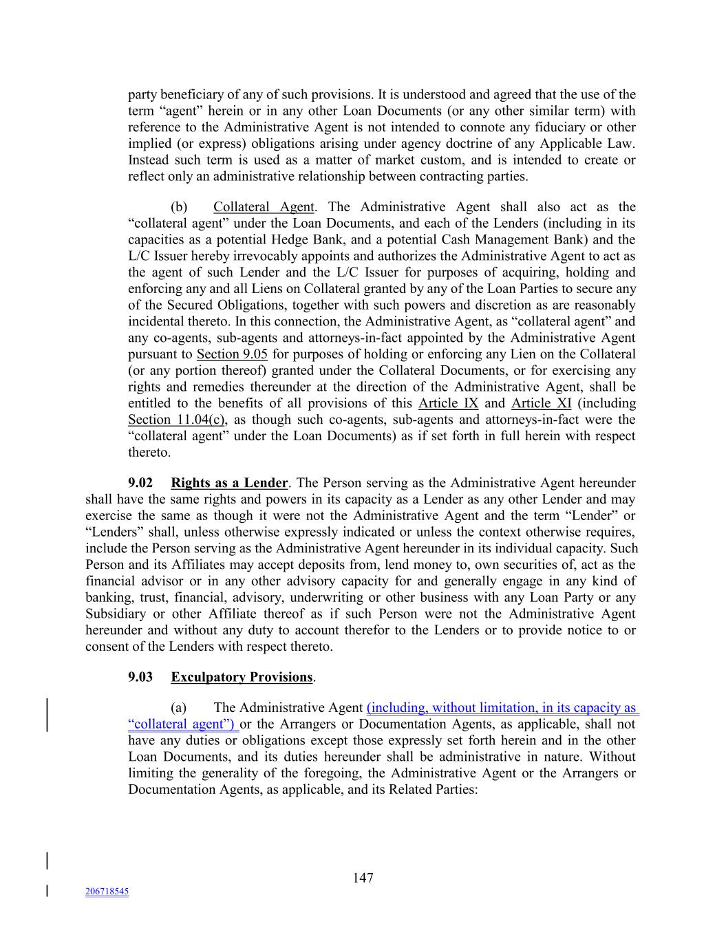 party beneficiary of any of such provisions. It is understood and agreed that the use of the term “agent” herein or in any other Loan Documents (or any other similar term) with reference to the Administrative Agent is not intended to connote any fiduciary or other implied (or express) obligations arising under agency doctrine of any Applicable Law. Instead such term is used as a matter of market custom, and is intended to create or reflect only an administrative relationship between contracting parties. (b) Collateral Agent. The Administrative Agent shall also act as the “collateral agent” under the Loan Documents, and each of the Lenders (including in its capacities as a potential Hedge Bank, and a potential Cash Management Bank) and the L/C Issuer hereby irrevocably appoints and authorizes the Administrative Agent to act as the agent of such Lender and the L/C Issuer for purposes of acquiring, holding and enforcing any and all Liens on Collateral granted by any of the Loan Parties to secure any of the Secured Obligations, together with such powers and discretion as are reasonably incidental thereto. In this connection, the Administrative Agent, as “collateral agent” and any co-agents, sub-agents and attorneys-in-fact appointed by the Administrative Agent pursuant to Section 9.05 for purposes of holding or enforcing any Lien on the Collateral (or any portion thereof) granted under the Collateral Documents, or for exercising any rights and remedies thereunder at the direction of the Administrative Agent, shall be entitled to the benefits of all provisions of this Article IX and Article XI (including Section 11.04(c), as though such co-agents, sub-agents and attorneys-in-fact were the “collateral agent” under the Loan Documents) as if set forth in full herein with respect thereto. 9.02 Rights as a Lender. The Person serving as the Administrative Agent hereunder shall have the same rights and powers in its capacity as a Lender as any other Lender and may exercise the same as though it were not the Administrative Agent and the term “Lender” or “Lenders” shall, unless otherwise expressly indicated or unless the context otherwise requires, include the Person serving as the Administrative Agent hereunder in its individual capacity. Such Person and its Affiliates may accept deposits from, lend money to, own securities of, act as the financial advisor or in any other advisory capacity for and generally engage in any kind of banking, trust, financial, advisory, underwriting or other business with any Loan Party or any Subsidiary or other Affiliate thereof as if such Person were not the Administrative Agent hereunder and without any duty to account therefor to the Lenders or to provide notice to or consent of the Lenders with respect thereto. 9.03 Exculpatory Provisions. (a) The Administrative Agent (including, without limitation, in its capacity as “collateral agent”) or the Arrangers or Documentation Agents, as applicable, shall not have any duties or obligations except those expressly set forth herein and in the other Loan Documents, and its duties hereunder shall be administrative in nature. Without limiting the generality of the foregoing, the Administrative Agent or the Arrangers or Documentation Agents, as applicable, and its Related Parties: 147 206718545