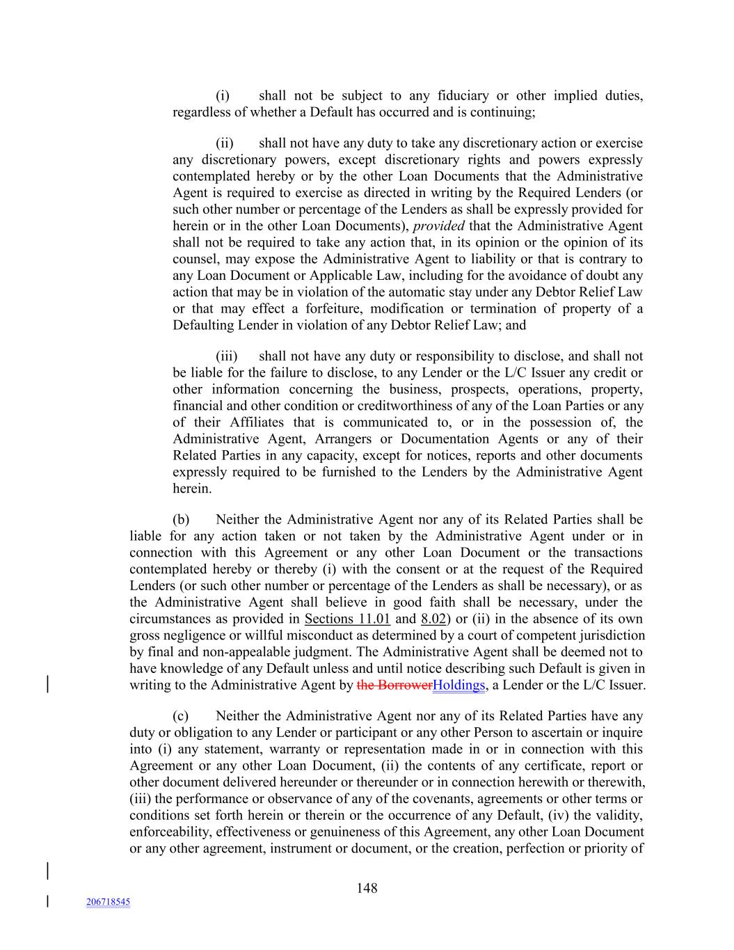 (i) shall not be subject to any fiduciary or other implied duties, regardless of whether a Default has occurred and is continuing; (ii) shall not have any duty to take any discretionary action or exercise any discretionary powers, except discretionary rights and powers expressly contemplated hereby or by the other Loan Documents that the Administrative Agent is required to exercise as directed in writing by the Required Lenders (or such other number or percentage of the Lenders as shall be expressly provided for herein or in the other Loan Documents), provided that the Administrative Agent shall not be required to take any action that, in its opinion or the opinion of its counsel, may expose the Administrative Agent to liability or that is contrary to any Loan Document or Applicable Law, including for the avoidance of doubt any action that may be in violation of the automatic stay under any Debtor Relief Law or that may effect a forfeiture, modification or termination of property of a Defaulting Lender in violation of any Debtor Relief Law; and (iii) shall not have any duty or responsibility to disclose, and shall not be liable for the failure to disclose, to any Lender or the L/C Issuer any credit or other information concerning the business, prospects, operations, property, financial and other condition or creditworthiness of any of the Loan Parties or any of their Affiliates that is communicated to, or in the possession of, the Administrative Agent, Arrangers or Documentation Agents or any of their Related Parties in any capacity, except for notices, reports and other documents expressly required to be furnished to the Lenders by the Administrative Agent herein. (b) Neither the Administrative Agent nor any of its Related Parties shall be liable for any action taken or not taken by the Administrative Agent under or in connection with this Agreement or any other Loan Document or the transactions contemplated hereby or thereby (i) with the consent or at the request of the Required Lenders (or such other number or percentage of the Lenders as shall be necessary), or as the Administrative Agent shall believe in good faith shall be necessary, under the circumstances as provided in Sections 11.01 and 8.02) or (ii) in the absence of its own gross negligence or willful misconduct as determined by a court of competent jurisdiction by final and non-appealable judgment. The Administrative Agent shall be deemed not to have knowledge of any Default unless and until notice describing such Default is given in writing to the Administrative Agent by the BorrowerHoldings, a Lender or the L/C Issuer. (c) Neither the Administrative Agent nor any of its Related Parties have any duty or obligation to any Lender or participant or any other Person to ascertain or inquire into (i) any statement, warranty or representation made in or in connection with this Agreement or any other Loan Document, (ii) the contents of any certificate, report or other document delivered hereunder or thereunder or in connection herewith or therewith, (iii) the performance or observance of any of the covenants, agreements or other terms or conditions set forth herein or therein or the occurrence of any Default, (iv) the validity, enforceability, effectiveness or genuineness of this Agreement, any other Loan Document or any other agreement, instrument or document, or the creation, perfection or priority of 148 206718545