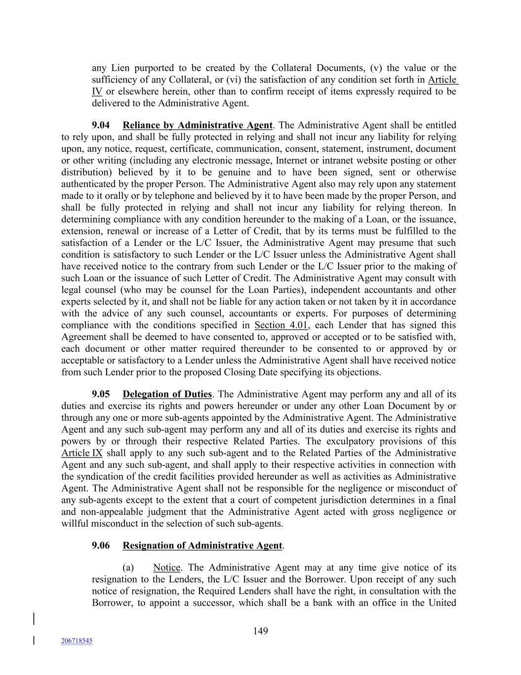 any Lien purported to be created by the Collateral Documents, (v) the value or the sufficiency of any Collateral, or (vi) the satisfaction of any condition set forth in Article IV or elsewhere herein, other than to confirm receipt of items expressly required to be delivered to the Administrative Agent. 9.04 Reliance by Administrative Agent. The Administrative Agent shall be entitled to rely upon, and shall be fully protected in relying and shall not incur any liability for relying upon, any notice, request, certificate, communication, consent, statement, instrument, document or other writing (including any electronic message, Internet or intranet website posting or other distribution) believed by it to be genuine and to have been signed, sent or otherwise authenticated by the proper Person. The Administrative Agent also may rely upon any statement made to it orally or by telephone and believed by it to have been made by the proper Person, and shall be fully protected in relying and shall not incur any liability for relying thereon. In determining compliance with any condition hereunder to the making of a Loan, or the issuance, extension, renewal or increase of a Letter of Credit, that by its terms must be fulfilled to the satisfaction of a Lender or the L/C Issuer, the Administrative Agent may presume that such condition is satisfactory to such Lender or the L/C Issuer unless the Administrative Agent shall have received notice to the contrary from such Lender or the L/C Issuer prior to the making of such Loan or the issuance of such Letter of Credit. The Administrative Agent may consult with legal counsel (who may be counsel for the Loan Parties), independent accountants and other experts selected by it, and shall not be liable for any action taken or not taken by it in accordance with the advice of any such counsel, accountants or experts. For purposes of determining compliance with the conditions specified in Section 4.01, each Lender that has signed this Agreement shall be deemed to have consented to, approved or accepted or to be satisfied with, each document or other matter required thereunder to be consented to or approved by or acceptable or satisfactory to a Lender unless the Administrative Agent shall have received notice from such Lender prior to the proposed Closing Date specifying its objections. 9.05 Delegation of Duties. The Administrative Agent may perform any and all of its duties and exercise its rights and powers hereunder or under any other Loan Document by or through any one or more sub-agents appointed by the Administrative Agent. The Administrative Agent and any such sub-agent may perform any and all of its duties and exercise its rights and powers by or through their respective Related Parties. The exculpatory provisions of this Article IX shall apply to any such sub-agent and to the Related Parties of the Administrative Agent and any such sub-agent, and shall apply to their respective activities in connection with the syndication of the credit facilities provided hereunder as well as activities as Administrative Agent. The Administrative Agent shall not be responsible for the negligence or misconduct of any sub-agents except to the extent that a court of competent jurisdiction determines in a final and non-appealable judgment that the Administrative Agent acted with gross negligence or willful misconduct in the selection of such sub-agents. 9.06 Resignation of Administrative Agent. (a) Notice. The Administrative Agent may at any time give notice of its resignation to the Lenders, the L/C Issuer and the Borrower. Upon receipt of any such notice of resignation, the Required Lenders shall have the right, in consultation with the Borrower, to appoint a successor, which shall be a bank with an office in the United 149 206718545