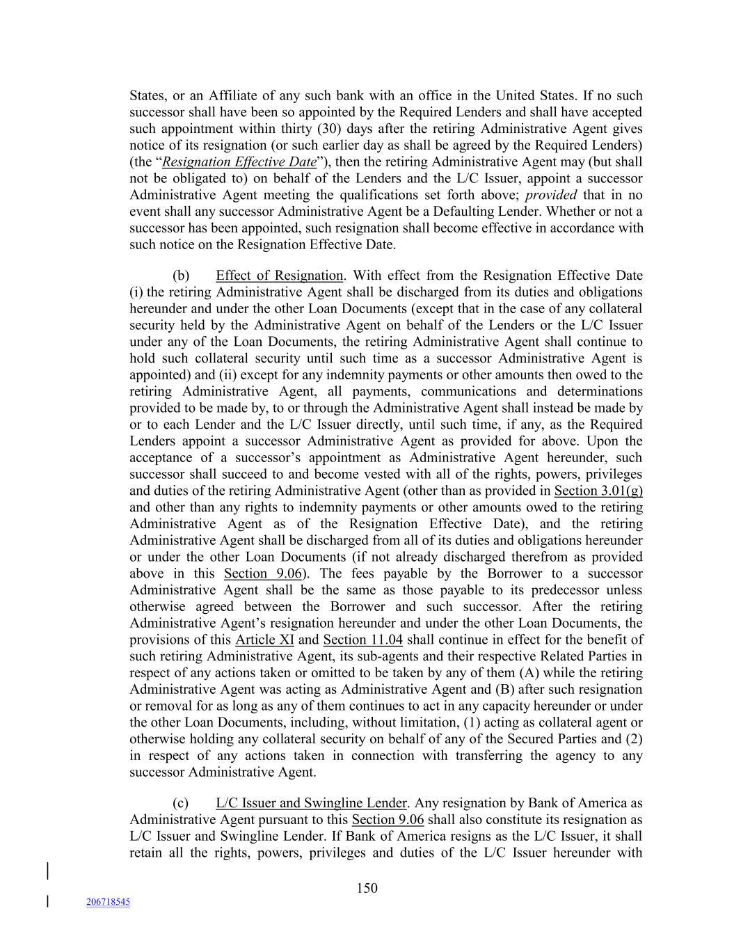States, or an Affiliate of any such bank with an office in the United States. If no such successor shall have been so appointed by the Required Lenders and shall have accepted such appointment within thirty (30) days after the retiring Administrative Agent gives notice of its resignation (or such earlier day as shall be agreed by the Required Lenders) (the “Resignation Effective Date”), then the retiring Administrative Agent may (but shall not be obligated to) on behalf of the Lenders and the L/C Issuer, appoint a successor Administrative Agent meeting the qualifications set forth above; provided that in no event shall any successor Administrative Agent be a Defaulting Lender. Whether or not a successor has been appointed, such resignation shall become effective in accordance with such notice on the Resignation Effective Date. (b) Effect of Resignation. With effect from the Resignation Effective Date (i) the retiring Administrative Agent shall be discharged from its duties and obligations hereunder and under the other Loan Documents (except that in the case of any collateral security held by the Administrative Agent on behalf of the Lenders or the L/C Issuer under any of the Loan Documents, the retiring Administrative Agent shall continue to hold such collateral security until such time as a successor Administrative Agent is appointed) and (ii) except for any indemnity payments or other amounts then owed to the retiring Administrative Agent, all payments, communications and determinations provided to be made by, to or through the Administrative Agent shall instead be made by or to each Lender and the L/C Issuer directly, until such time, if any, as the Required Lenders appoint a successor Administrative Agent as provided for above. Upon the acceptance of a successor’s appointment as Administrative Agent hereunder, such successor shall succeed to and become vested with all of the rights, powers, privileges and duties of the retiring Administrative Agent (other than as provided in Section 3.01(g) and other than any rights to indemnity payments or other amounts owed to the retiring Administrative Agent as of the Resignation Effective Date), and the retiring Administrative Agent shall be discharged from all of its duties and obligations hereunder or under the other Loan Documents (if not already discharged therefrom as provided above in this Section 9.06). The fees payable by the Borrower to a successor Administrative Agent shall be the same as those payable to its predecessor unless otherwise agreed between the Borrower and such successor. After the retiring Administrative Agent’s resignation hereunder and under the other Loan Documents, the provisions of this Article XI and Section 11.04 shall continue in effect for the benefit of such retiring Administrative Agent, its sub-agents and their respective Related Parties in respect of any actions taken or omitted to be taken by any of them (A) while the retiring Administrative Agent was acting as Administrative Agent and (B) after such resignation or removal for as long as any of them continues to act in any capacity hereunder or under the other Loan Documents, including, without limitation, (1) acting as collateral agent or otherwise holding any collateral security on behalf of any of the Secured Parties and (2) in respect of any actions taken in connection with transferring the agency to any successor Administrative Agent. (c) L/C Issuer and Swingline Lender. Any resignation by Bank of America as Administrative Agent pursuant to this Section 9.06 shall also constitute its resignation as L/C Issuer and Swingline Lender. If Bank of America resigns as the L/C Issuer, it shall retain all the rights, powers, privileges and duties of the L/C Issuer hereunder with 150 206718545