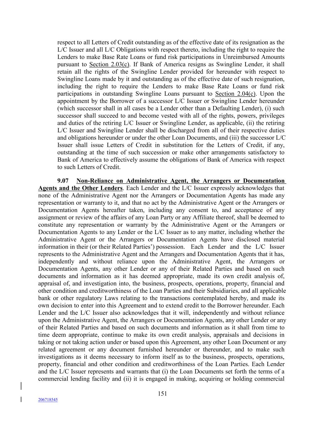 respect to all Letters of Credit outstanding as of the effective date of its resignation as the L/C Issuer and all L/C Obligations with respect thereto, including the right to require the Lenders to make Base Rate Loans or fund risk participations in Unreimbursed Amounts pursuant to Section 2.03(c). If Bank of America resigns as Swingline Lender, it shall retain all the rights of the Swingline Lender provided for hereunder with respect to Swingline Loans made by it and outstanding as of the effective date of such resignation, including the right to require the Lenders to make Base Rate Loans or fund risk participations in outstanding Swingline Loans pursuant to Section 2.04(c). Upon the appointment by the Borrower of a successor L/C Issuer or Swingline Lender hereunder (which successor shall in all cases be a Lender other than a Defaulting Lender), (i) such successor shall succeed to and become vested with all of the rights, powers, privileges and duties of the retiring L/C Issuer or Swingline Lender, as applicable, (ii) the retiring L/C Issuer and Swingline Lender shall be discharged from all of their respective duties and obligations hereunder or under the other Loan Documents, and (iii) the successor L/C Issuer shall issue Letters of Credit in substitution for the Letters of Credit, if any, outstanding at the time of such succession or make other arrangements satisfactory to Bank of America to effectively assume the obligations of Bank of America with respect to such Letters of Credit. 9.07 Non-Reliance on Administrative Agent, the Arrangers or Documentation Agents and the Other Lenders. Each Lender and the L/C Issuer expressly acknowledges that none of the Administrative Agent nor the Arrangers or Documentation Agents has made any representation or warranty to it, and that no act by the Administrative Agent or the Arrangers or Documentation Agents hereafter taken, including any consent to, and acceptance of any assignment or review of the affairs of any Loan Party or any Affiliate thereof, shall be deemed to constitute any representation or warranty by the Administrative Agent or the Arrangers or Documentation Agents to any Lender or the L/C Issuer as to any matter, including whether the Administrative Agent or the Arrangers or Documentation Agents have disclosed material information in their (or their Related Parties’) possession. Each Lender and the L/C Issuer represents to the Administrative Agent and the Arrangers and Documentation Agents that it has, independently and without reliance upon the Administrative Agent, the Arrangers or Documentation Agents, any other Lender or any of their Related Parties and based on such documents and information as it has deemed appropriate, made its own credit analysis of, appraisal of, and investigation into, the business, prospects, operations, property, financial and other condition and creditworthiness of the Loan Parties and their Subsidiaries, and all applicable bank or other regulatory Laws relating to the transactions contemplated hereby, and made its own decision to enter into this Agreement and to extend credit to the Borrower hereunder. Each Lender and the L/C Issuer also acknowledges that it will, independently and without reliance upon the Administrative Agent, the Arrangers or Documentation Agents, any other Lender or any of their Related Parties and based on such documents and information as it shall from time to time deem appropriate, continue to make its own credit analysis, appraisals and decisions in taking or not taking action under or based upon this Agreement, any other Loan Document or any related agreement or any document furnished hereunder or thereunder, and to make such investigations as it deems necessary to inform itself as to the business, prospects, operations, property, financial and other condition and creditworthiness of the Loan Parties. Each Lender and the L/C Issuer represents and warrants that (i) the Loan Documents set forth the terms of a commercial lending facility and (ii) it is engaged in making, acquiring or holding commercial 151 206718545