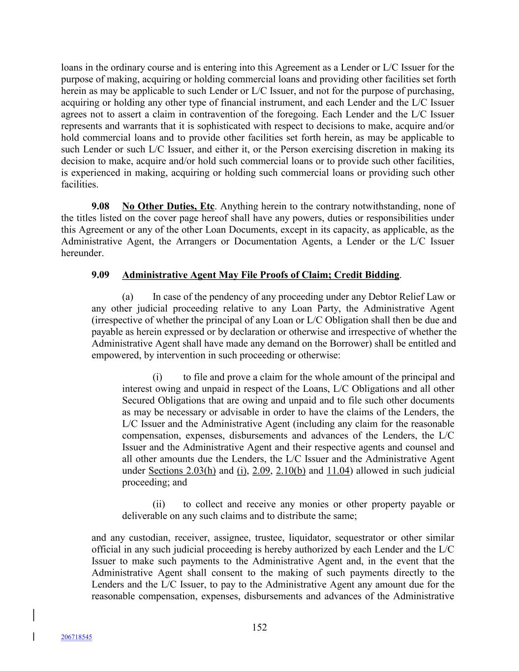 loans in the ordinary course and is entering into this Agreement as a Lender or L/C Issuer for the purpose of making, acquiring or holding commercial loans and providing other facilities set forth herein as may be applicable to such Lender or L/C Issuer, and not for the purpose of purchasing, acquiring or holding any other type of financial instrument, and each Lender and the L/C Issuer agrees not to assert a claim in contravention of the foregoing. Each Lender and the L/C Issuer represents and warrants that it is sophisticated with respect to decisions to make, acquire and/or hold commercial loans and to provide other facilities set forth herein, as may be applicable to such Lender or such L/C Issuer, and either it, or the Person exercising discretion in making its decision to make, acquire and/or hold such commercial loans or to provide such other facilities, is experienced in making, acquiring or holding such commercial loans or providing such other facilities. 9.08 No Other Duties, Etc. Anything herein to the contrary notwithstanding, none of the titles listed on the cover page hereof shall have any powers, duties or responsibilities under this Agreement or any of the other Loan Documents, except in its capacity, as applicable, as the Administrative Agent, the Arrangers or Documentation Agents, a Lender or the L/C Issuer hereunder. 9.09 Administrative Agent May File Proofs of Claim; Credit Bidding. (a) In case of the pendency of any proceeding under any Debtor Relief Law or any other judicial proceeding relative to any Loan Party, the Administrative Agent (irrespective of whether the principal of any Loan or L/C Obligation shall then be due and payable as herein expressed or by declaration or otherwise and irrespective of whether the Administrative Agent shall have made any demand on the Borrower) shall be entitled and empowered, by intervention in such proceeding or otherwise: (i) to file and prove a claim for the whole amount of the principal and interest owing and unpaid in respect of the Loans, L/C Obligations and all other Secured Obligations that are owing and unpaid and to file such other documents as may be necessary or advisable in order to have the claims of the Lenders, the L/C Issuer and the Administrative Agent (including any claim for the reasonable compensation, expenses, disbursements and advances of the Lenders, the L/C Issuer and the Administrative Agent and their respective agents and counsel and all other amounts due the Lenders, the L/C Issuer and the Administrative Agent under Sections 2.03(h) and (i), 2.09, 2.10(b) and 11.04) allowed in such judicial proceeding; and (ii) to collect and receive any monies or other property payable or deliverable on any such claims and to distribute the same; and any custodian, receiver, assignee, trustee, liquidator, sequestrator or other similar official in any such judicial proceeding is hereby authorized by each Lender and the L/C Issuer to make such payments to the Administrative Agent and, in the event that the Administrative Agent shall consent to the making of such payments directly to the Lenders and the L/C Issuer, to pay to the Administrative Agent any amount due for the reasonable compensation, expenses, disbursements and advances of the Administrative 152 206718545