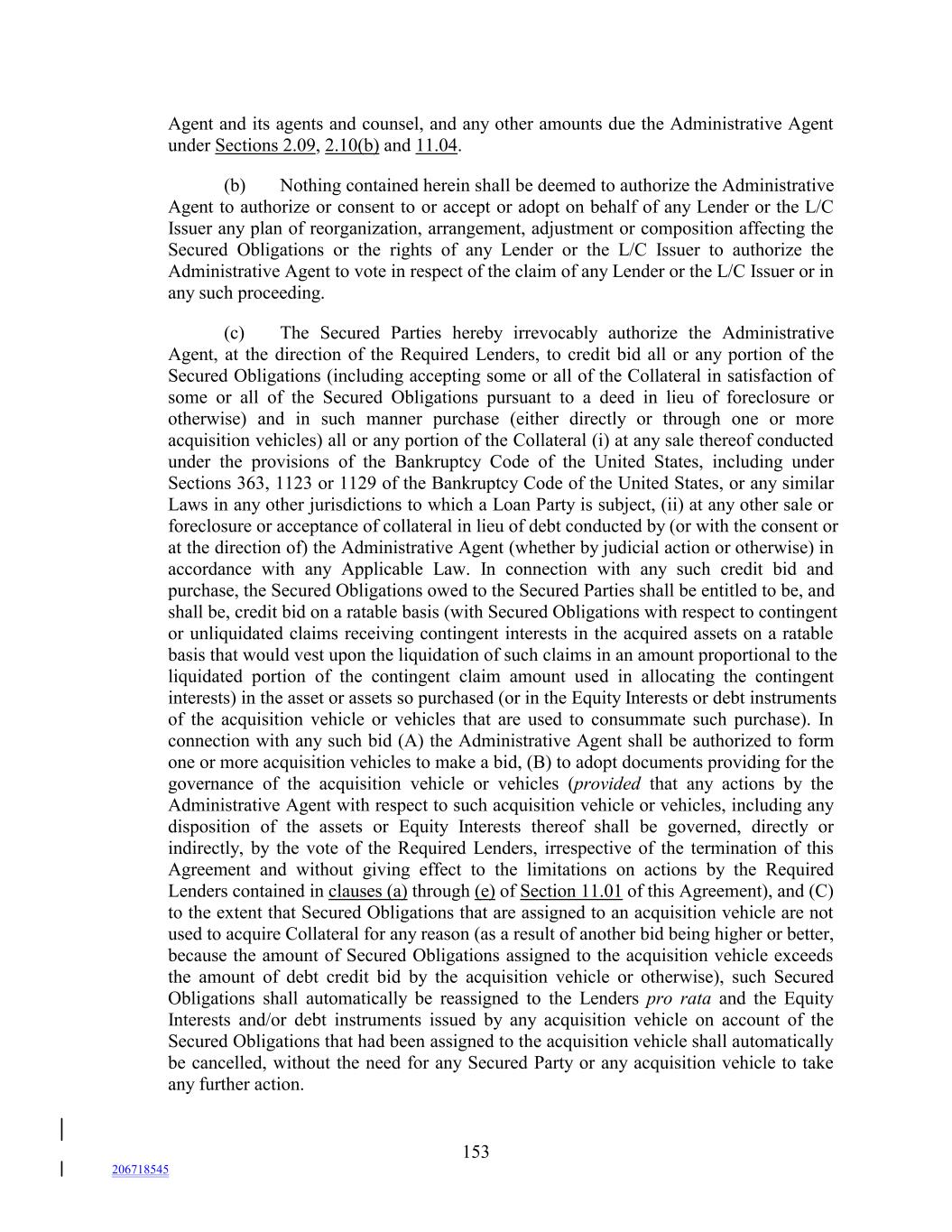 Agent and its agents and counsel, and any other amounts due the Administrative Agent under Sections 2.09, 2.10(b) and 11.04. (b) Nothing contained herein shall be deemed to authorize the Administrative Agent to authorize or consent to or accept or adopt on behalf of any Lender or the L/C Issuer any plan of reorganization, arrangement, adjustment or composition affecting the Secured Obligations or the rights of any Lender or the L/C Issuer to authorize the Administrative Agent to vote in respect of the claim of any Lender or the L/C Issuer or in any such proceeding. (c) The Secured Parties hereby irrevocably authorize the Administrative Agent, at the direction of the Required Lenders, to credit bid all or any portion of the Secured Obligations (including accepting some or all of the Collateral in satisfaction of some or all of the Secured Obligations pursuant to a deed in lieu of foreclosure or otherwise) and in such manner purchase (either directly or through one or more acquisition vehicles) all or any portion of the Collateral (i) at any sale thereof conducted under the provisions of the Bankruptcy Code of the United States, including under Sections 363, 1123 or 1129 of the Bankruptcy Code of the United States, or any similar Laws in any other jurisdictions to which a Loan Party is subject, (ii) at any other sale or foreclosure or acceptance of collateral in lieu of debt conducted by (or with the consent or at the direction of) the Administrative Agent (whether by judicial action or otherwise) in accordance with any Applicable Law. In connection with any such credit bid and purchase, the Secured Obligations owed to the Secured Parties shall be entitled to be, and shall be, credit bid on a ratable basis (with Secured Obligations with respect to contingent or unliquidated claims receiving contingent interests in the acquired assets on a ratable basis that would vest upon the liquidation of such claims in an amount proportional to the liquidated portion of the contingent claim amount used in allocating the contingent interests) in the asset or assets so purchased (or in the Equity Interests or debt instruments of the acquisition vehicle or vehicles that are used to consummate such purchase). In connection with any such bid (A) the Administrative Agent shall be authorized to form one or more acquisition vehicles to make a bid, (B) to adopt documents providing for the governance of the acquisition vehicle or vehicles (provided that any actions by the Administrative Agent with respect to such acquisition vehicle or vehicles, including any disposition of the assets or Equity Interests thereof shall be governed, directly or indirectly, by the vote of the Required Lenders, irrespective of the termination of this Agreement and without giving effect to the limitations on actions by the Required Lenders contained in clauses (a) through (e) of Section 11.01 of this Agreement), and (C) to the extent that Secured Obligations that are assigned to an acquisition vehicle are not used to acquire Collateral for any reason (as a result of another bid being higher or better, because the amount of Secured Obligations assigned to the acquisition vehicle exceeds the amount of debt credit bid by the acquisition vehicle or otherwise), such Secured Obligations shall automatically be reassigned to the Lenders pro rata and the Equity Interests and/or debt instruments issued by any acquisition vehicle on account of the Secured Obligations that had been assigned to the acquisition vehicle shall automatically be cancelled, without the need for any Secured Party or any acquisition vehicle to take any further action. 153 206718545