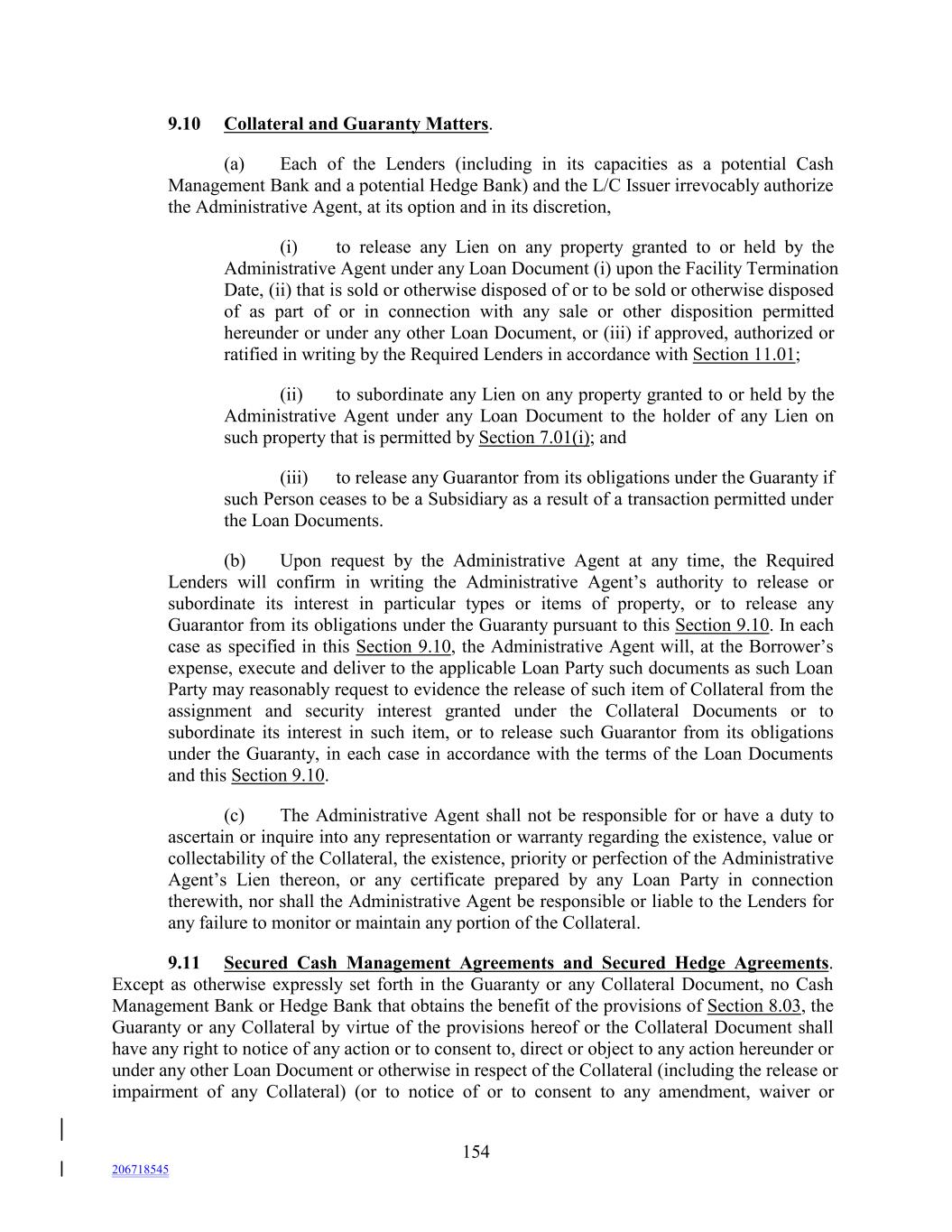 9.10 Collateral and Guaranty Matters. (a) Each of the Lenders (including in its capacities as a potential Cash Management Bank and a potential Hedge Bank) and the L/C Issuer irrevocably authorize the Administrative Agent, at its option and in its discretion, (i) to release any Lien on any property granted to or held by the Administrative Agent under any Loan Document (i) upon the Facility Termination Date, (ii) that is sold or otherwise disposed of or to be sold or otherwise disposed of as part of or in connection with any sale or other disposition permitted hereunder or under any other Loan Document, or (iii) if approved, authorized or ratified in writing by the Required Lenders in accordance with Section 11.01; (ii) to subordinate any Lien on any property granted to or held by the Administrative Agent under any Loan Document to the holder of any Lien on such property that is permitted by Section 7.01(i); and (iii) to release any Guarantor from its obligations under the Guaranty if such Person ceases to be a Subsidiary as a result of a transaction permitted under the Loan Documents. (b) Upon request by the Administrative Agent at any time, the Required Lenders will confirm in writing the Administrative Agent’s authority to release or subordinate its interest in particular types or items of property, or to release any Guarantor from its obligations under the Guaranty pursuant to this Section 9.10. In each case as specified in this Section 9.10, the Administrative Agent will, at the Borrower’s expense, execute and deliver to the applicable Loan Party such documents as such Loan Party may reasonably request to evidence the release of such item of Collateral from the assignment and security interest granted under the Collateral Documents or to subordinate its interest in such item, or to release such Guarantor from its obligations under the Guaranty, in each case in accordance with the terms of the Loan Documents and this Section 9.10. (c) The Administrative Agent shall not be responsible for or have a duty to ascertain or inquire into any representation or warranty regarding the existence, value or collectability of the Collateral, the existence, priority or perfection of the Administrative Agent’s Lien thereon, or any certificate prepared by any Loan Party in connection therewith, nor shall the Administrative Agent be responsible or liable to the Lenders for any failure to monitor or maintain any portion of the Collateral. 9.11 Secured Cash Management Agreements and Secured Hedge Agreements. Except as otherwise expressly set forth in the Guaranty or any Collateral Document, no Cash Management Bank or Hedge Bank that obtains the benefit of the provisions of Section 8.03, the Guaranty or any Collateral by virtue of the provisions hereof or the Collateral Document shall have any right to notice of any action or to consent to, direct or object to any action hereunder or under any other Loan Document or otherwise in respect of the Collateral (including the release or impairment of any Collateral) (or to notice of or to consent to any amendment, waiver or 154 206718545