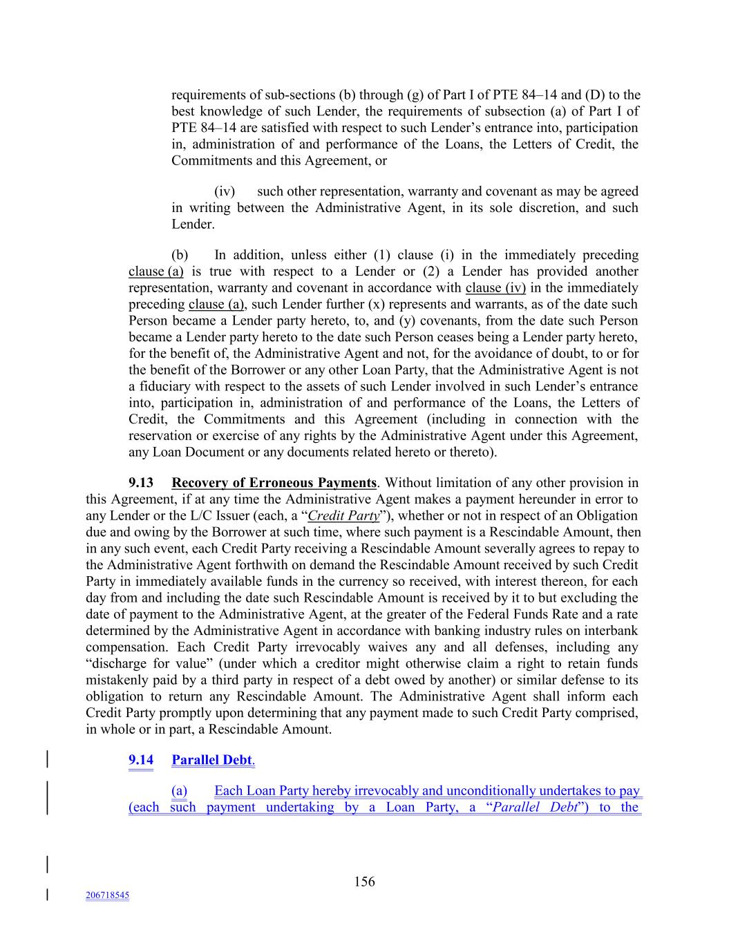 requirements of sub-sections (b) through (g) of Part I of PTE 84–14 and (D) to the best knowledge of such Lender, the requirements of subsection (a) of Part I of PTE 84–14 are satisfied with respect to such Lender’s entrance into, participation in, administration of and performance of the Loans, the Letters of Credit, the Commitments and this Agreement, or (iv) such other representation, warranty and covenant as may be agreed in writing between the Administrative Agent, in its sole discretion, and such Lender. (b) In addition, unless either (1) clause (i) in the immediately preceding clause (a) is true with respect to a Lender or (2) a Lender has provided another representation, warranty and covenant in accordance with clause (iv) in the immediately preceding clause (a), such Lender further (x) represents and warrants, as of the date such Person became a Lender party hereto, to, and (y) covenants, from the date such Person became a Lender party hereto to the date such Person ceases being a Lender party hereto, for the benefit of, the Administrative Agent and not, for the avoidance of doubt, to or for the benefit of the Borrower or any other Loan Party, that the Administrative Agent is not a fiduciary with respect to the assets of such Lender involved in such Lender’s entrance into, participation in, administration of and performance of the Loans, the Letters of Credit, the Commitments and this Agreement (including in connection with the reservation or exercise of any rights by the Administrative Agent under this Agreement, any Loan Document or any documents related hereto or thereto). 9.13 Recovery of Erroneous Payments. Without limitation of any other provision in this Agreement, if at any time the Administrative Agent makes a payment hereunder in error to any Lender or the L/C Issuer (each, a “Credit Party”), whether or not in respect of an Obligation due and owing by the Borrower at such time, where such payment is a Rescindable Amount, then in any such event, each Credit Party receiving a Rescindable Amount severally agrees to repay to the Administrative Agent forthwith on demand the Rescindable Amount received by such Credit Party in immediately available funds in the currency so received, with interest thereon, for each day from and including the date such Rescindable Amount is received by it to but excluding the date of payment to the Administrative Agent, at the greater of the Federal Funds Rate and a rate determined by the Administrative Agent in accordance with banking industry rules on interbank compensation. Each Credit Party irrevocably waives any and all defenses, including any “discharge for value” (under which a creditor might otherwise claim a right to retain funds mistakenly paid by a third party in respect of a debt owed by another) or similar defense to its obligation to return any Rescindable Amount. The Administrative Agent shall inform each Credit Party promptly upon determining that any payment made to such Credit Party comprised, in whole or in part, a Rescindable Amount. 9.14 Parallel Debt. (a) Each Loan Party hereby irrevocably and unconditionally undertakes to pay (each such payment undertaking by a Loan Party, a “Parallel Debt”) to the 156 206718545