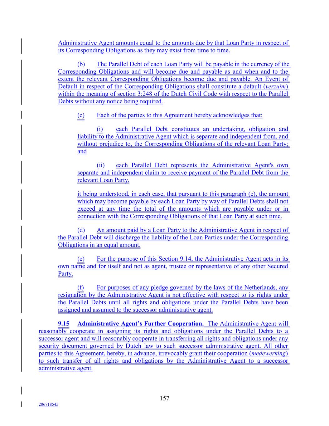 Administrative Agent amounts equal to the amounts due by that Loan Party in respect of its Corresponding Obligations as they may exist from time to time. (b) The Parallel Debt of each Loan Party will be payable in the currency of the Corresponding Obligations and will become due and payable as and when and to the extent the relevant Corresponding Obligations become due and payable. An Event of Default in respect of the Corresponding Obligations shall constitute a default (verzuim) within the meaning of section 3:248 of the Dutch Civil Code with respect to the Parallel Debts without any notice being required. (c) Each of the parties to this Agreement hereby acknowledges that: (i) each Parallel Debt constitutes an undertaking, obligation and liability to the Administrative Agent which is separate and independent from, and without prejudice to, the Corresponding Obligations of the relevant Loan Party; and (ii) each Parallel Debt represents the Administrative Agent's own separate and independent claim to receive payment of the Parallel Debt from the relevant Loan Party, it being understood, in each case, that pursuant to this paragraph (c), the amount which may become payable by each Loan Party by way of Parallel Debts shall not exceed at any time the total of the amounts which are payable under or in connection with the Corresponding Obligations of that Loan Party at such time. (d) An amount paid by a Loan Party to the Administrative Agent in respect of the Parallel Debt will discharge the liability of the Loan Parties under the Corresponding Obligations in an equal amount. (e) For the purpose of this Section 9.14, the Administrative Agent acts in its own name and for itself and not as agent, trustee or representative of any other Secured Party. (f) For purposes of any pledge governed by the laws of the Netherlands, any resignation by the Administrative Agent is not effective with respect to its rights under the Parallel Debts until all rights and obligations under the Parallel Debts have been assigned and assumed to the successor administrative agent. 9.15 Administrative Agent’s Further Cooperation. The Administrative Agent will reasonably cooperate in assigning its rights and obligations under the Parallel Debts to a successor agent and will reasonably cooperate in transferring all rights and obligations under any security document governed by Dutch law to such successor administrative agent. All other parties to this Agreement, hereby, in advance, irrevocably grant their cooperation (medewerking) to such transfer of all rights and obligations by the Administrative Agent to a successor administrative agent. 157 206718545