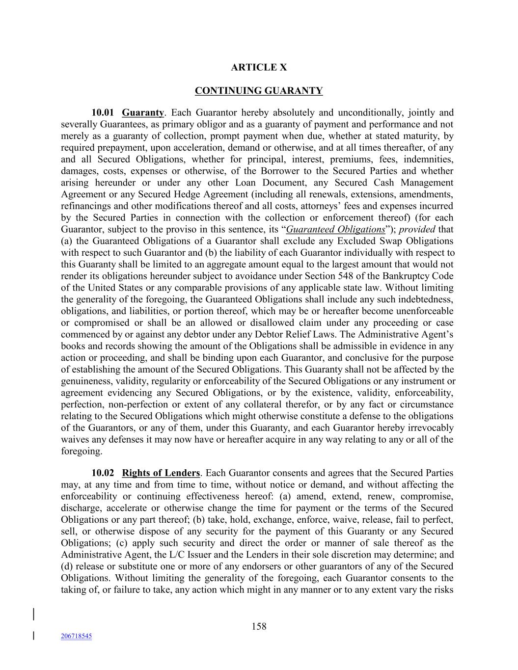 ARTICLE X CONTINUING GUARANTY 10.01 Guaranty. Each Guarantor hereby absolutely and unconditionally, jointly and severally Guarantees, as primary obligor and as a guaranty of payment and performance and not merely as a guaranty of collection, prompt payment when due, whether at stated maturity, by required prepayment, upon acceleration, demand or otherwise, and at all times thereafter, of any and all Secured Obligations, whether for principal, interest, premiums, fees, indemnities, damages, costs, expenses or otherwise, of the Borrower to the Secured Parties and whether arising hereunder or under any other Loan Document, any Secured Cash Management Agreement or any Secured Hedge Agreement (including all renewals, extensions, amendments, refinancings and other modifications thereof and all costs, attorneys’ fees and expenses incurred by the Secured Parties in connection with the collection or enforcement thereof) (for each Guarantor, subject to the proviso in this sentence, its “Guaranteed Obligations”); provided that (a) the Guaranteed Obligations of a Guarantor shall exclude any Excluded Swap Obligations with respect to such Guarantor and (b) the liability of each Guarantor individually with respect to this Guaranty shall be limited to an aggregate amount equal to the largest amount that would not render its obligations hereunder subject to avoidance under Section 548 of the Bankruptcy Code of the United States or any comparable provisions of any applicable state law. Without limiting the generality of the foregoing, the Guaranteed Obligations shall include any such indebtedness, obligations, and liabilities, or portion thereof, which may be or hereafter become unenforceable or compromised or shall be an allowed or disallowed claim under any proceeding or case commenced by or against any debtor under any Debtor Relief Laws. The Administrative Agent’s books and records showing the amount of the Obligations shall be admissible in evidence in any action or proceeding, and shall be binding upon each Guarantor, and conclusive for the purpose of establishing the amount of the Secured Obligations. This Guaranty shall not be affected by the genuineness, validity, regularity or enforceability of the Secured Obligations or any instrument or agreement evidencing any Secured Obligations, or by the existence, validity, enforceability, perfection, non-perfection or extent of any collateral therefor, or by any fact or circumstance relating to the Secured Obligations which might otherwise constitute a defense to the obligations of the Guarantors, or any of them, under this Guaranty, and each Guarantor hereby irrevocably waives any defenses it may now have or hereafter acquire in any way relating to any or all of the foregoing. 10.02 Rights of Lenders. Each Guarantor consents and agrees that the Secured Parties may, at any time and from time to time, without notice or demand, and without affecting the enforceability or continuing effectiveness hereof: (a) amend, extend, renew, compromise, discharge, accelerate or otherwise change the time for payment or the terms of the Secured Obligations or any part thereof; (b) take, hold, exchange, enforce, waive, release, fail to perfect, sell, or otherwise dispose of any security for the payment of this Guaranty or any Secured Obligations; (c) apply such security and direct the order or manner of sale thereof as the Administrative Agent, the L/C Issuer and the Lenders in their sole discretion may determine; and (d) release or substitute one or more of any endorsers or other guarantors of any of the Secured Obligations. Without limiting the generality of the foregoing, each Guarantor consents to the taking of, or failure to take, any action which might in any manner or to any extent vary the risks 158 206718545