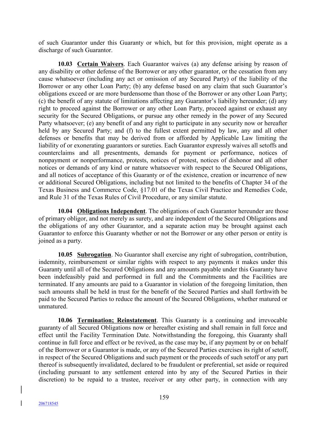 of such Guarantor under this Guaranty or which, but for this provision, might operate as a discharge of such Guarantor. 10.03 Certain Waivers. Each Guarantor waives (a) any defense arising by reason of any disability or other defense of the Borrower or any other guarantor, or the cessation from any cause whatsoever (including any act or omission of any Secured Party) of the liability of the Borrower or any other Loan Party; (b) any defense based on any claim that such Guarantor’s obligations exceed or are more burdensome than those of the Borrower or any other Loan Party; (c) the benefit of any statute of limitations affecting any Guarantor’s liability hereunder; (d) any right to proceed against the Borrower or any other Loan Party, proceed against or exhaust any security for the Secured Obligations, or pursue any other remedy in the power of any Secured Party whatsoever; (e) any benefit of and any right to participate in any security now or hereafter held by any Secured Party; and (f) to the fullest extent permitted by law, any and all other defenses or benefits that may be derived from or afforded by Applicable Law limiting the liability of or exonerating guarantors or sureties. Each Guarantor expressly waives all setoffs and counterclaims and all presentments, demands for payment or performance, notices of nonpayment or nonperformance, protests, notices of protest, notices of dishonor and all other notices or demands of any kind or nature whatsoever with respect to the Secured Obligations, and all notices of acceptance of this Guaranty or of the existence, creation or incurrence of new or additional Secured Obligations, including but not limited to the benefits of Chapter 34 of the Texas Business and Commerce Code, §17.01 of the Texas Civil Practice and Remedies Code, and Rule 31 of the Texas Rules of Civil Procedure, or any similar statute. 10.04 Obligations Independent. The obligations of each Guarantor hereunder are those of primary obligor, and not merely as surety, and are independent of the Secured Obligations and the obligations of any other Guarantor, and a separate action may be brought against each Guarantor to enforce this Guaranty whether or not the Borrower or any other person or entity is joined as a party. 10.05 Subrogation. No Guarantor shall exercise any right of subrogation, contribution, indemnity, reimbursement or similar rights with respect to any payments it makes under this Guaranty until all of the Secured Obligations and any amounts payable under this Guaranty have been indefeasibly paid and performed in full and the Commitments and the Facilities are terminated. If any amounts are paid to a Guarantor in violation of the foregoing limitation, then such amounts shall be held in trust for the benefit of the Secured Parties and shall forthwith be paid to the Secured Parties to reduce the amount of the Secured Obligations, whether matured or unmatured. 10.06 Termination; Reinstatement. This Guaranty is a continuing and irrevocable guaranty of all Secured Obligations now or hereafter existing and shall remain in full force and effect until the Facility Termination Date. Notwithstanding the foregoing, this Guaranty shall continue in full force and effect or be revived, as the case may be, if any payment by or on behalf of the Borrower or a Guarantor is made, or any of the Secured Parties exercises its right of setoff, in respect of the Secured Obligations and such payment or the proceeds of such setoff or any part thereof is subsequently invalidated, declared to be fraudulent or preferential, set aside or required (including pursuant to any settlement entered into by any of the Secured Parties in their discretion) to be repaid to a trustee, receiver or any other party, in connection with any 159 206718545