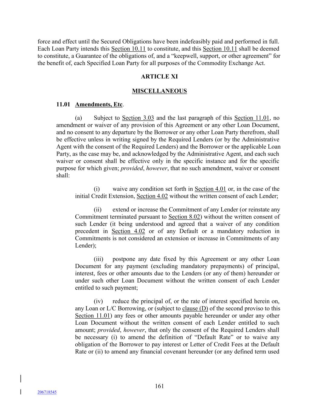 force and effect until the Secured Obligations have been indefeasibly paid and performed in full. Each Loan Party intends this Section 10.11 to constitute, and this Section 10.11 shall be deemed to constitute, a Guarantee of the obligations of, and a “keepwell, support, or other agreement” for the benefit of, each Specified Loan Party for all purposes of the Commodity Exchange Act. ARTICLE XI MISCELLANEOUS 11.01 Amendments, Etc. (a) Subject to Section 3.03 and the last paragraph of this Section 11.01, no amendment or waiver of any provision of this Agreement or any other Loan Document, and no consent to any departure by the Borrower or any other Loan Party therefrom, shall be effective unless in writing signed by the Required Lenders (or by the Administrative Agent with the consent of the Required Lenders) and the Borrower or the applicable Loan Party, as the case may be, and acknowledged by the Administrative Agent, and each such waiver or consent shall be effective only in the specific instance and for the specific purpose for which given; provided, however, that no such amendment, waiver or consent shall: (i) waive any condition set forth in Section 4.01 or, in the case of the initial Credit Extension, Section 4.02 without the written consent of each Lender; (ii) extend or increase the Commitment of any Lender (or reinstate any Commitment terminated pursuant to Section 8.02) without the written consent of such Lender (it being understood and agreed that a waiver of any condition precedent in Section 4.02 or of any Default or a mandatory reduction in Commitments is not considered an extension or increase in Commitments of any Lender); (iii) postpone any date fixed by this Agreement or any other Loan Document for any payment (excluding mandatory prepayments) of principal, interest, fees or other amounts due to the Lenders (or any of them) hereunder or under such other Loan Document without the written consent of each Lender entitled to such payment; (iv) reduce the principal of, or the rate of interest specified herein on, any Loan or L/C Borrowing, or (subject to clause (D) of the second proviso to this Section 11.01) any fees or other amounts payable hereunder or under any other Loan Document without the written consent of each Lender entitled to such amount; provided, however, that only the consent of the Required Lenders shall be necessary (i) to amend the definition of “Default Rate” or to waive any obligation of the Borrower to pay interest or Letter of Credit Fees at the Default Rate or (ii) to amend any financial covenant hereunder (or any defined term used 161 206718545