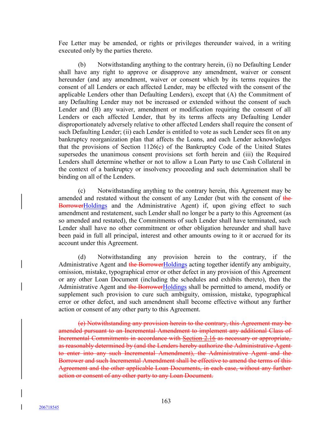 Fee Letter may be amended, or rights or privileges thereunder waived, in a writing executed only by the parties thereto. (b) Notwithstanding anything to the contrary herein, (i) no Defaulting Lender shall have any right to approve or disapprove any amendment, waiver or consent hereunder (and any amendment, waiver or consent which by its terms requires the consent of all Lenders or each affected Lender, may be effected with the consent of the applicable Lenders other than Defaulting Lenders), except that (A) the Commitment of any Defaulting Lender may not be increased or extended without the consent of such Lender and (B) any waiver, amendment or modification requiring the consent of all Lenders or each affected Lender, that by its terms affects any Defaulting Lender disproportionately adversely relative to other affected Lenders shall require the consent of such Defaulting Lender; (ii) each Lender is entitled to vote as such Lender sees fit on any bankruptcy reorganization plan that affects the Loans, and each Lender acknowledges that the provisions of Section 1126(c) of the Bankruptcy Code of the United States supersedes the unanimous consent provisions set forth herein and (iii) the Required Lenders shall determine whether or not to allow a Loan Party to use Cash Collateral in the context of a bankruptcy or insolvency proceeding and such determination shall be binding on all of the Lenders. (c) Notwithstanding anything to the contrary herein, this Agreement may be amended and restated without the consent of any Lender (but with the consent of the BorrowerHoldings and the Administrative Agent) if, upon giving effect to such amendment and restatement, such Lender shall no longer be a party to this Agreement (as so amended and restated), the Commitments of such Lender shall have terminated, such Lender shall have no other commitment or other obligation hereunder and shall have been paid in full all principal, interest and other amounts owing to it or accrued for its account under this Agreement. (d) Notwithstanding any provision herein to the contrary, if the Administrative Agent and the BorrowerHoldings acting together identify any ambiguity, omission, mistake, typographical error or other defect in any provision of this Agreement or any other Loan Document (including the schedules and exhibits thereto), then the Administrative Agent and the BorrowerHoldings shall be permitted to amend, modify or supplement such provision to cure such ambiguity, omission, mistake, typographical error or other defect, and such amendment shall become effective without any further action or consent of any other party to this Agreement. (e) Notwithstanding any provision herein to the contrary, this Agreement may be amended pursuant to an Incremental Amendment to implement any additional Class of Incremental Commitments in accordance with Section 2.16 as necessary or appropriate, as reasonably determined by (and the Lenders hereby authorize the Administrative Agent to enter into any such Incremental Amendment), the Administrative Agent and the Borrower and such Incremental Amendment shall be effective to amend the terms of this Agreement and the other applicable Loan Documents, in each case, without any further action or consent of any other party to any Loan Document. 163 206718545